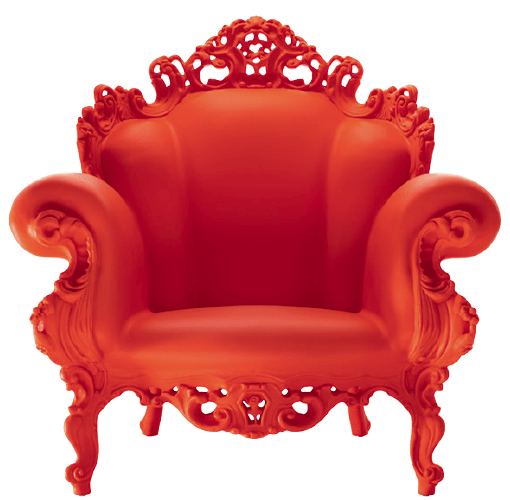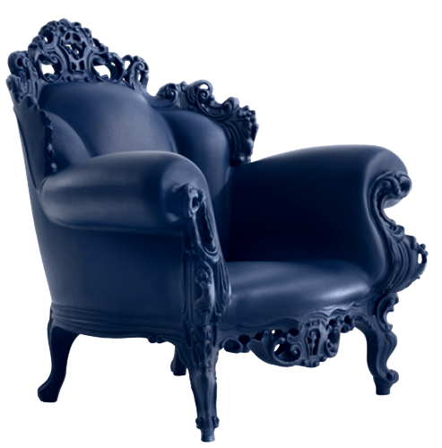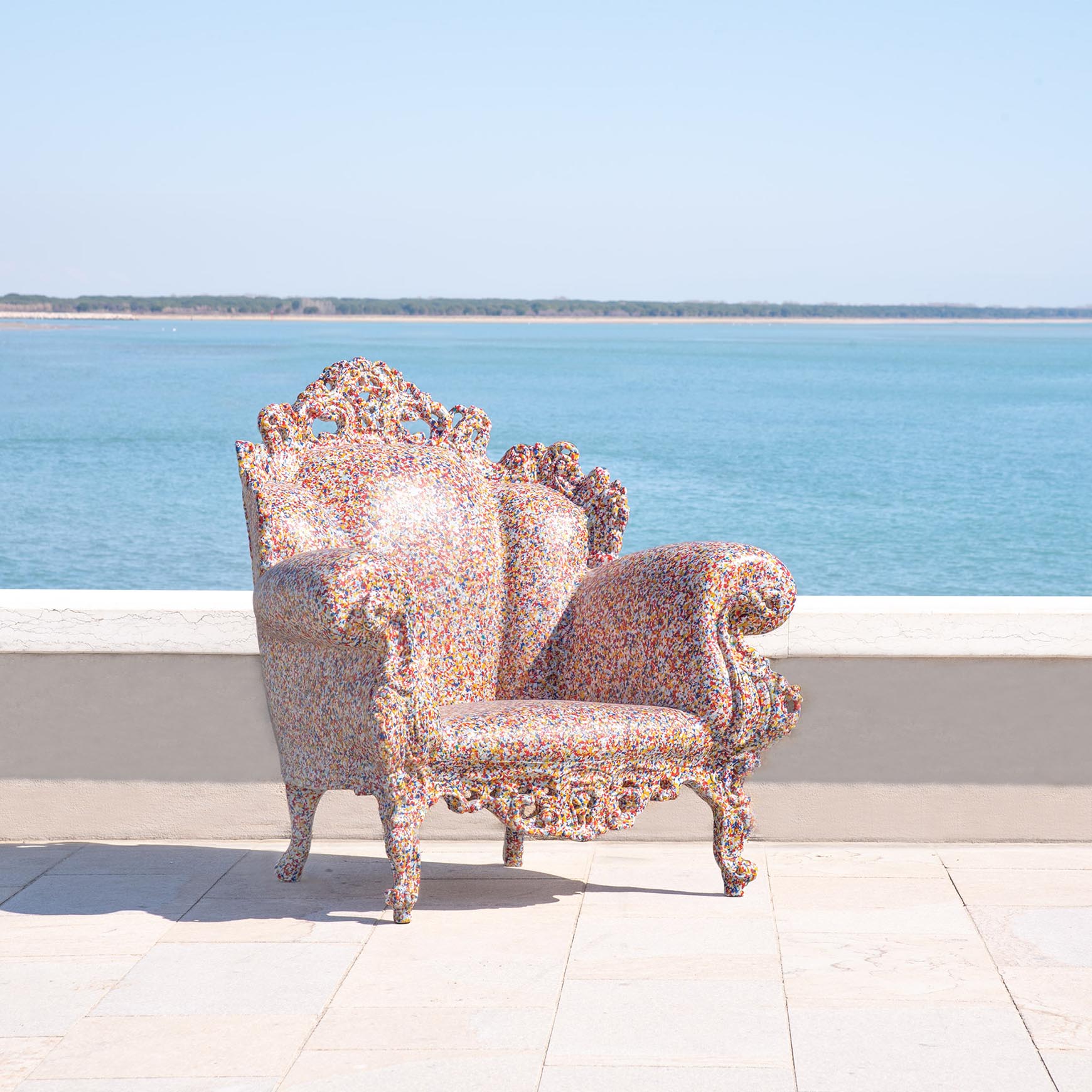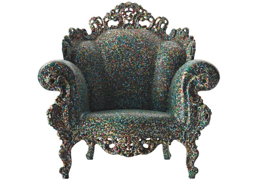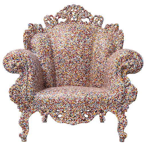 Proust is a romantic, baroque chair, on which an endless number of multi-coloured dots are hand-painted using the pointillism technique. These dots cover the whole armchair, both the fabric and the wooden decorations. It’ s a re-design work. It is, in fact, a combination of a mock- antique armchair with a detail from a painting of a garden by French artist Signac. From 1978 onwards, the "Proust armchair” was produced in many versions, using different colours, materials and dimensions, and was even made of ceramics and bronze. It travelled all around the world and was hosted in many museums.