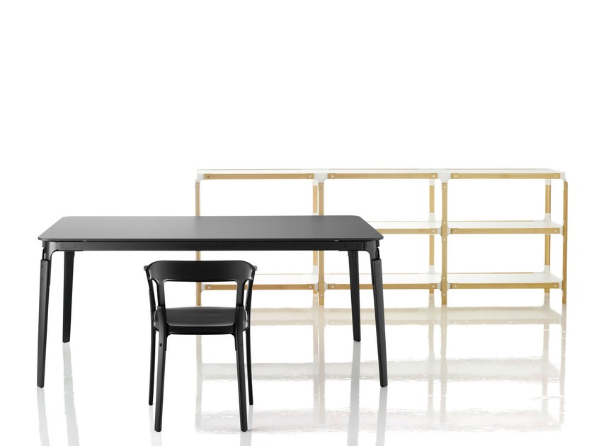 The table is available upon order in different dimensions, in rectangular, squared and round shape. The legs are in solid wood natural or painted black and the top in white or black HPL.
