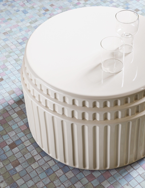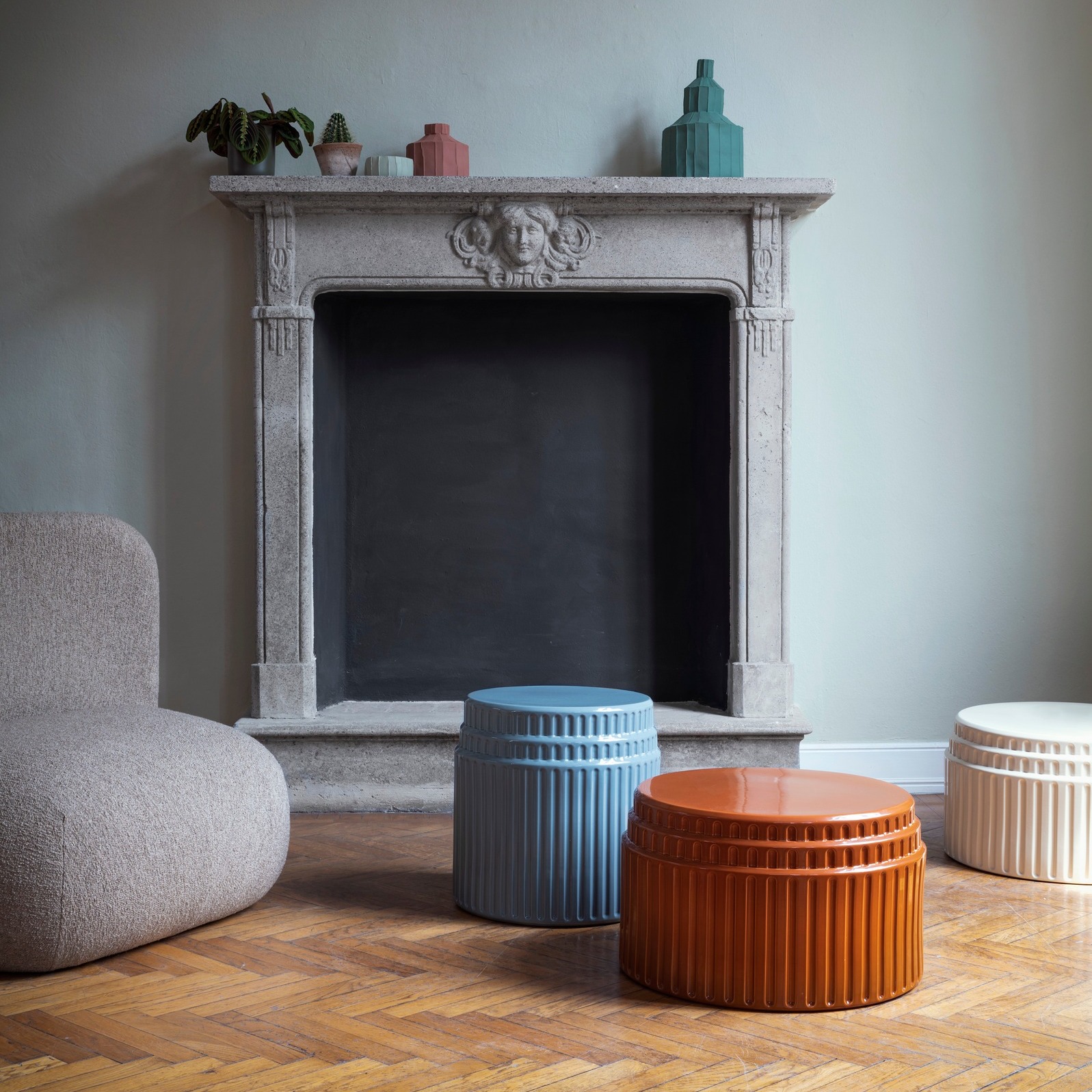 Kolos is formed in a plaster mould in a pottery where craftsmen apply the glaze and then fire the table. Although shiny and polished to the touch, the material it is made of is evident. The corners absorb less color and become paler while the pigments are concentrated in the rounded areas, making them darker. Kolos therefore forms a highly decorative side table, combining its function as a furnishing accessory with an artistic value to form a showpiece.