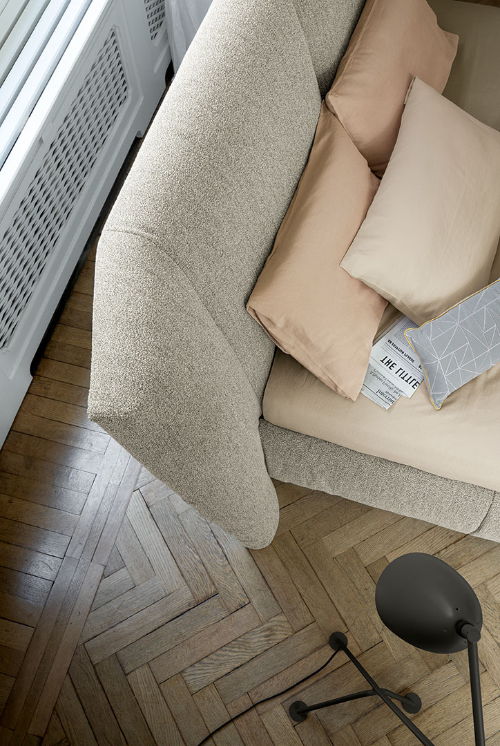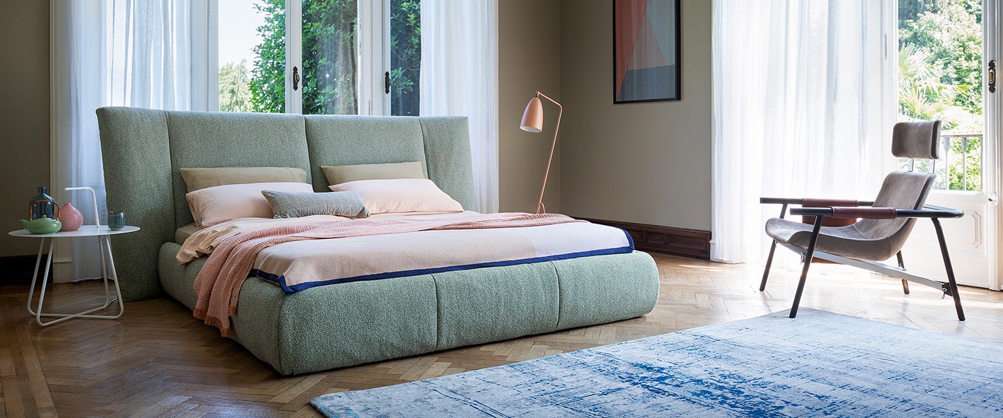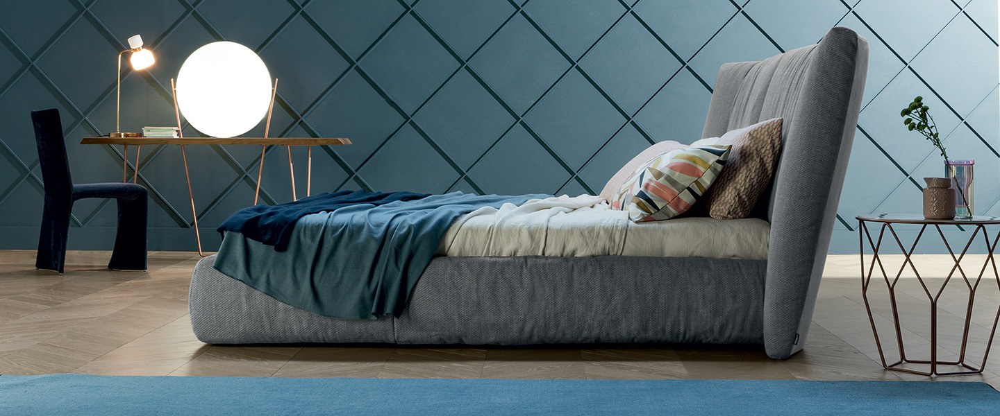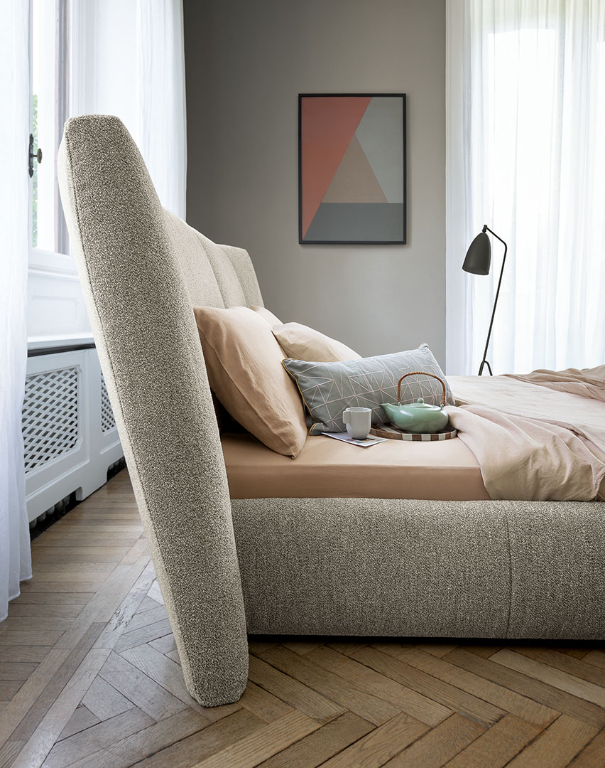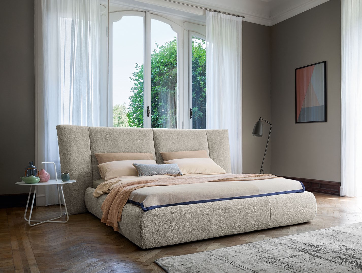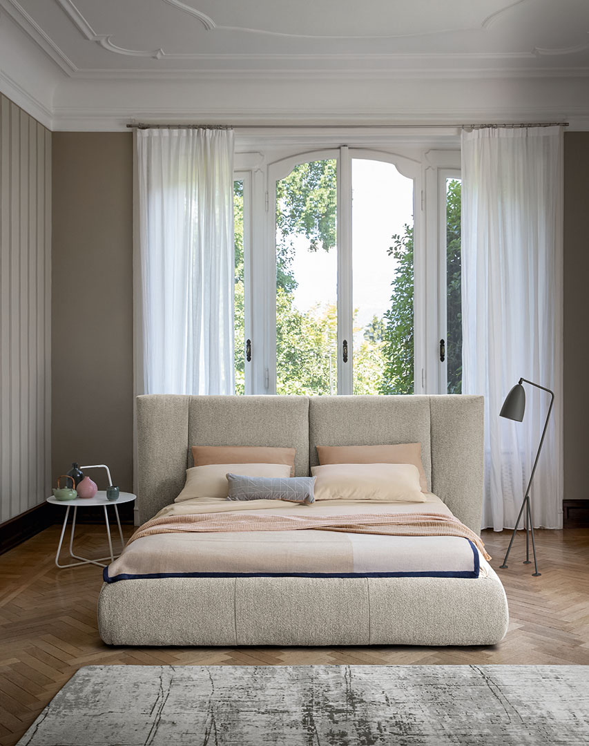 A high, padded headboard that, at the edges, delicately folds inwards like a screen. The structure contributes to a visual effect of great comfort: Youniverse is a double bed with a dreamy, romantic character, which leaves the maximum space to the user and their dreams. Designed and made with great artisan skill, it is distinguished by the large volumes of the headboard and the vertical stitches that elegantly decorate it. Youniverse is available with cover in leather, eco-leather or in fabric, removable in all three versions. In the Youniverse open version, the practical storage enables precious additional space to be gained for storing covers, cushions and everything necessary for the bedroom.