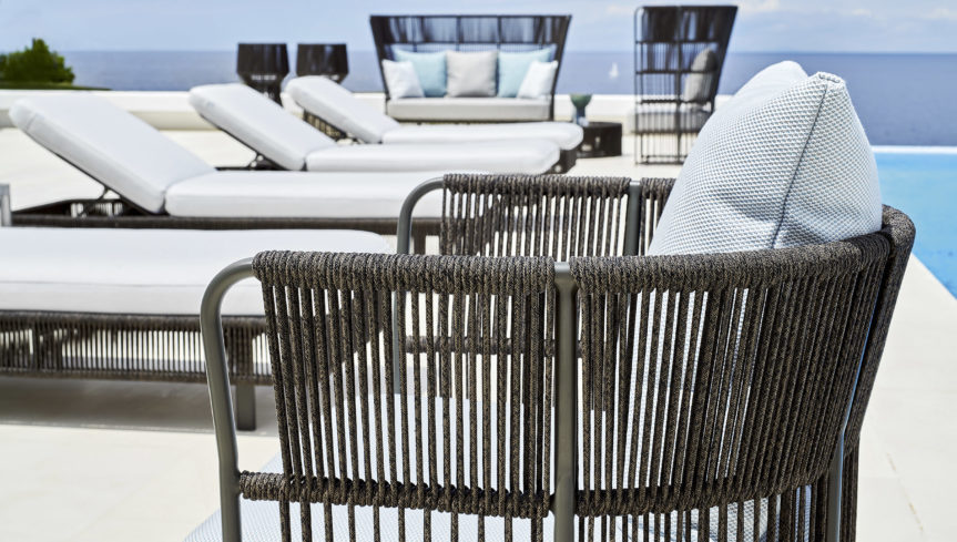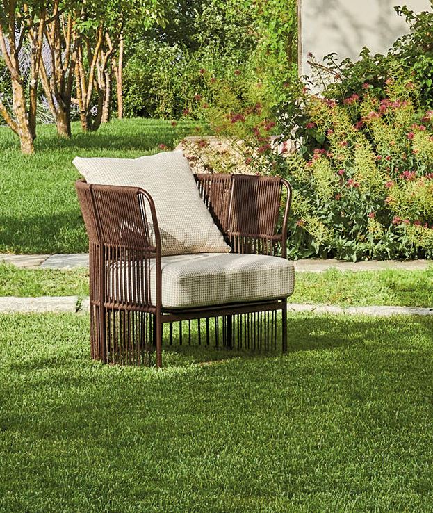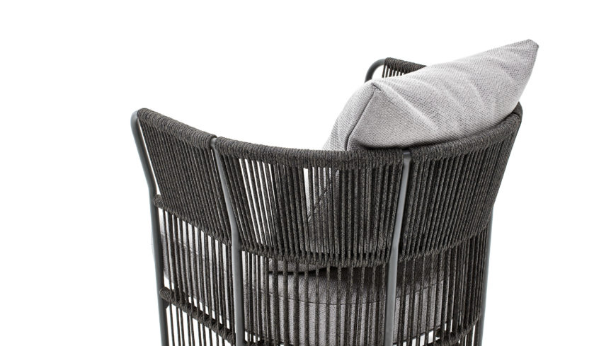 A harmonious intertwining adorns the aluminum structure of the Tibidabo armchair with vertical lines. Between one rope and the other, the air moves lightly, as it does in the branches of trees. Whether in the garden, by the pool or in the lounge area of a restaurant in the center, you can fully enjoy the beautiful days on your comfortable seat, spending moments of pure relaxation. Suitable for outdoor use. Weatherproof and UV light resistant structure. Suitable also for marine areas.