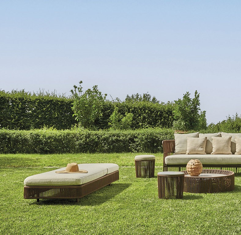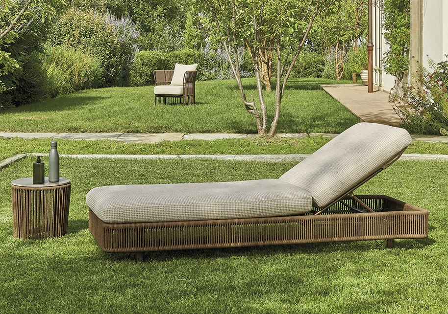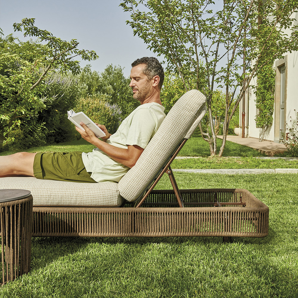 The elegant and sober design of the Tibidabo sunbed is designed to harmonize with different types of environment, from the home garden to the hotel terrace. A few simple elements to give shape to outdoor comfort: from the large cushion to the adjustable backrest. All embellished with a weaving in synthetic rope that outlines the profile of the painted aluminum structure.