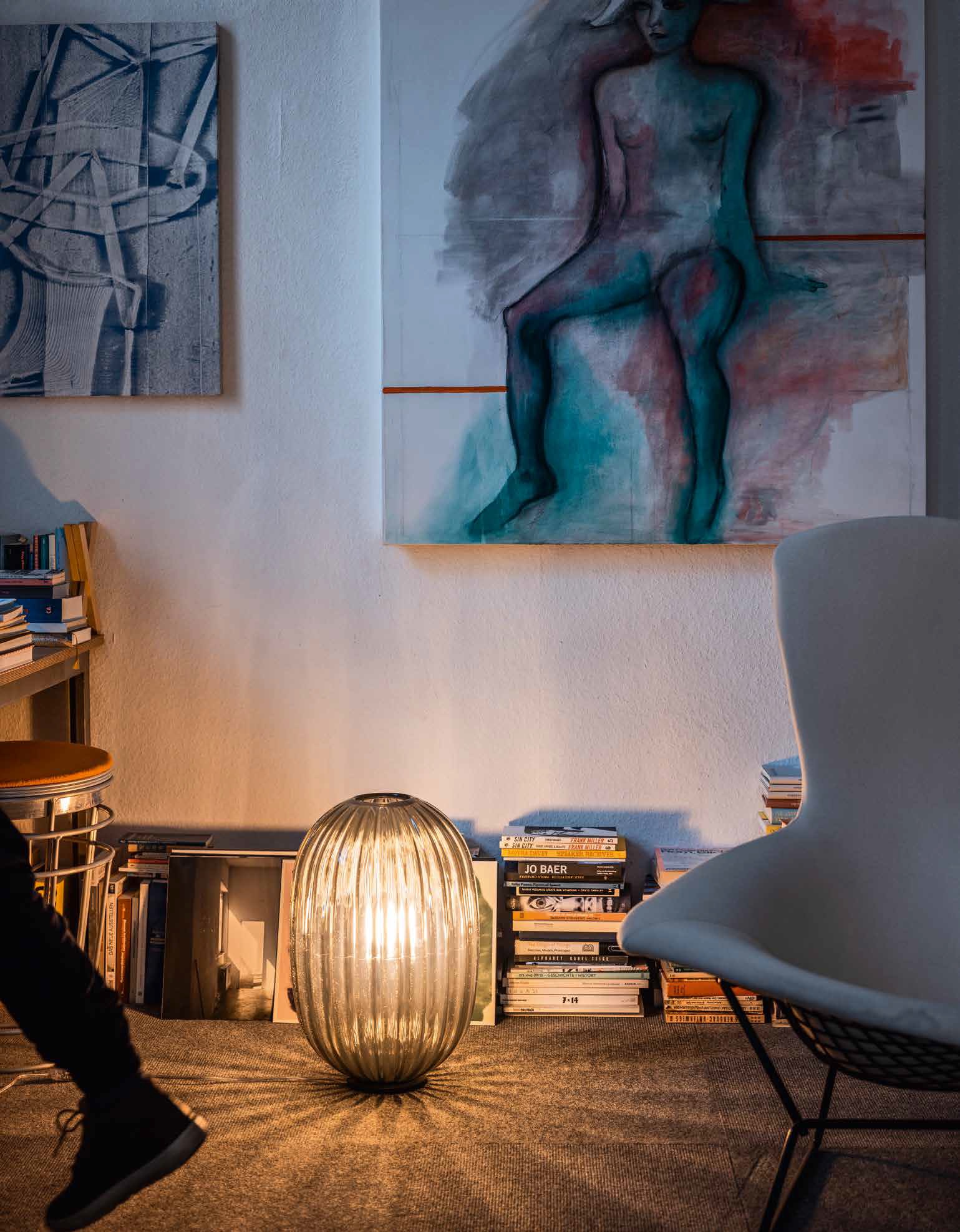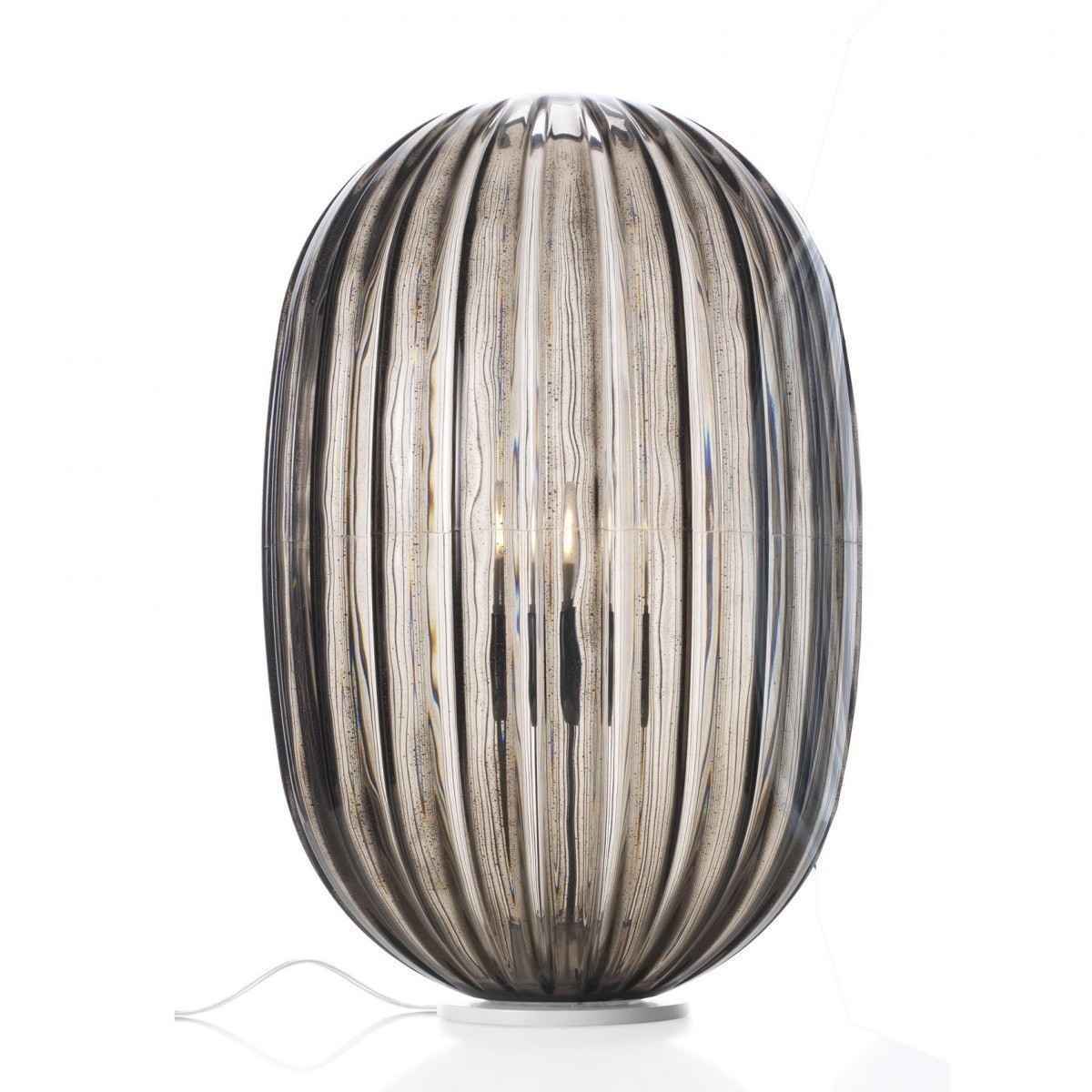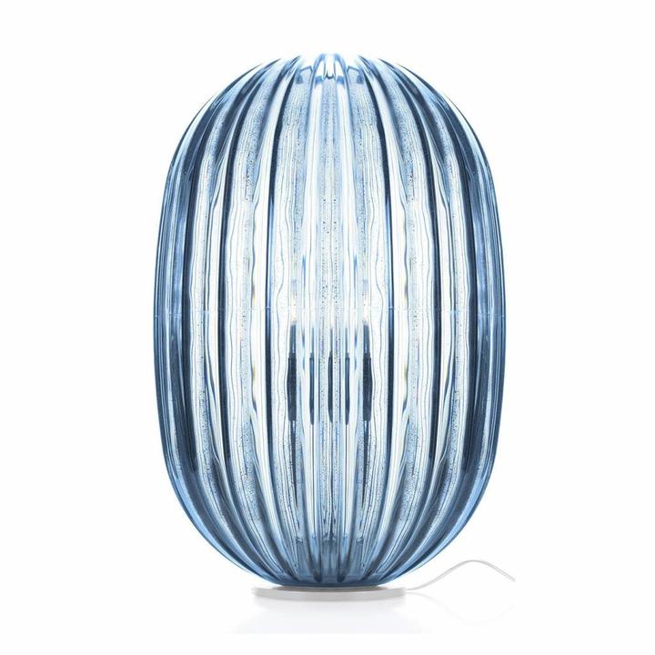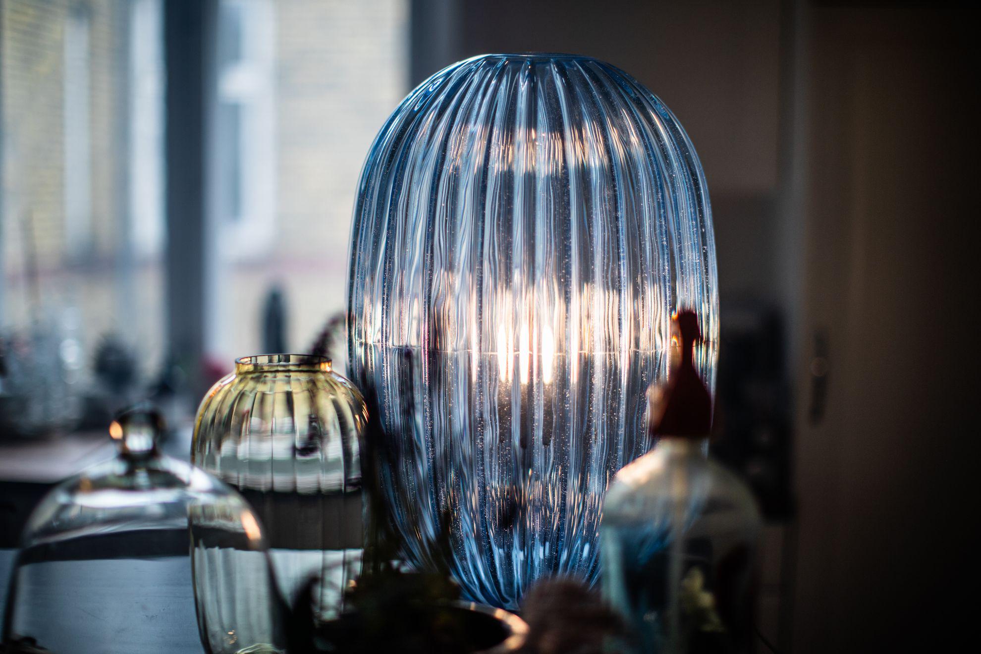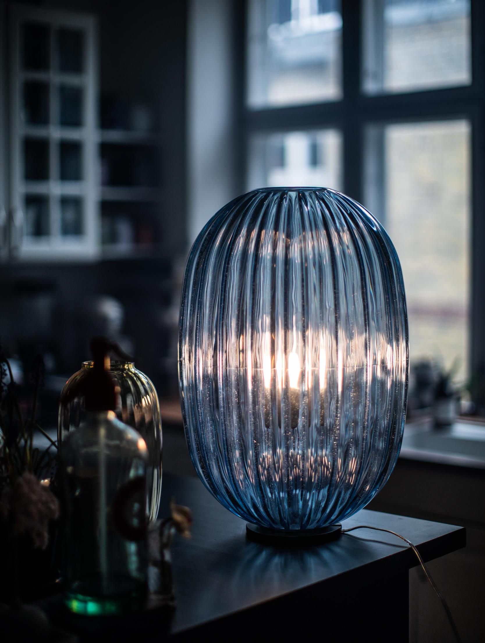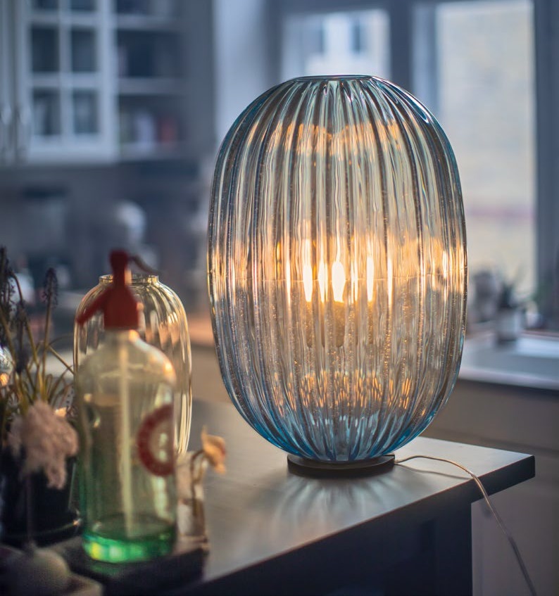 The design of the Plass table lamp recalls a pearl of ground glass, creating kaleidoscopic lighting effects onto the surface beneath it and its surroundings.