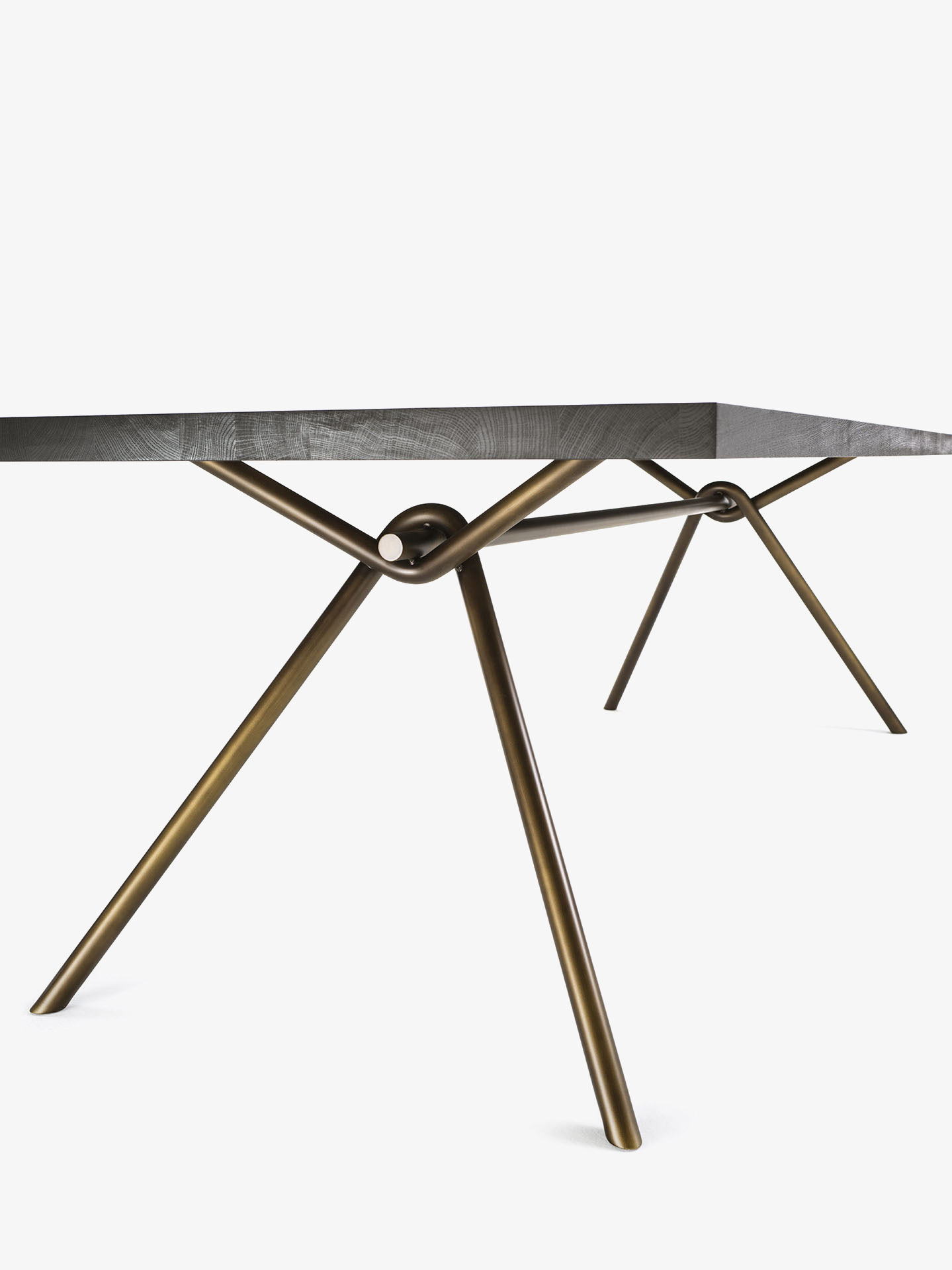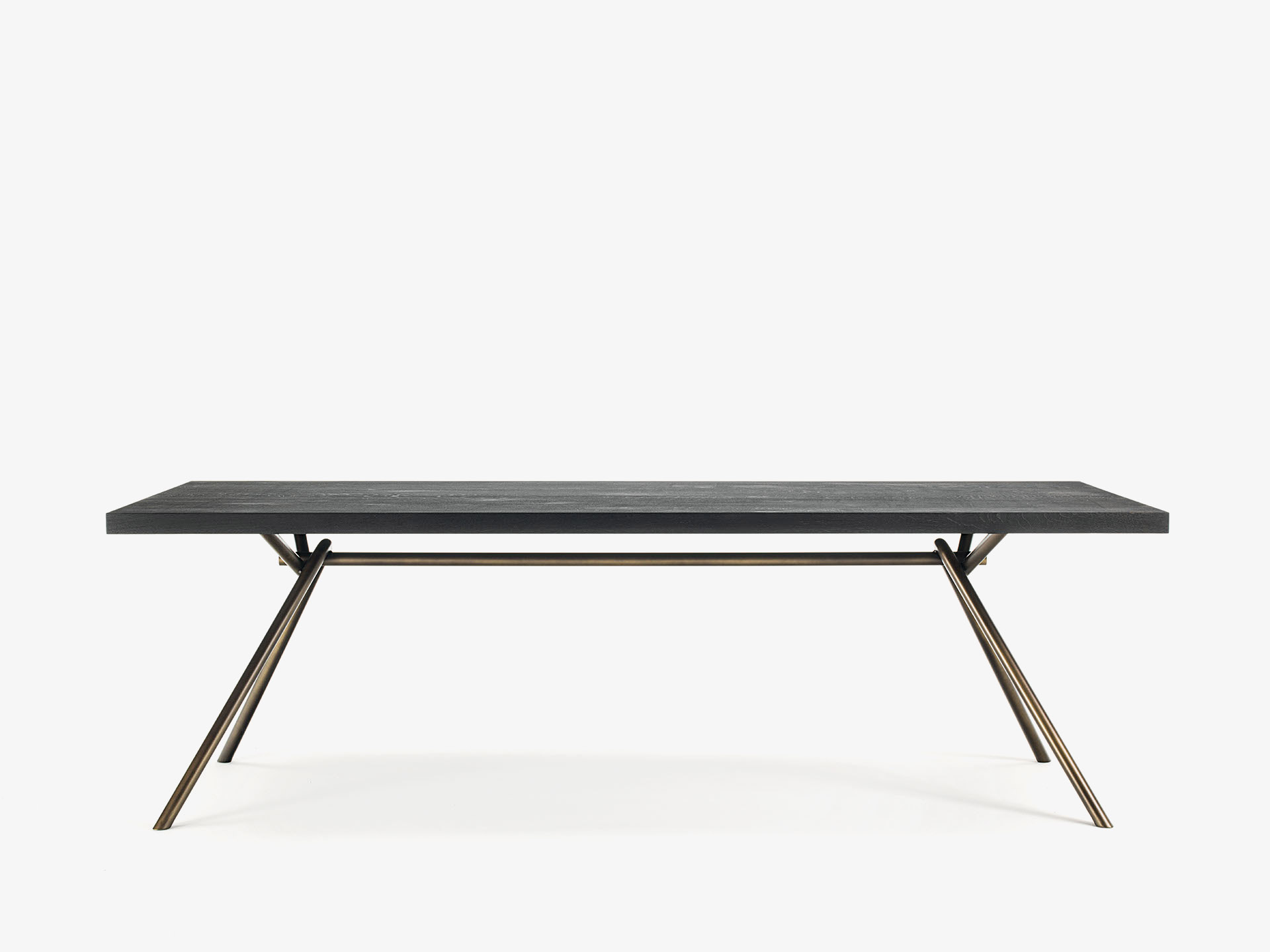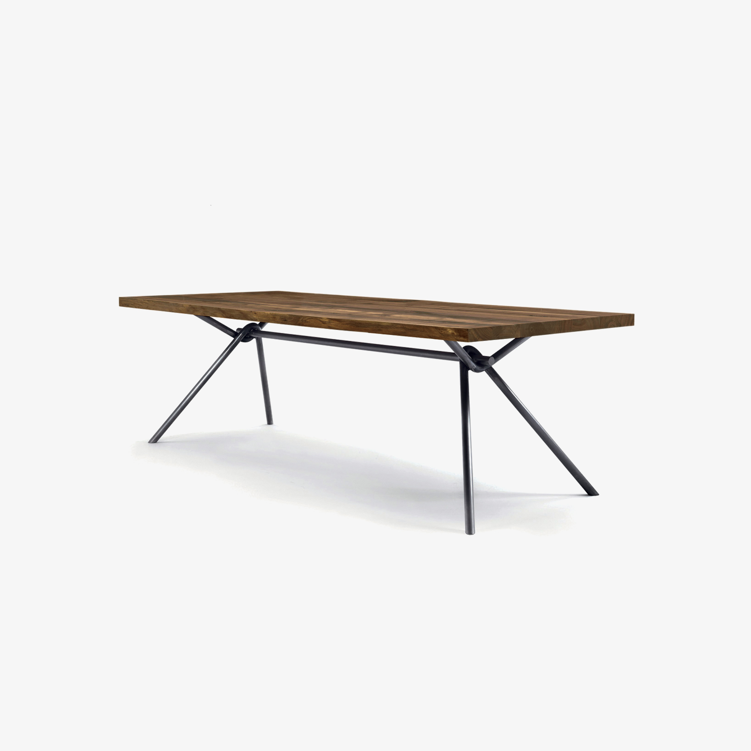 Table with top in glued solid wood lists, with straight sides, combined with a basic and linear base made of intertwined tubular iron, empty inside. Upon request available in intertwined full tubular iron.