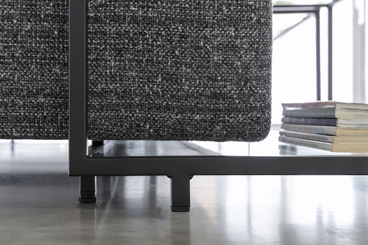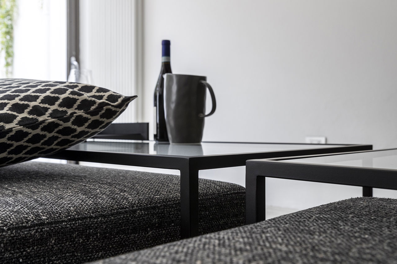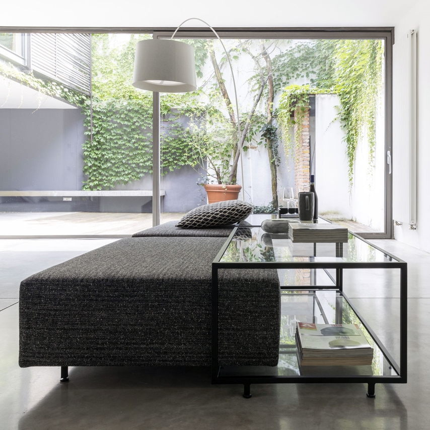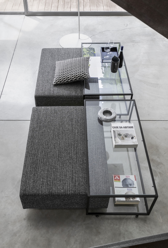 Zoom pouf is padded with removable cover, with coffee table with metal structure available in patinated bronze or black painted finishes complete of transparent glass top. A timeless classic, ideal in the living area as a seat and at the same time as a coffee table.