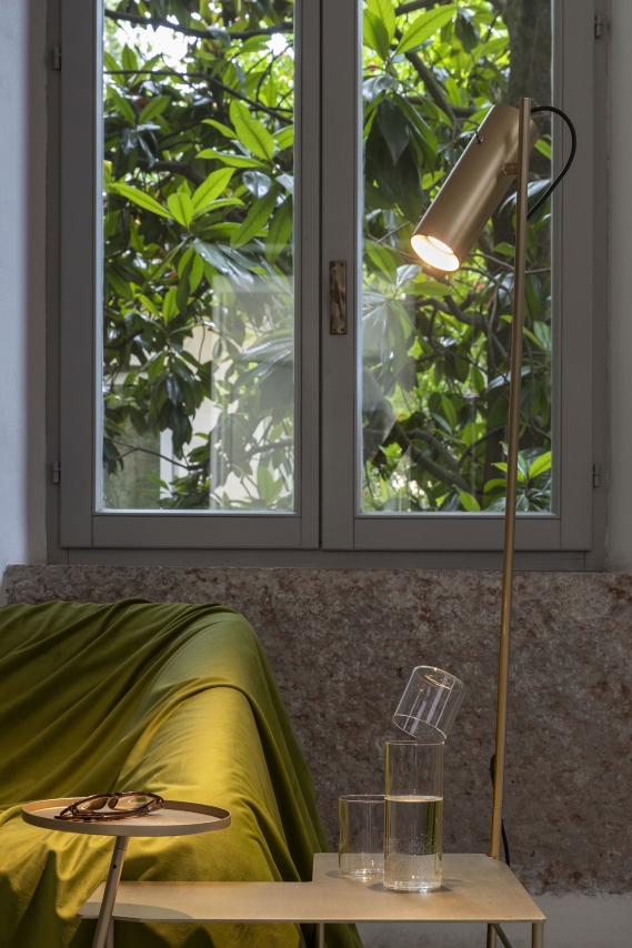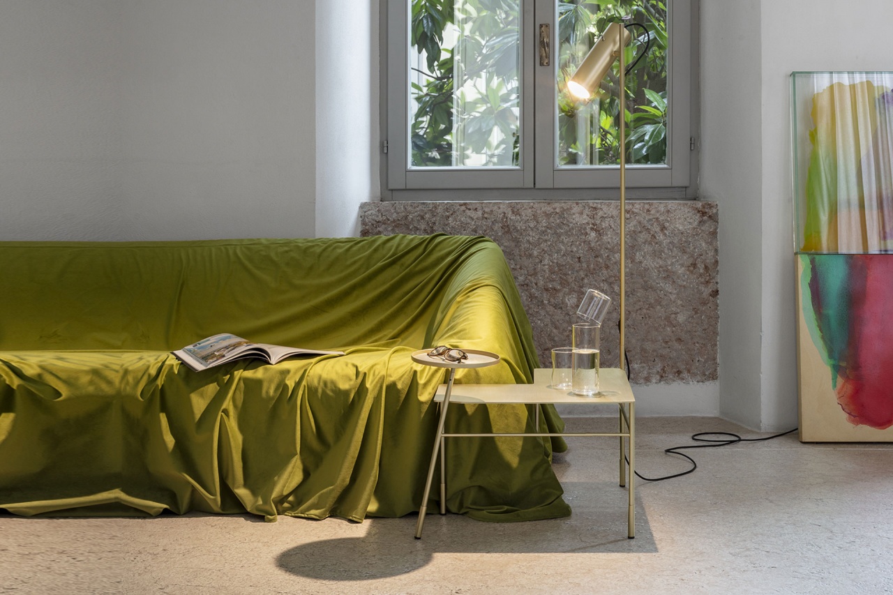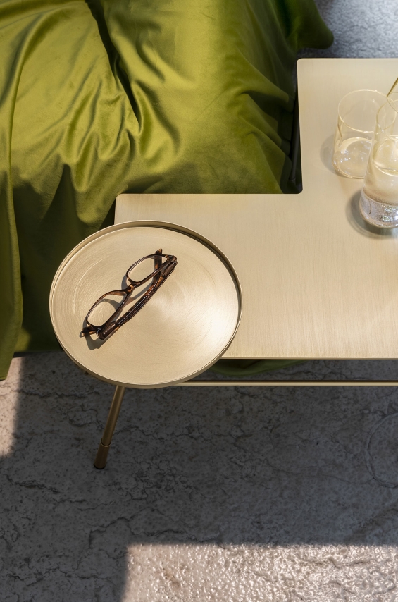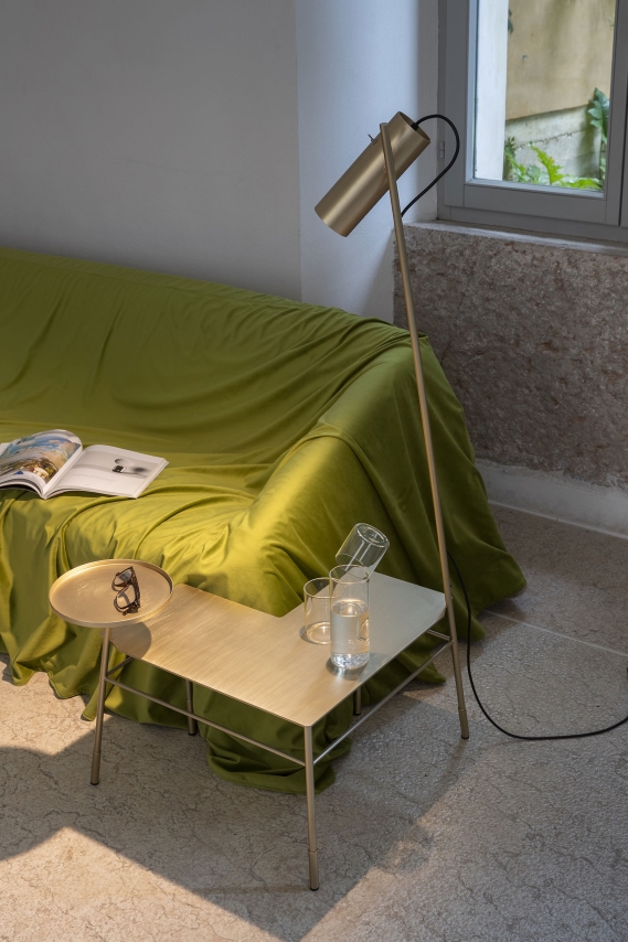 Dase is a corner metal coffee table with lamp and tray. Available painted black or satin brass. With an elegant and light design, very functional close to sofas or armchairs. A single object solves three functions: table top and, thanks to two of the legs that extend compared to the others, tray and lamp. The table with lamp can be positioned left or right.