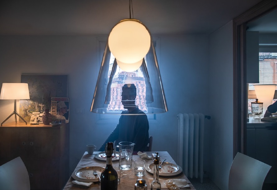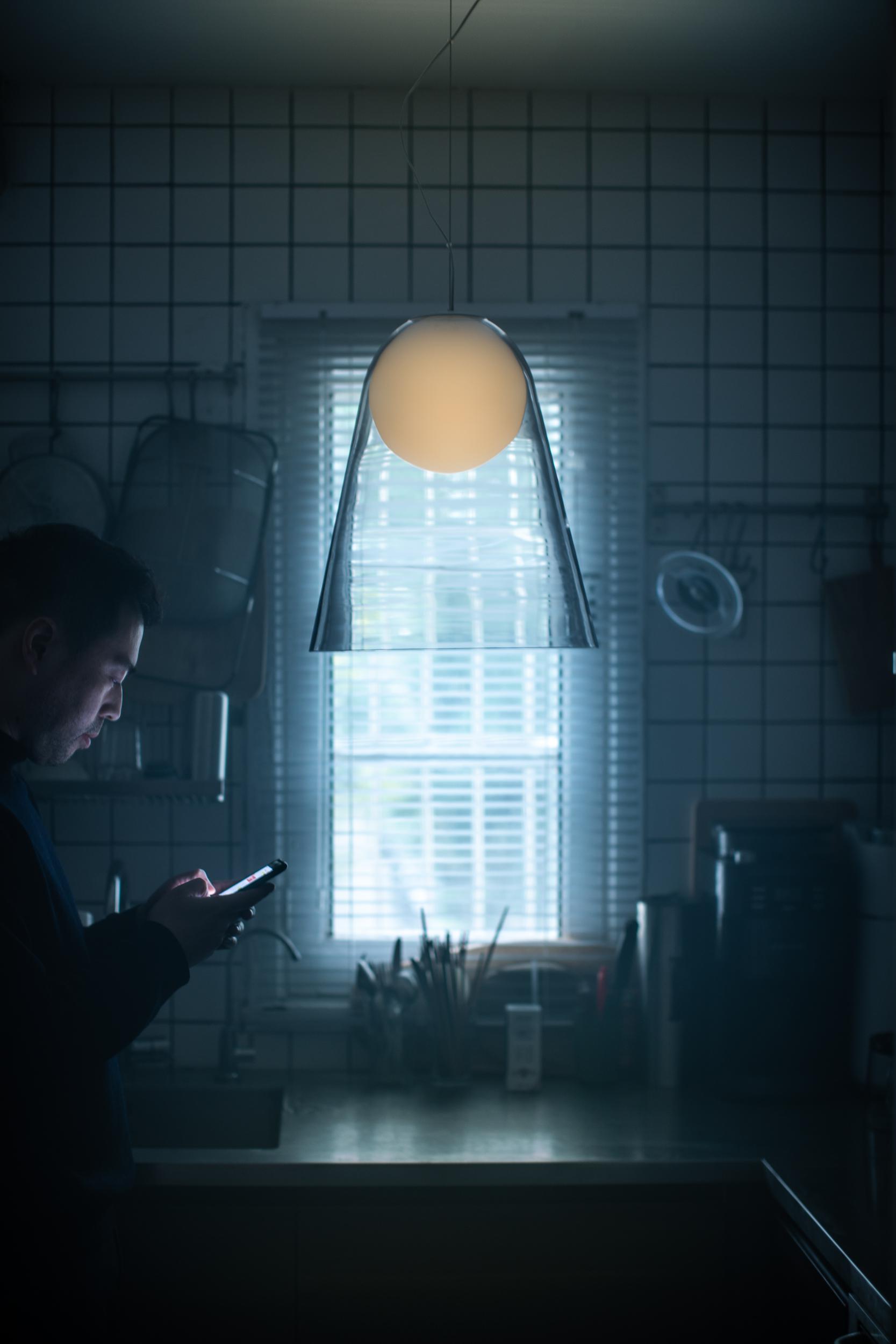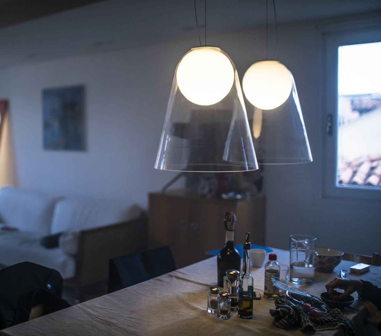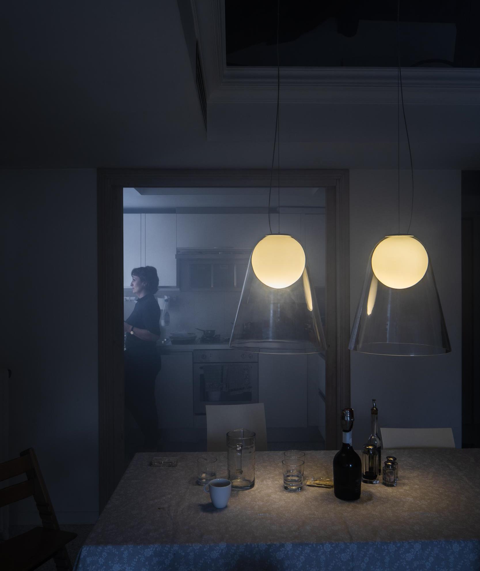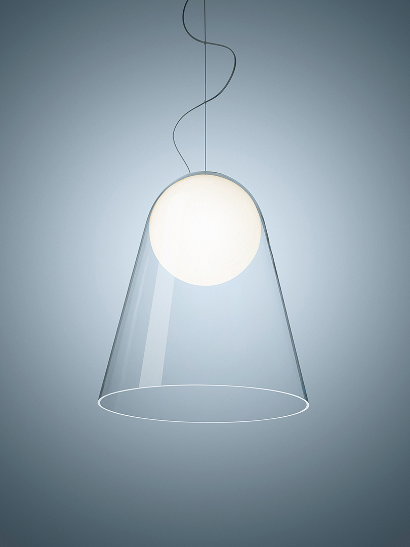 Like a moon suspended in mid-air, the Satellight suspension lamp boasts a poetic and surprising design, and it is entirely made of hand-blown glass.