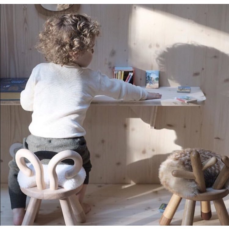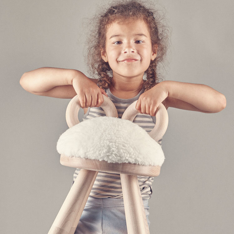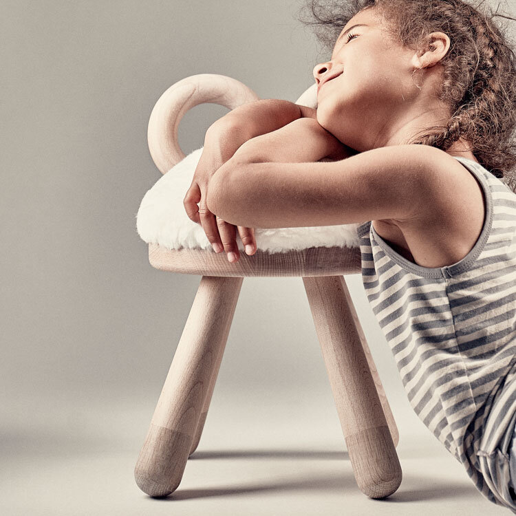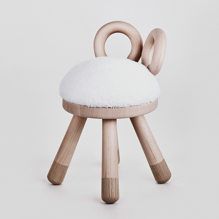 Sheep Chair is designed by the Japanese designer Takeshi Sawada. It is a playful piece of children's furniture, with a sculptural design, and a welcoming appearance. It is made in fine European beech wood, with feet in oak and a white fluffy seat made with faux sheep skin.