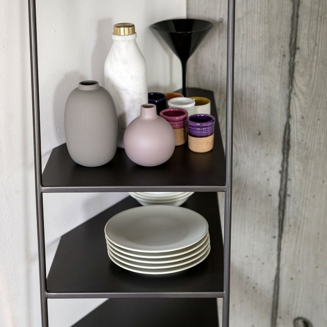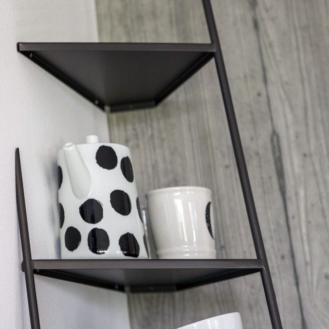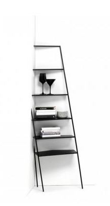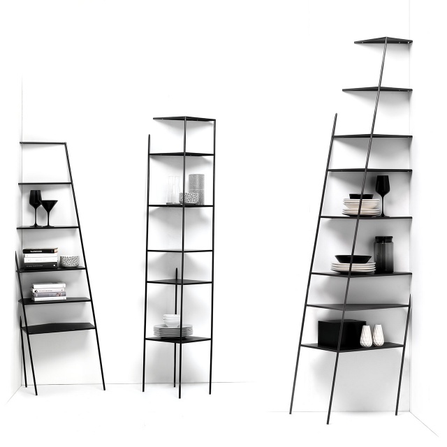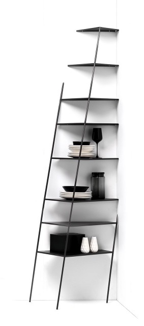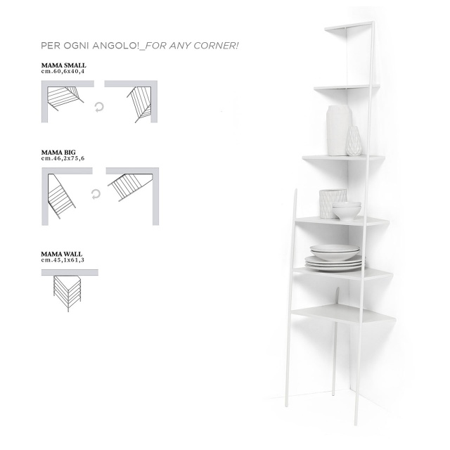 Mamà is a metal étagère available black or white. Mamà stands out for its ability to be almost invisible, resting on the wall and creating an optical illusion.