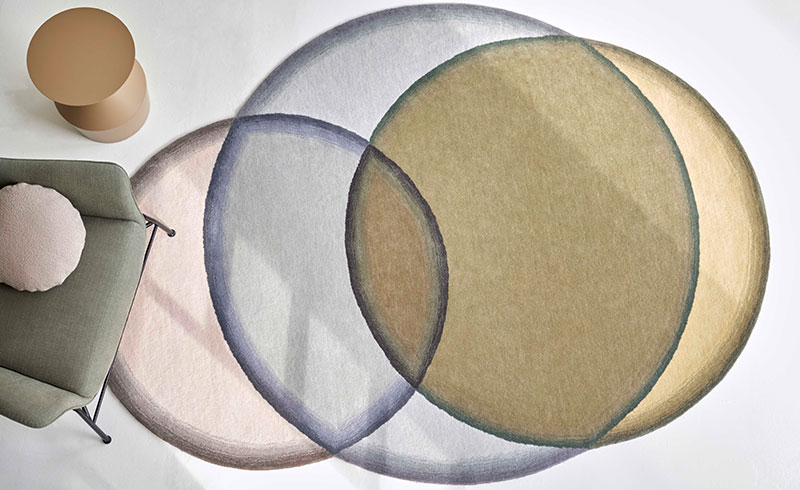 Charlotte Lancelot proposes with her new CRYSTAL collection a game for the visual perception of the observer. Coloured circles seem to overlap in motion creating a three dimensional illusion and making room for different colour gradients. This is how wool, thick and resistant, recreates the transparency of glass in a series available in three colour variants: Neutal, Red and Blue, in size 190x260cm.