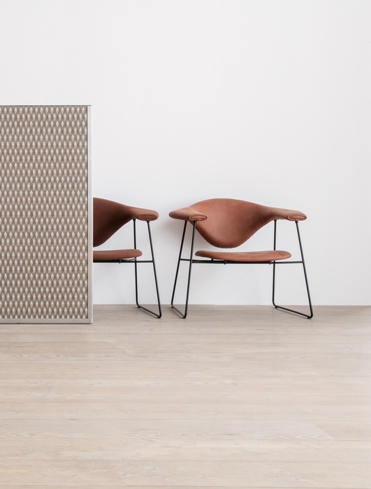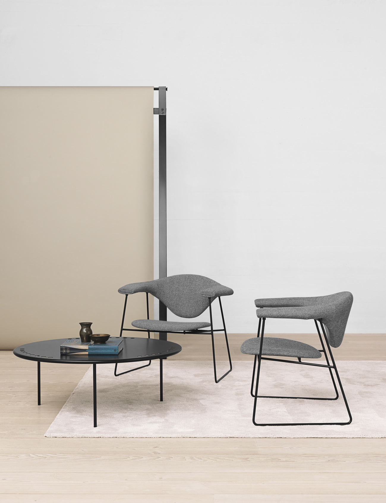 Designed for the fine dining restaurant Copenhague at Maison du Danemark in Paris, the Masculo Lounge Chair marries the idea of Danish elegance and simplicity with Italian refinement and playfulness. The backrest of Masculo is almost overly large, which call to mind a bull and is supported by the slender wooden legs that make the whole chair almost sculptural and exciting to the eye. The upholstered chair ensures a high level of comfort.