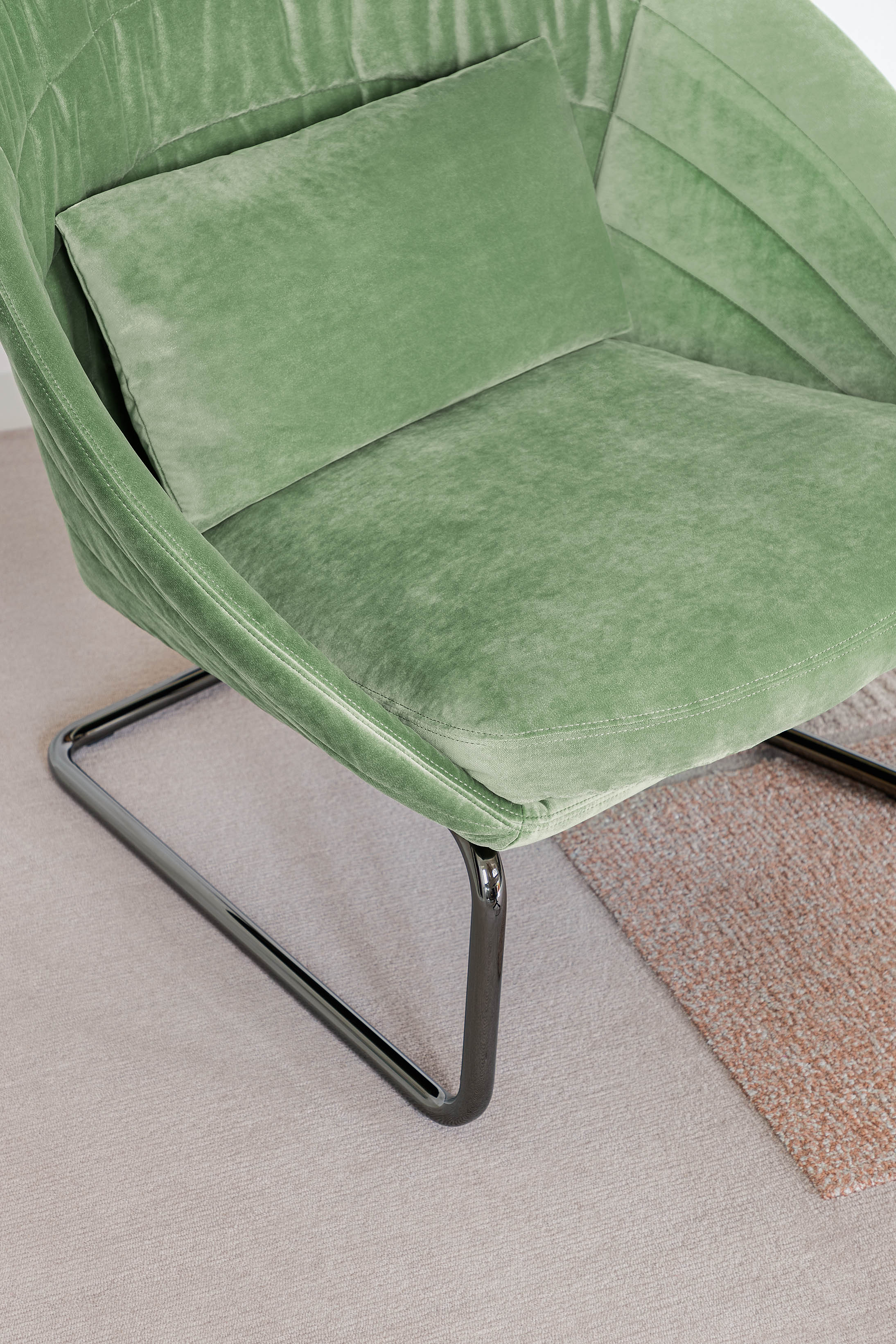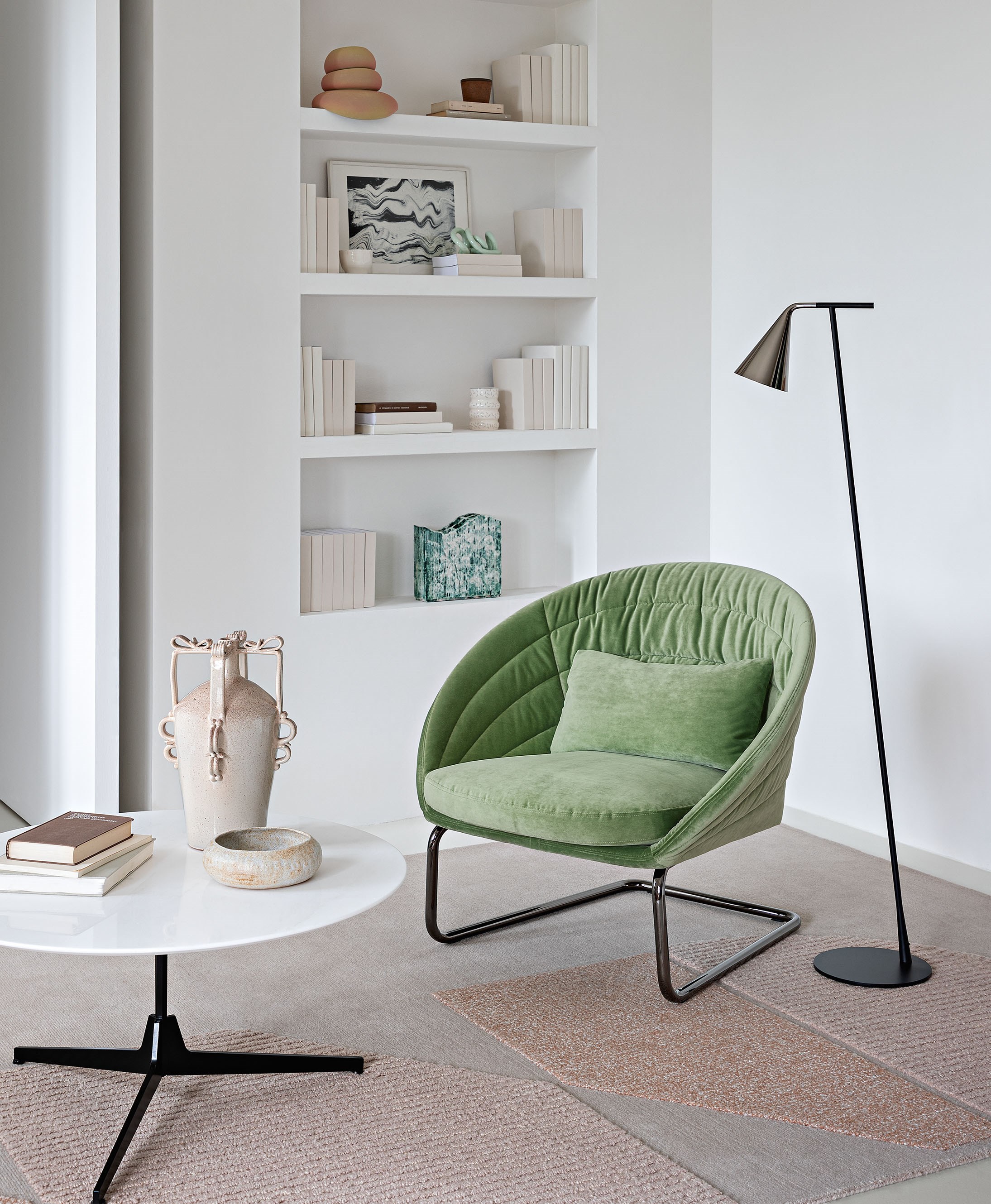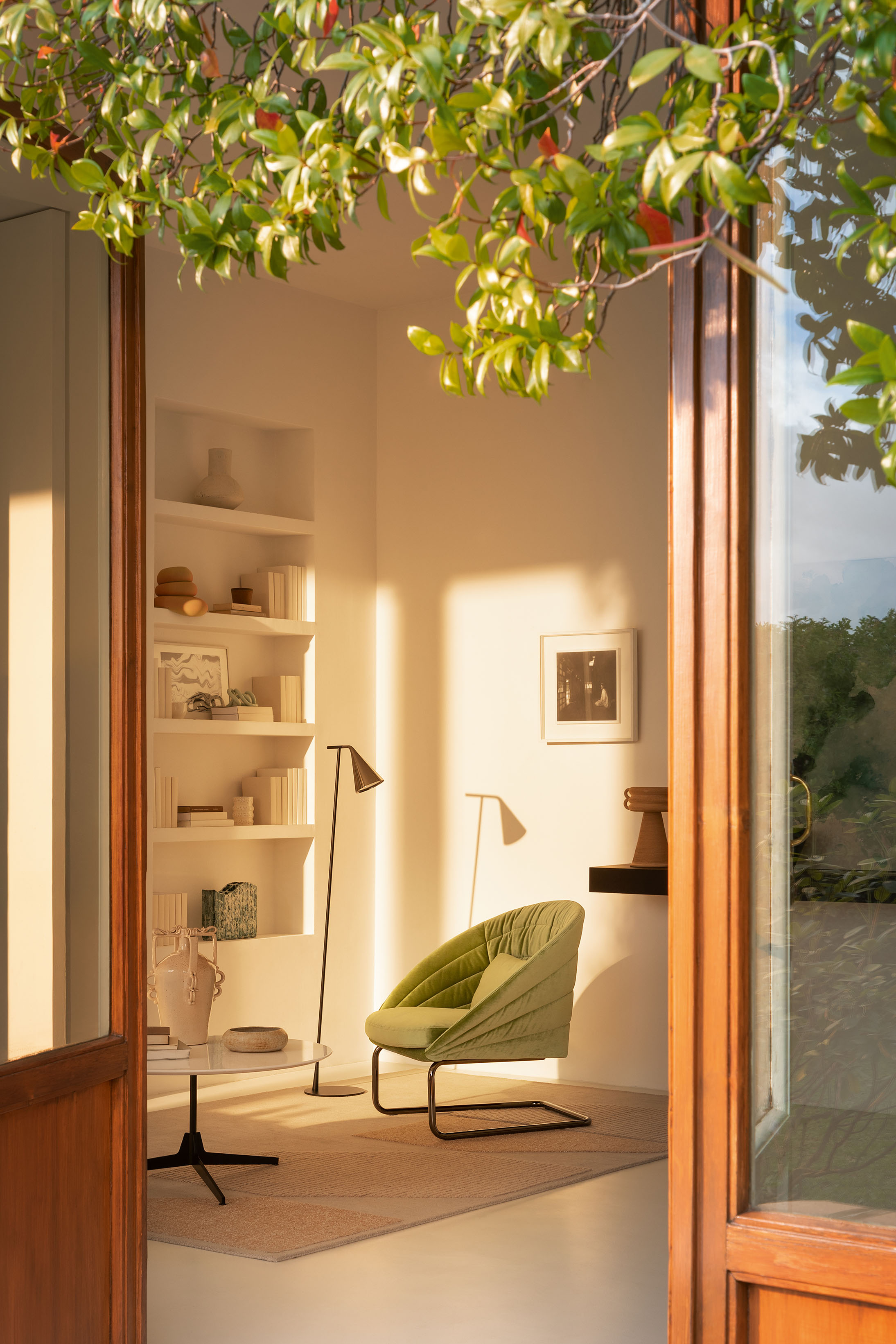The Fleur armchair , designer S.Bicego, is inspired by the grace of a flower, redesigning the iconic cantilever and softening the steel structure. While respecting the functionality of the classic cantilever, ensuring the suspension and flexibility, they stand out from current designs for their romantic allure and cocooning effect. The Fleur armchair is unmistakable for its shape and finish, versatile and suitable in any fully relaxing environment.