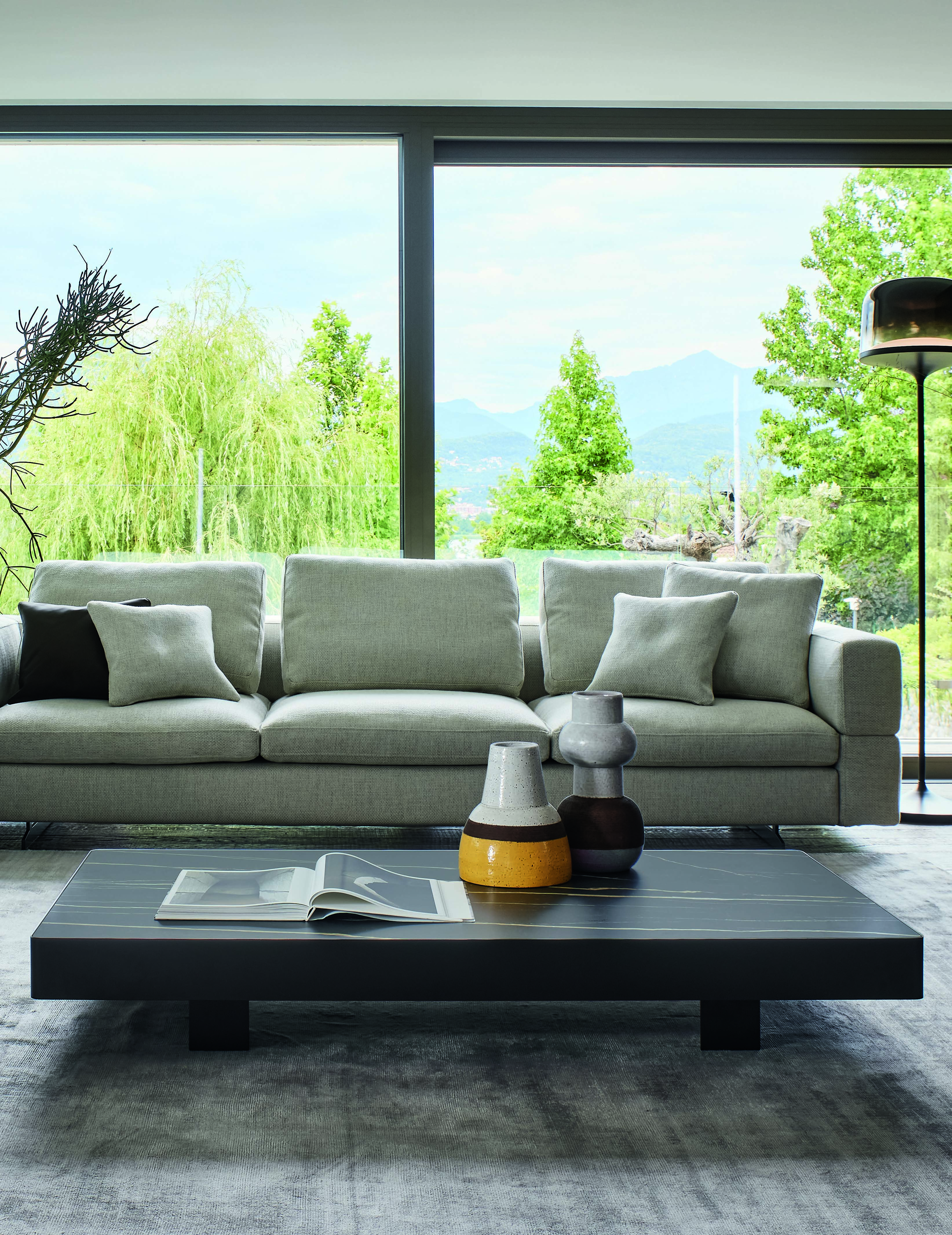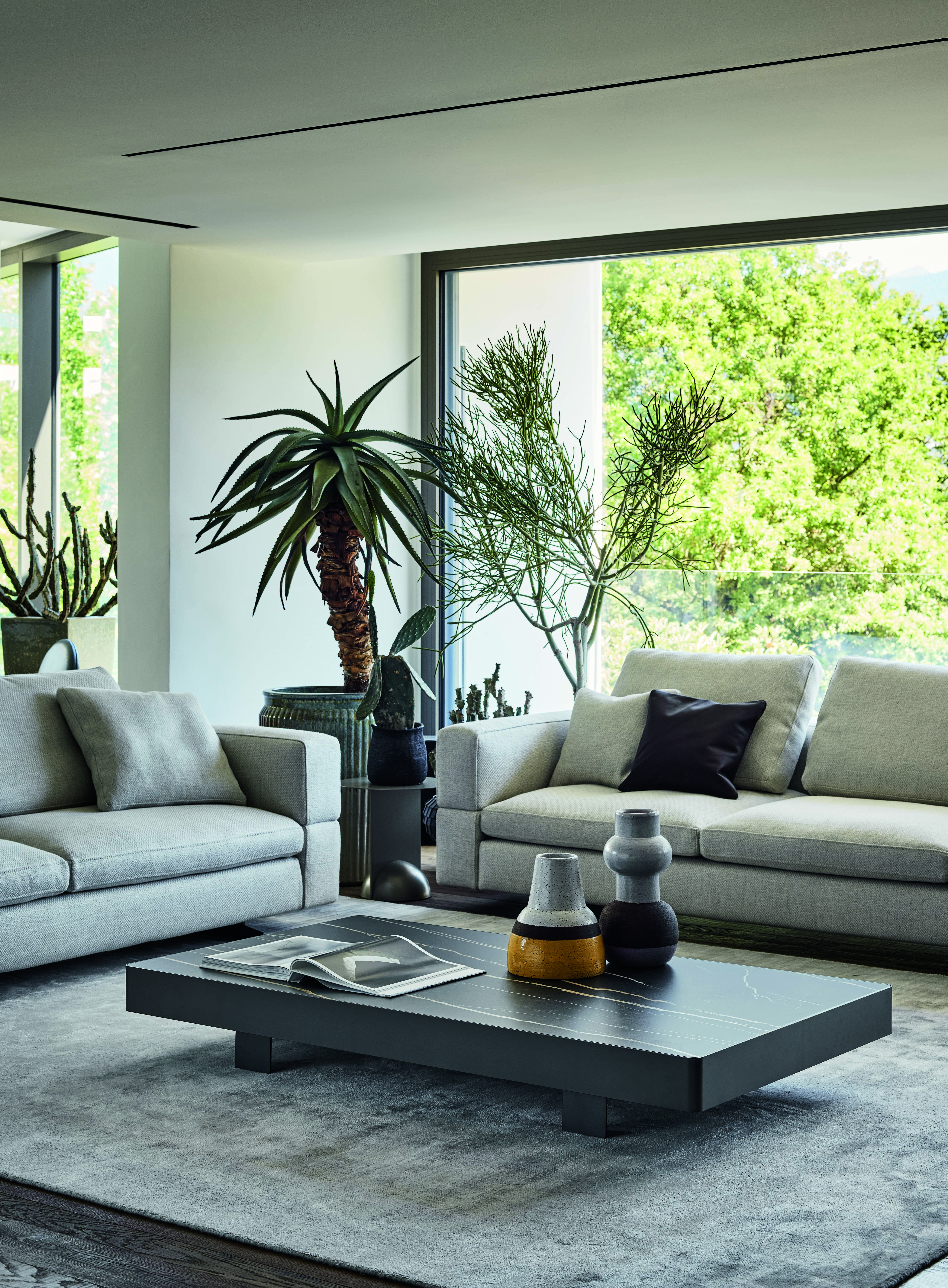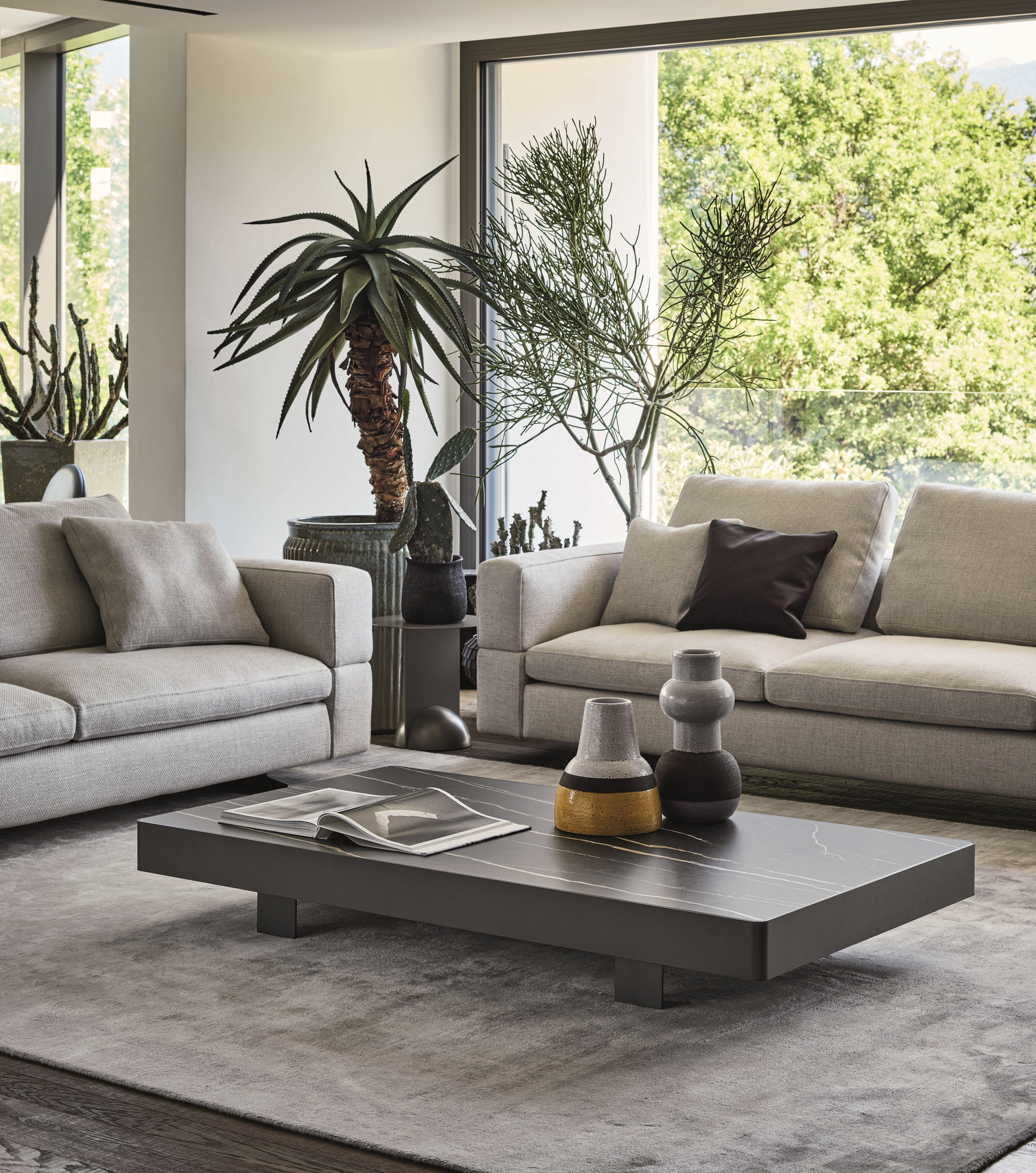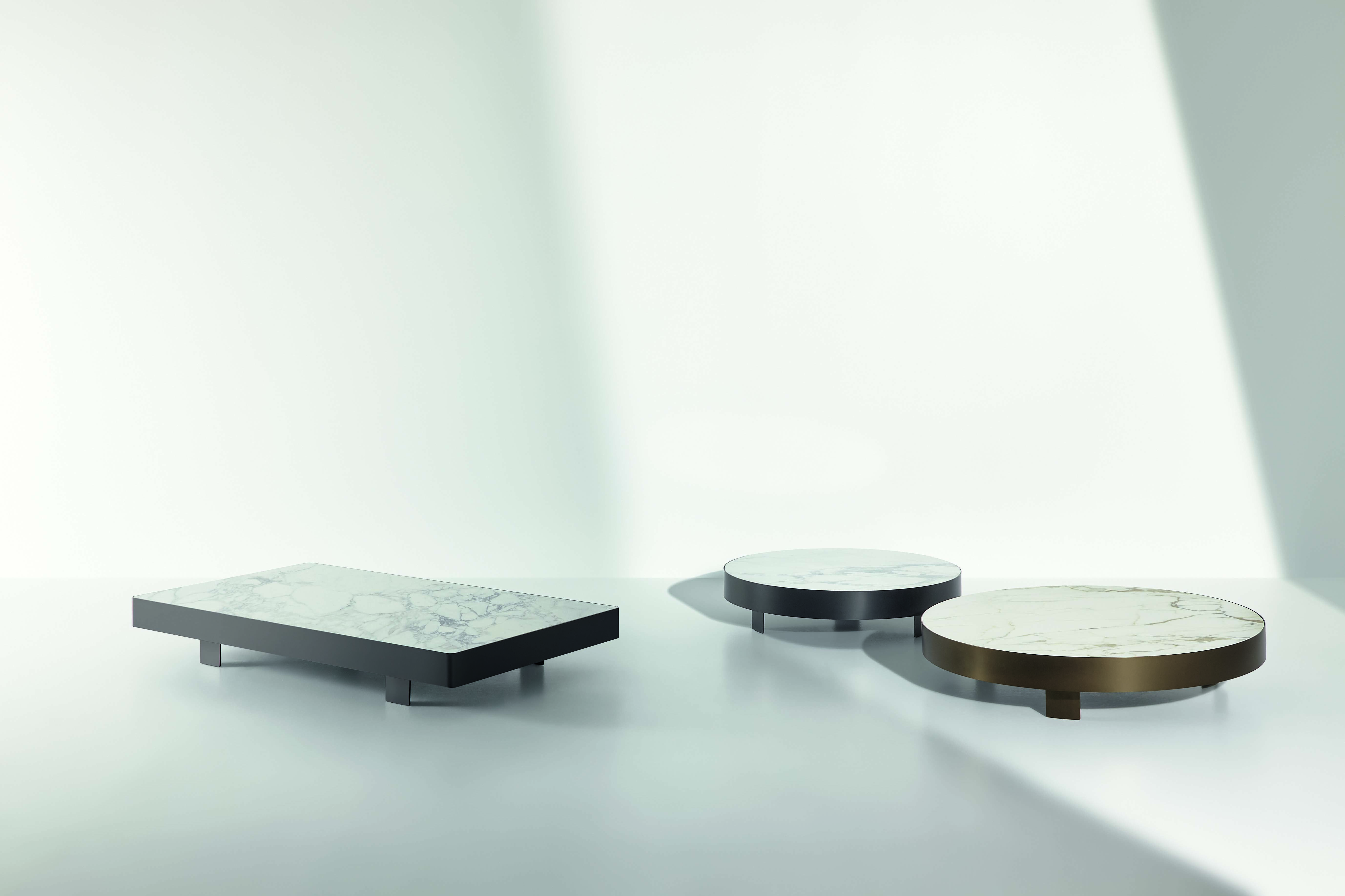 The Jazz coffee tables feature a formal linear design, are almost at floor level, slightly raised on metal feet with a highly geometric shape. The imposing table top, available in glass or ceramic, is outlined by a metal edge which contrasts with the almost invisible base. Available in a rectangular or round version.