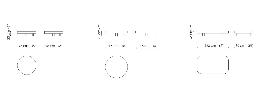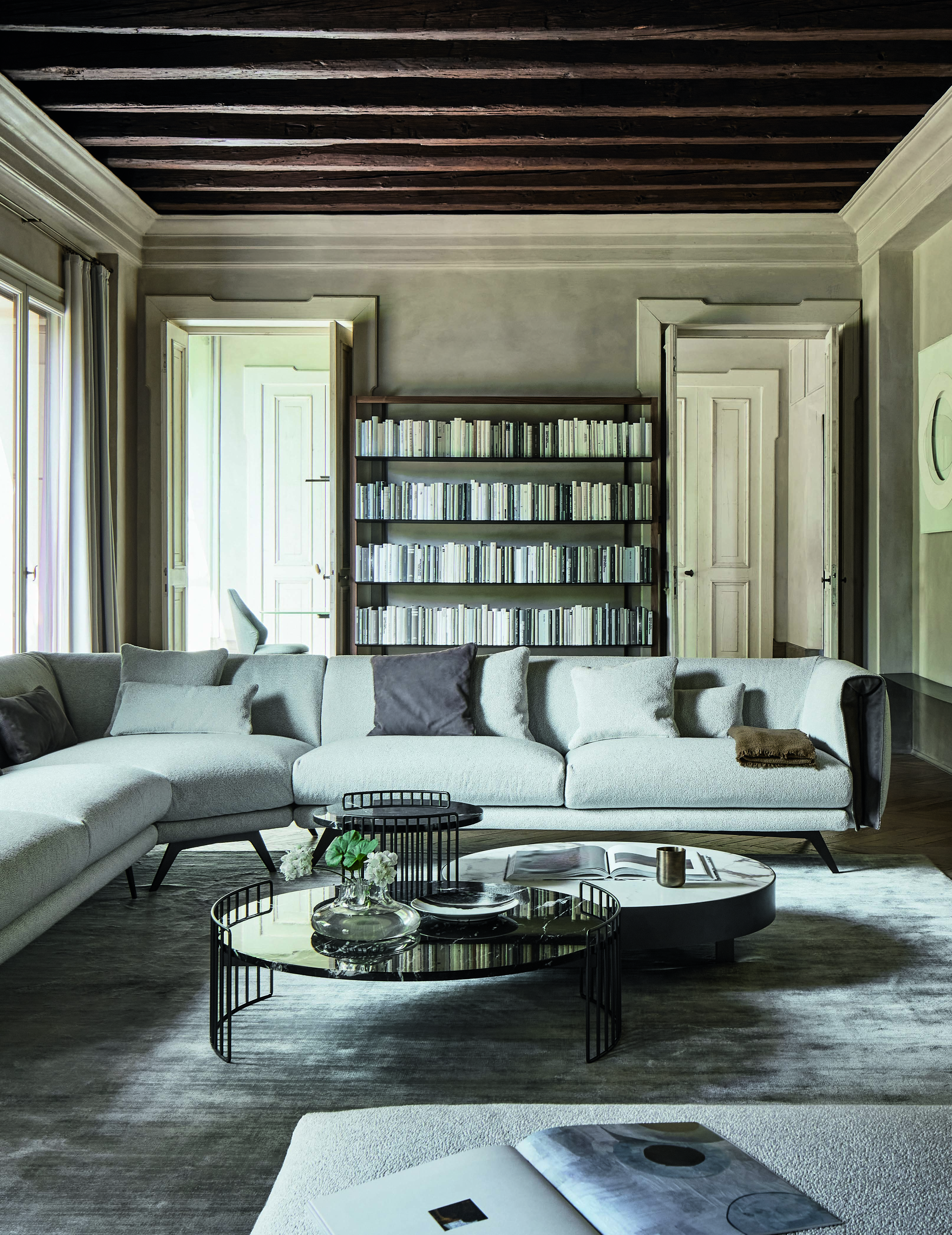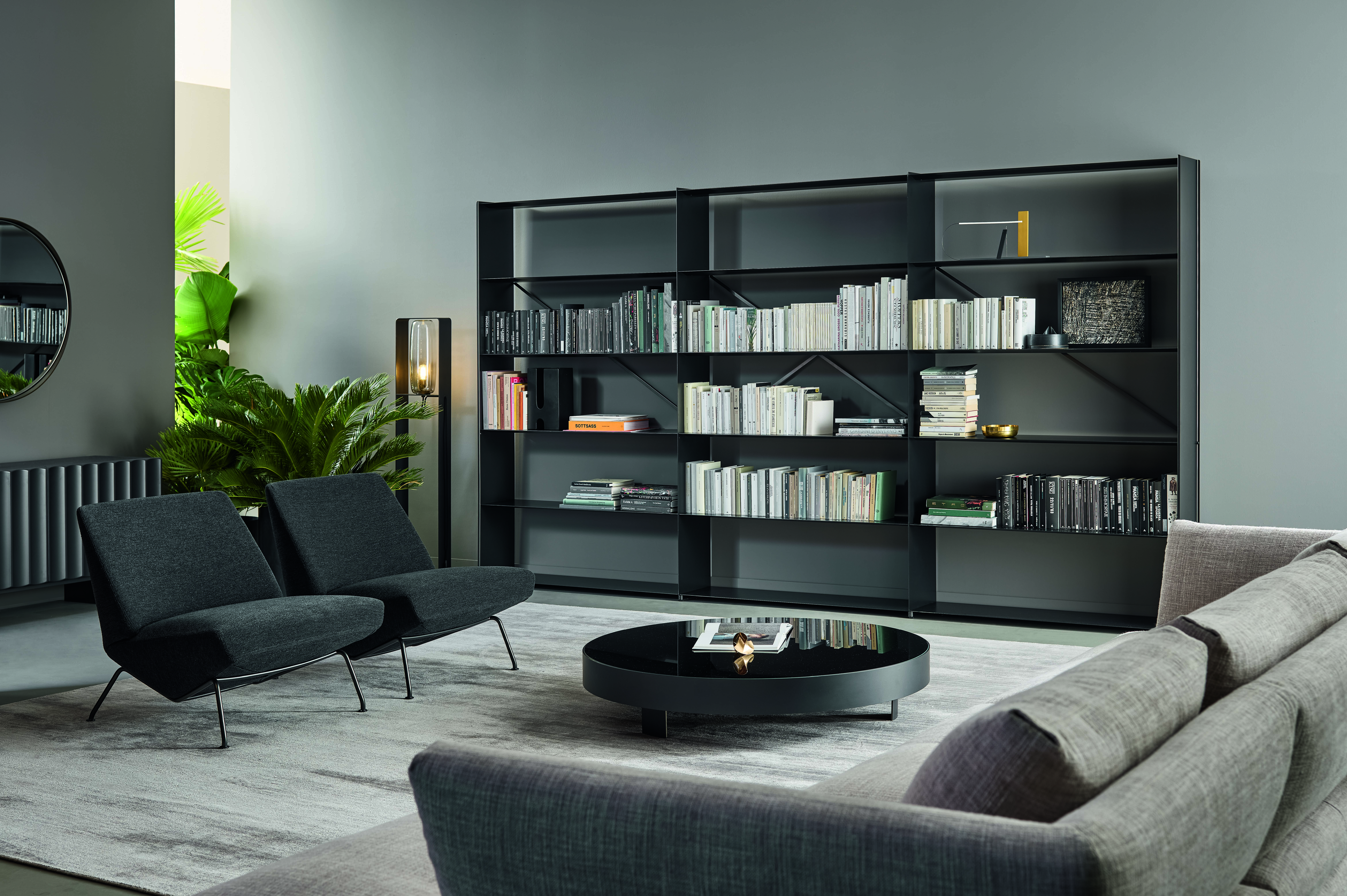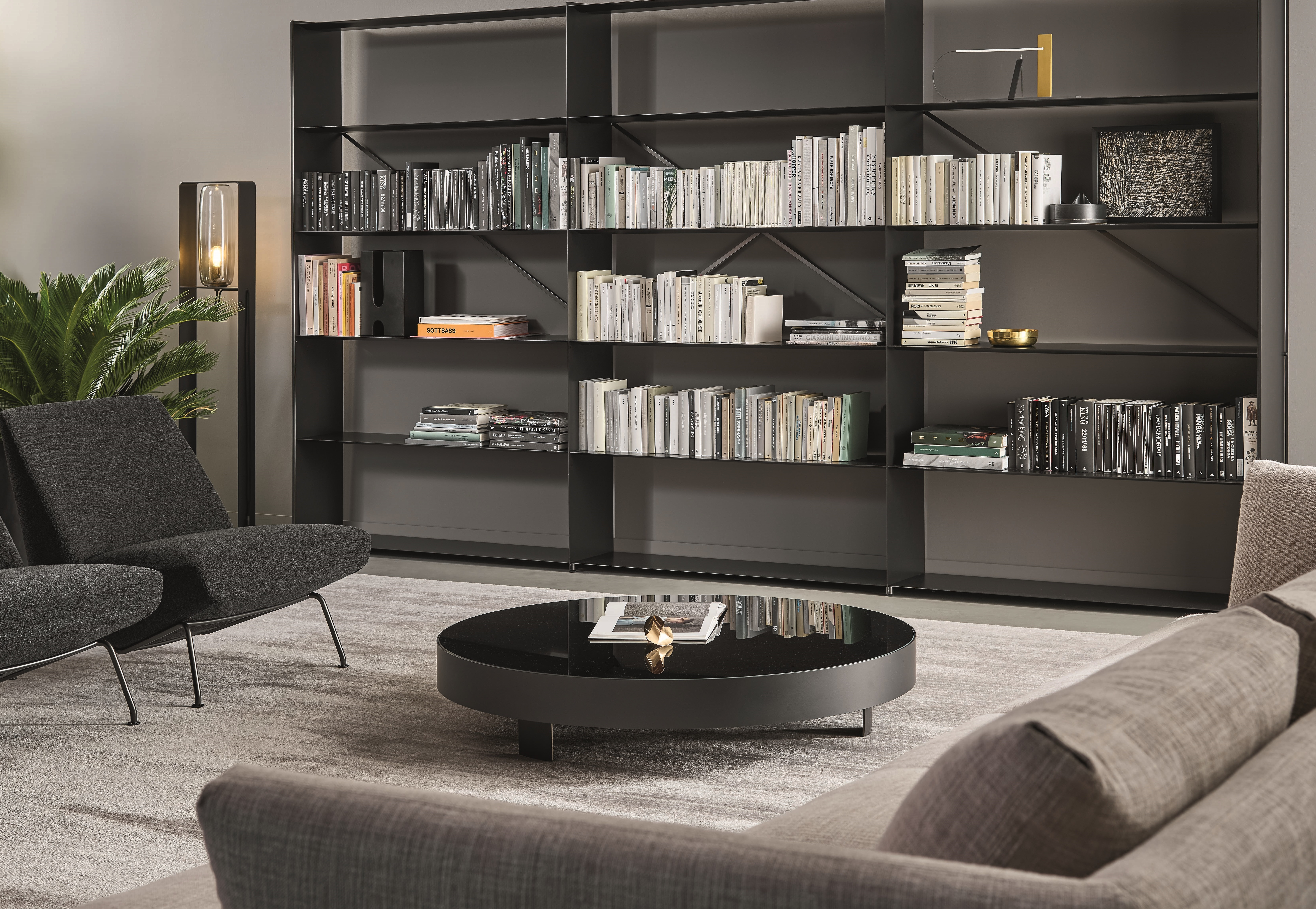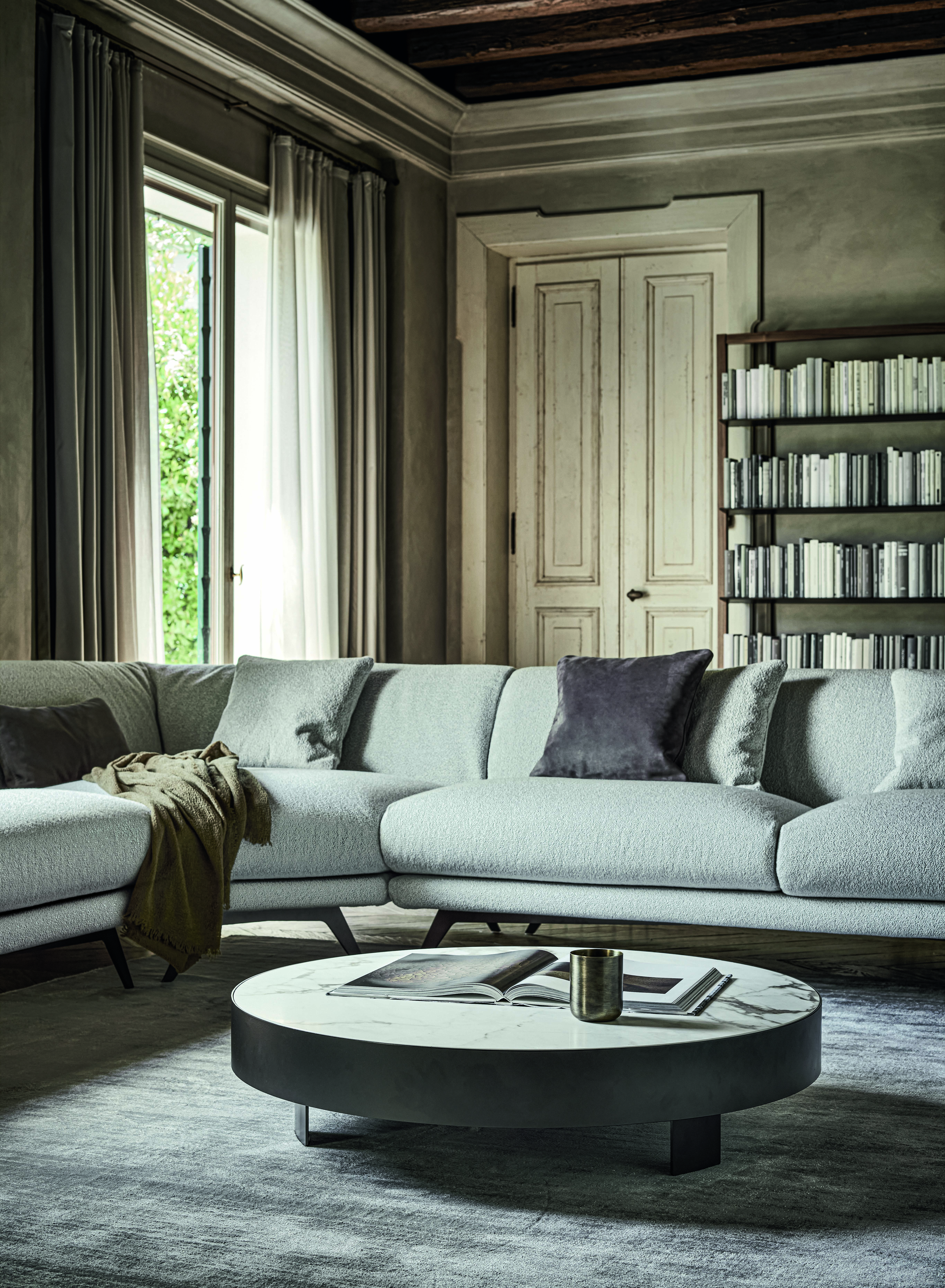 The Jazz coffee tables feature a formal linear design, are almost at floor level, slightly raised on metal feet with a highly geometric shape. The imposing table top, available in glass or ceramic, is outlined by a metal edge which contrasts with the almost invisible base. Available in a rectangular or round version.