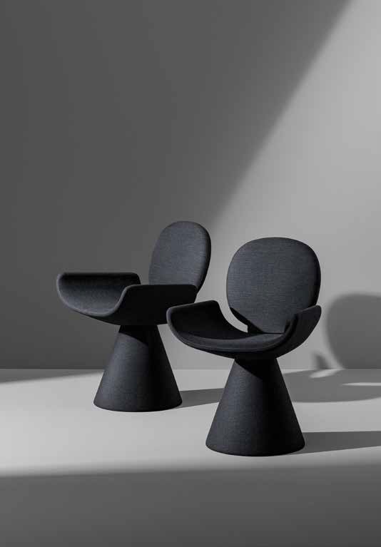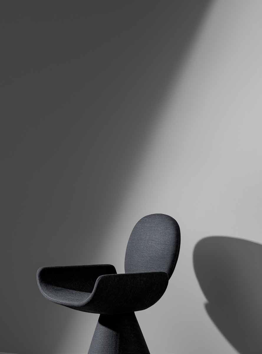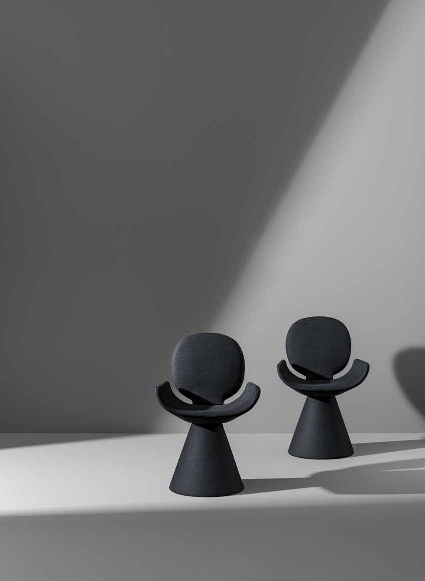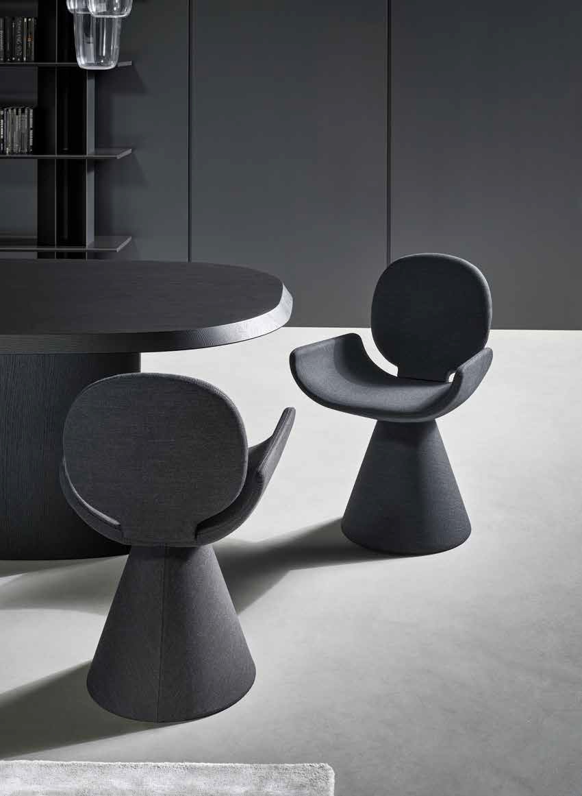 Seen from behind, the profile of the Youpi chair calls to mind the image of a stylized human figure, ready to welcome you in a comfortable embrace. Designed by Fabrice Berrux, what strikes the observer about the Youpi chair is its original shape, which adds style and a sense of lightness to any space. It consists of a series of different forms that combine to create a harmonious ensemble thanks to the fabric or leather upholstery that completely covers it: the circular backrest flows into the large seat and the whole is supported by a flared conical base. Youpi is also available in a version with four metal legs.