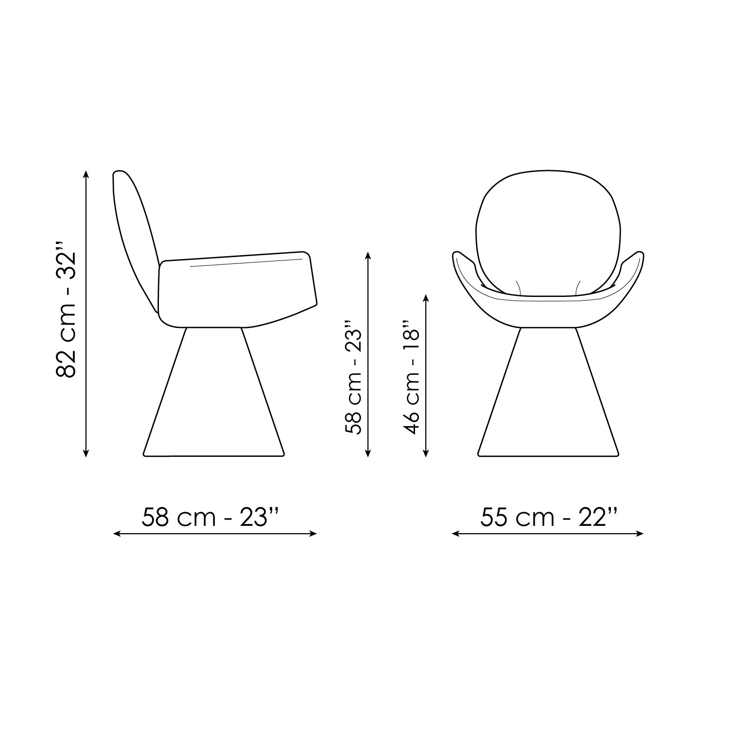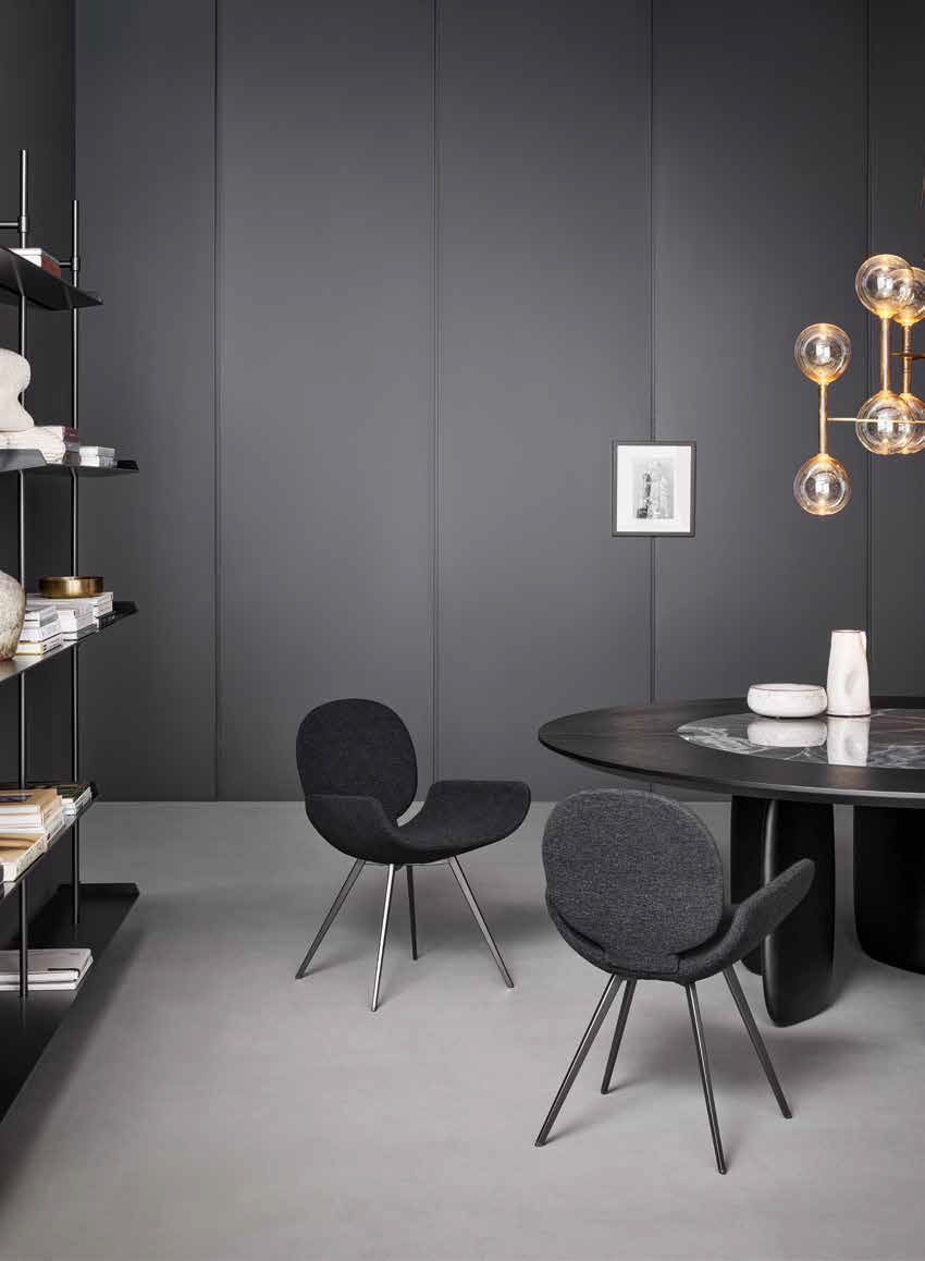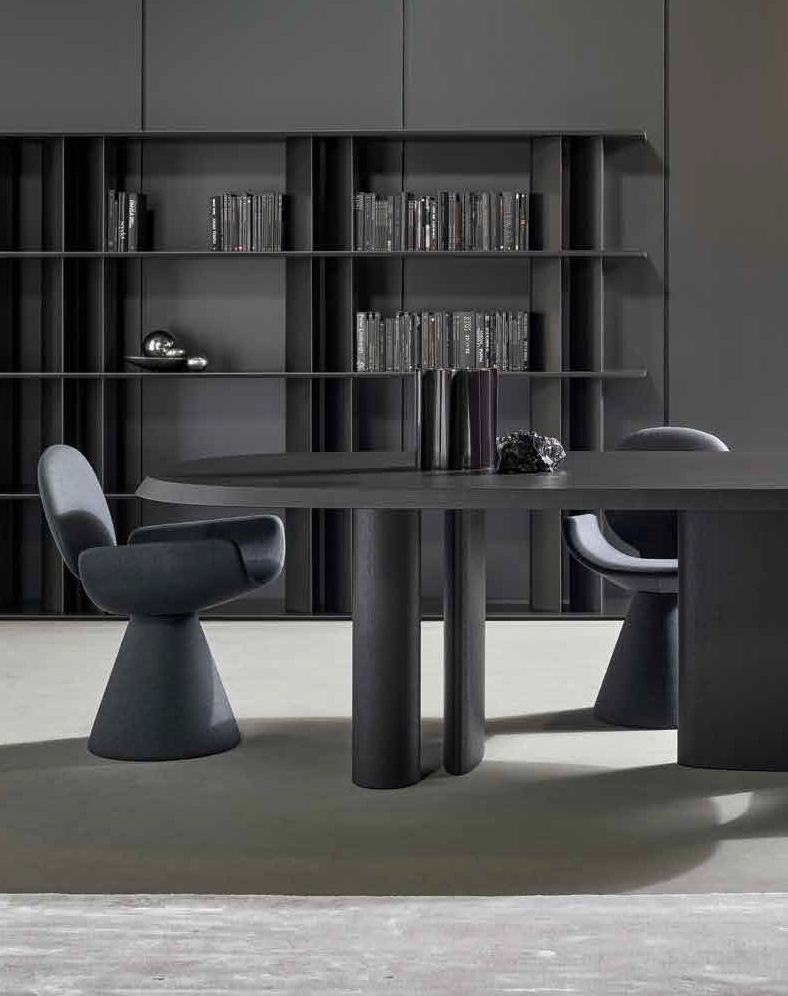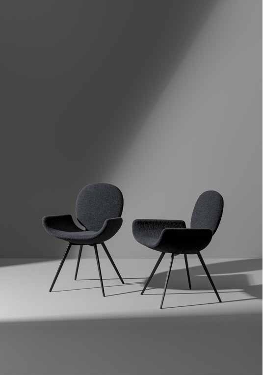 Seen from behind, the profile of the Youpi chair calls to mind the image of a stylized human figure, ready to welcome you in a comfortable embrace. Designed by Fabrice Berrux, what strikes the observer about the Youpi chair is its original shape, which adds style and a sense of lightness to any space. It consists of a series of different forms that combine to create a harmonious ensemble thanks to the fabric or leather upholstery that completely covers it: the circular backrest flows into the large seat and the whole is supported by a flared conical base. Youpi is also available in a version with four metal legs.
