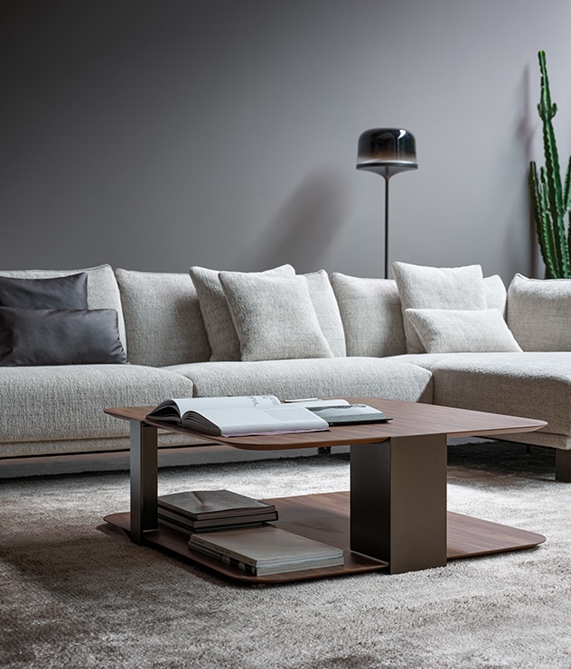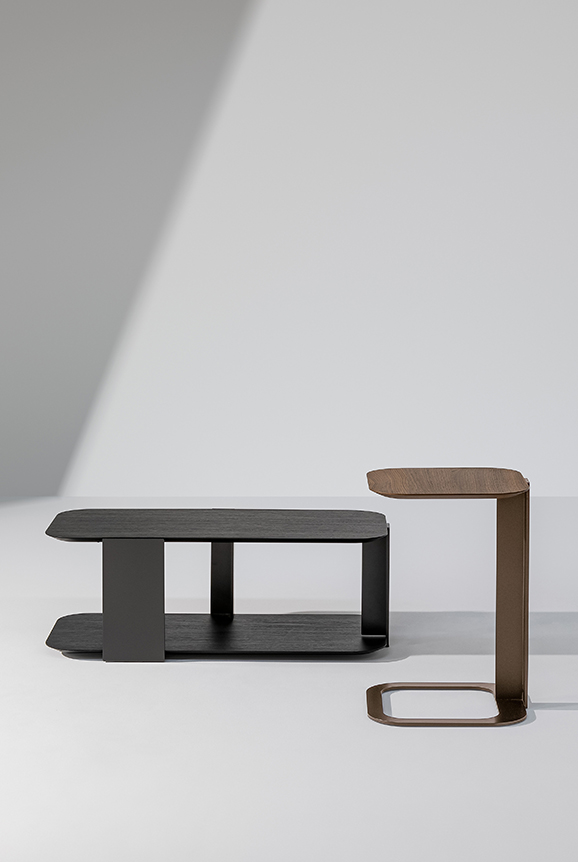 With shapes inspired by the typical sports paddle, Paddle is a collection of modern wooden coffee tables with a light and linear design softened by the rounded edges. Available with two table tops in Canaletto walnut or coal oak, completed by a load-bearing structure in bronze or lead painted metal. Arranged individually or in combination with other elements, they offer ample possibilities for insertion in the most disparate domestic and hospitality spaces.