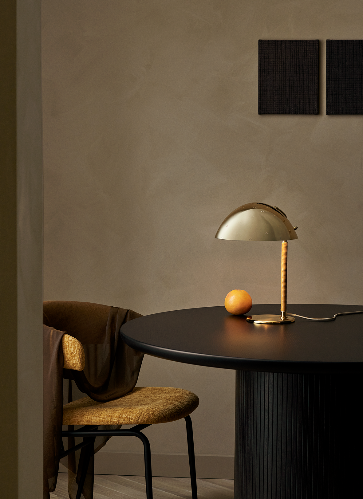 One of the great industrial designers and metal craftsmen of the 20th century, Tynell came into the world at precisely the right time to become one of the pioneers of modern lighting; as the electric light spread across the world, so too did Tynell’s design visions. The iconic 9209 table lamp, first produced in 1940, has a distinctively shaped shade in spun brass that has led to it being referred to as the ‘Kypärä’ – the Finnish word for ‘helmet’. Held in place by a curved brass arm, the individually molded shade is decorated with triangular patterns of perforation – a Tynell decorative signature – which requires a specialist punch tool and the utmost precision to achieve by hand. As well as guiding the light downward, thanks to the holes punched in the surface, the shade also allows pinpricks of light through, creating a soft, textured glow and a starlight-like sparkle.