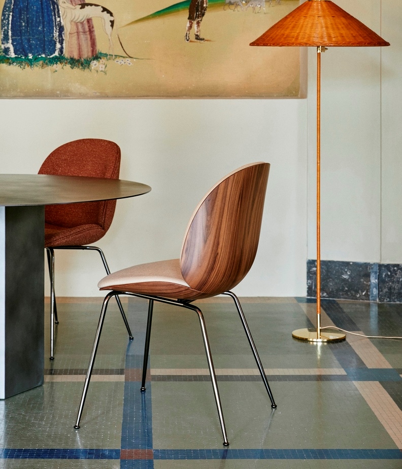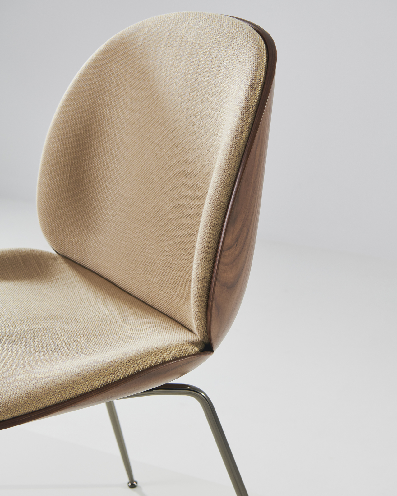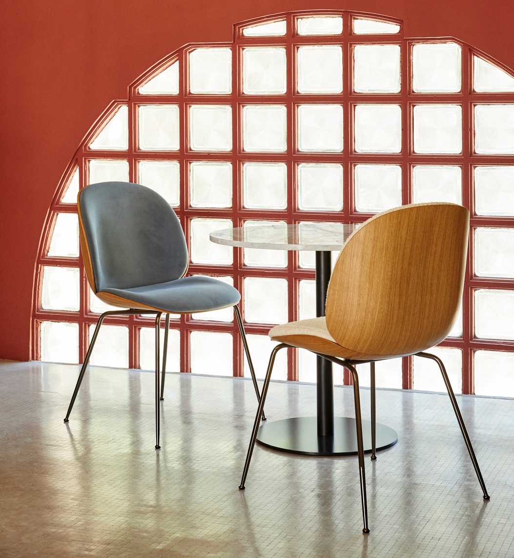 The front upholstered Beetle chair with a 3D molded veneer shell takes the natural inspiration of the Beetle collection to the next level. Originally designed by GamFratesi 2013, the Beetle collection has been embraced by design lovers the world over for its exceptional comfort, striking silhouette, and quality construction. This latest iteration, featuring oak and American walnut wood veneer, brings versatility and an even more sophisticated expression to the collection.