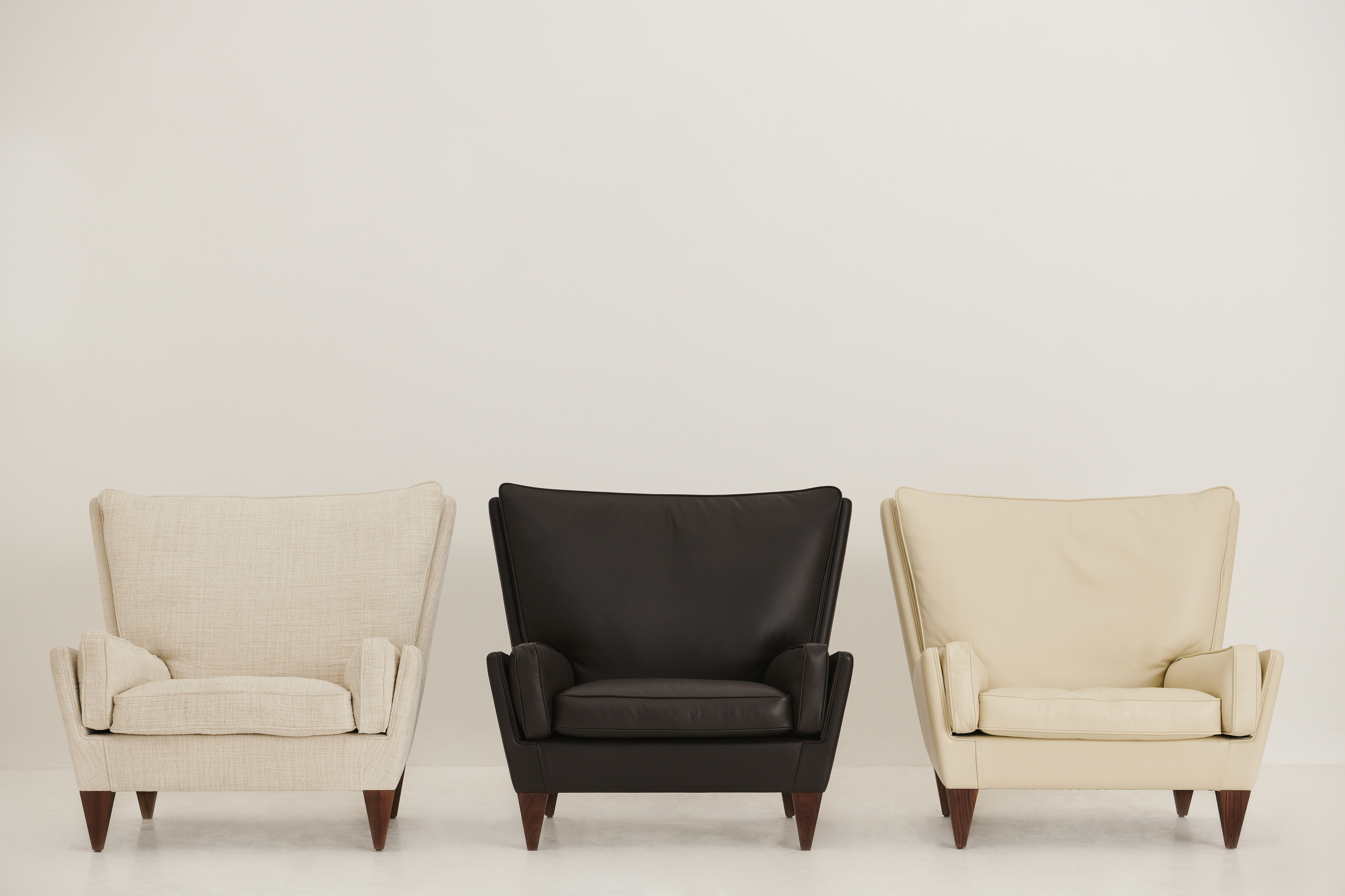 Available upon order with an extensive choice of upholstery options, with legs in solid Oak or Walnut wood.