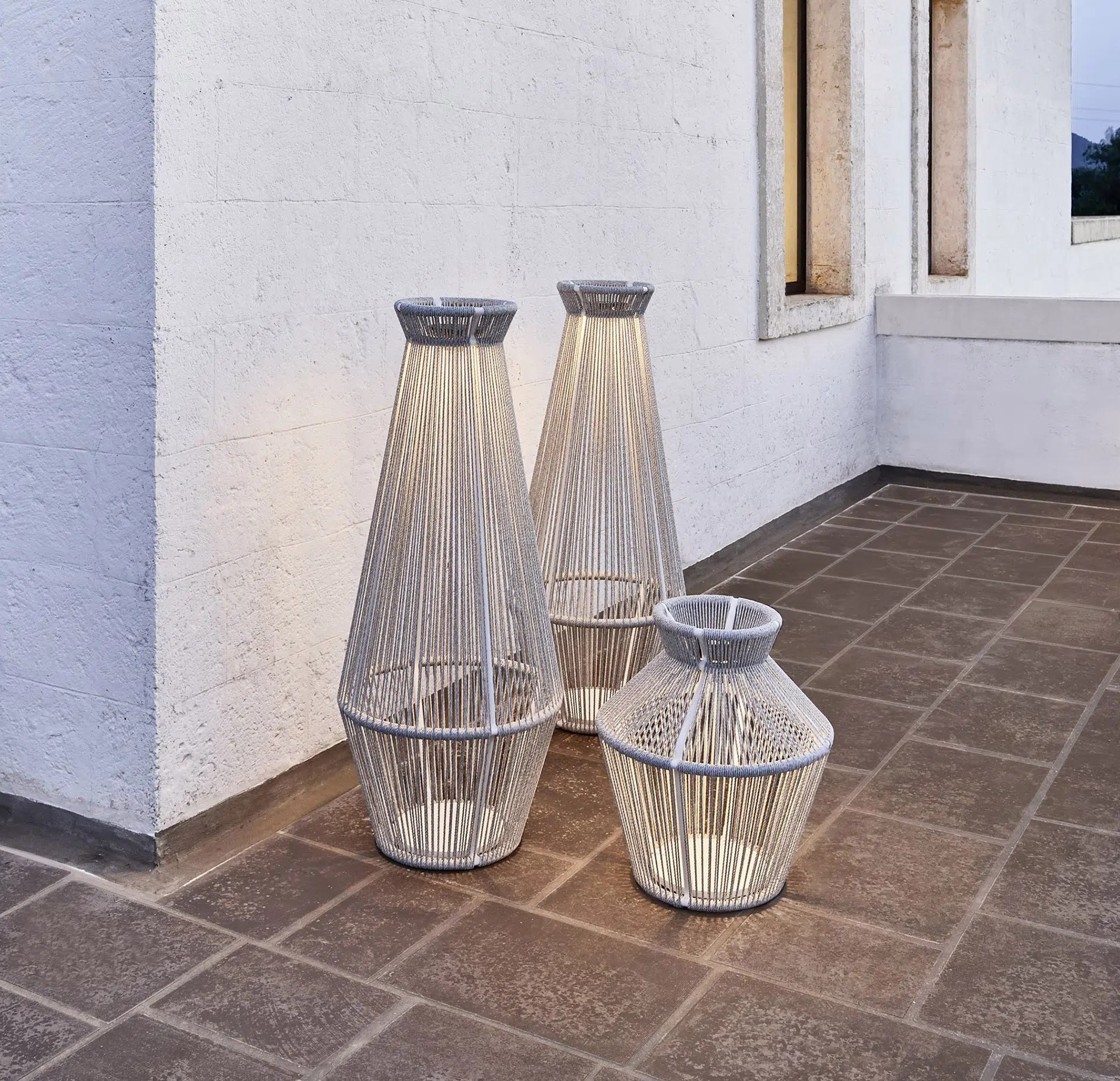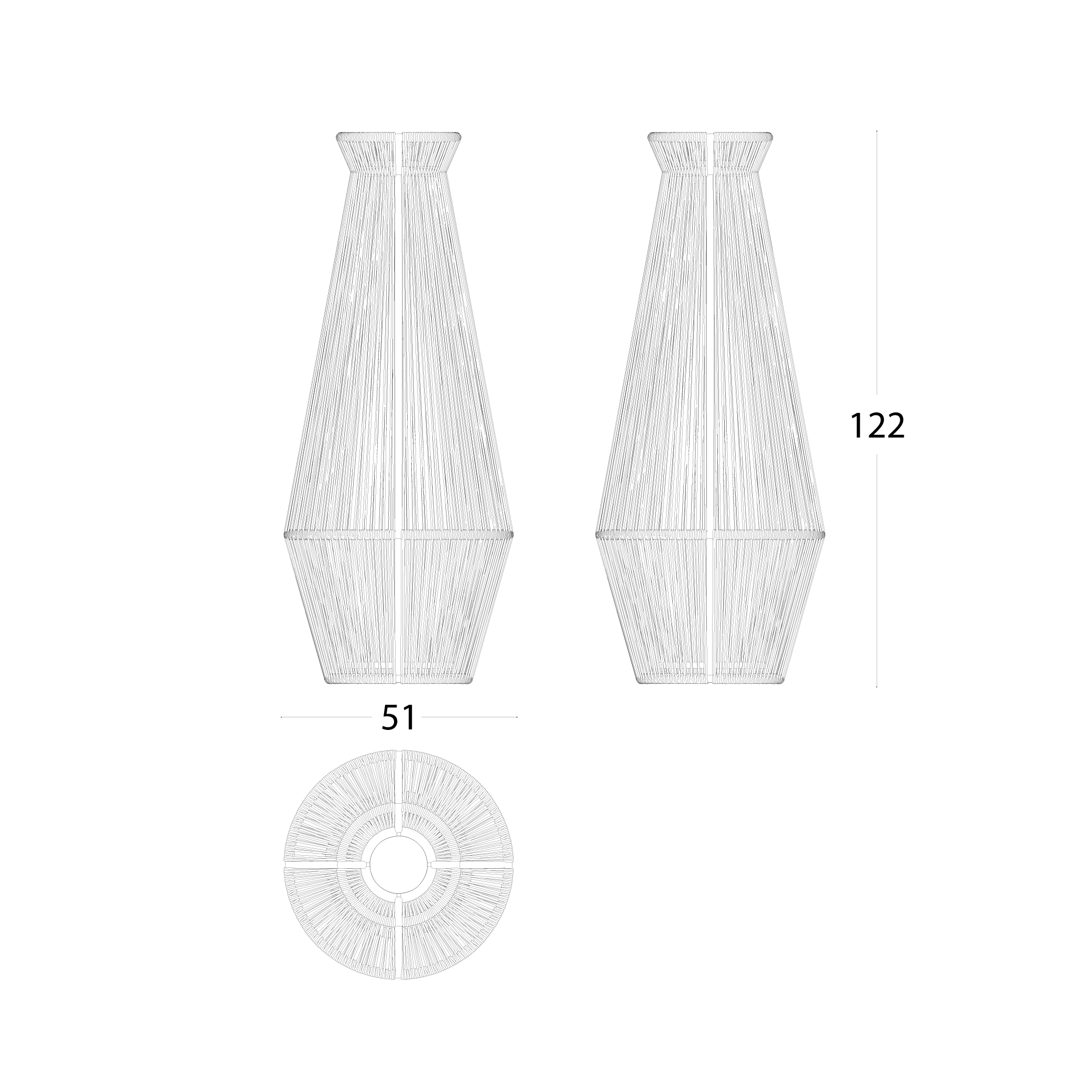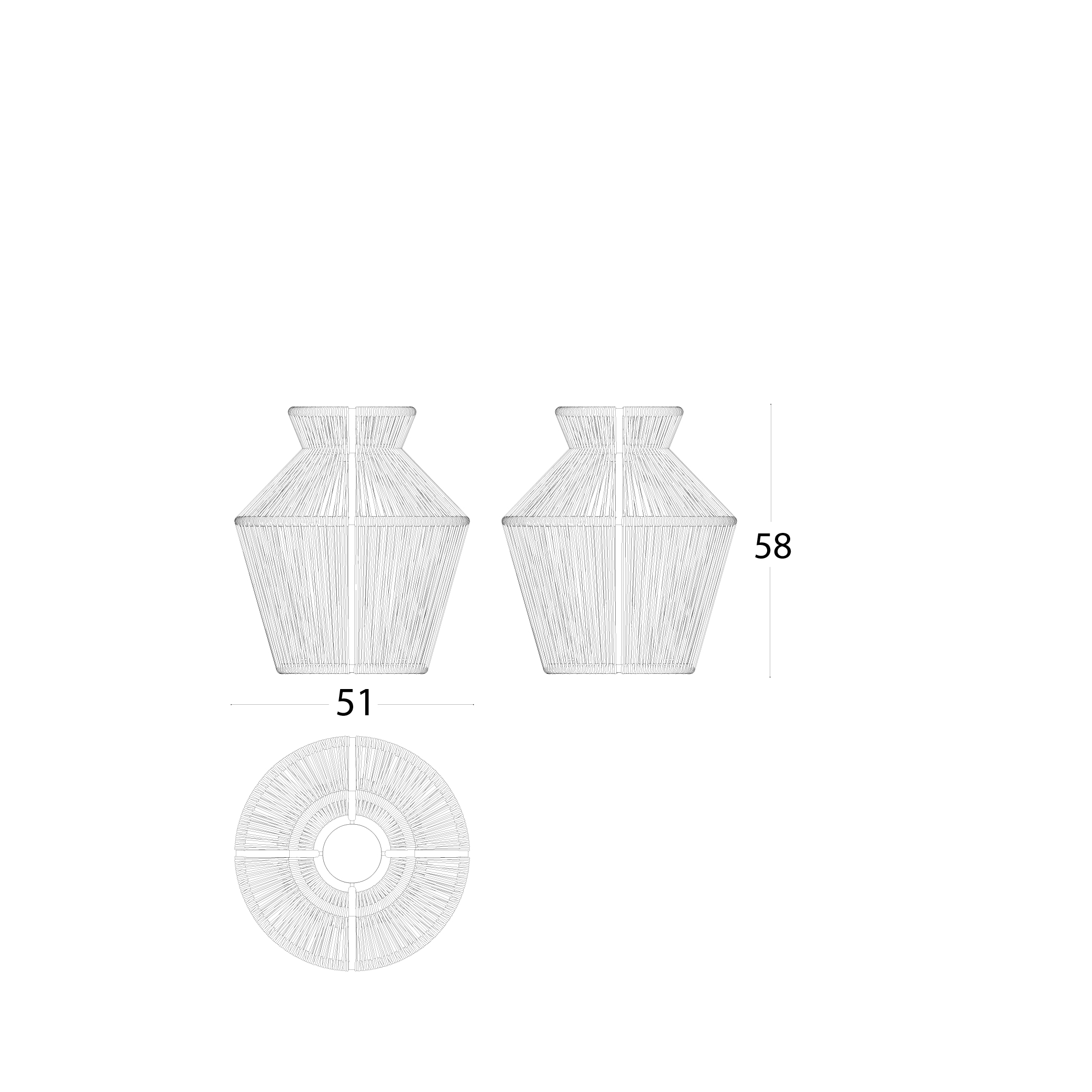 Shapes that evoke the tradition and at the same time reinterpret it in a contemporary key, these are the hallmark of a lampshade in which the handmade weaving, in synthetic fibres, becomes a diaphragm through which a soft light is diffused, a friend of outdoor relaxation. Functionality is guaranteed by the "OUTDOOR LIGHTING” wireless autonomous LED lamp, included as the ballast to make it stable. The powder-coated aluminium structure, both solid and light, ensures maximum reliability.