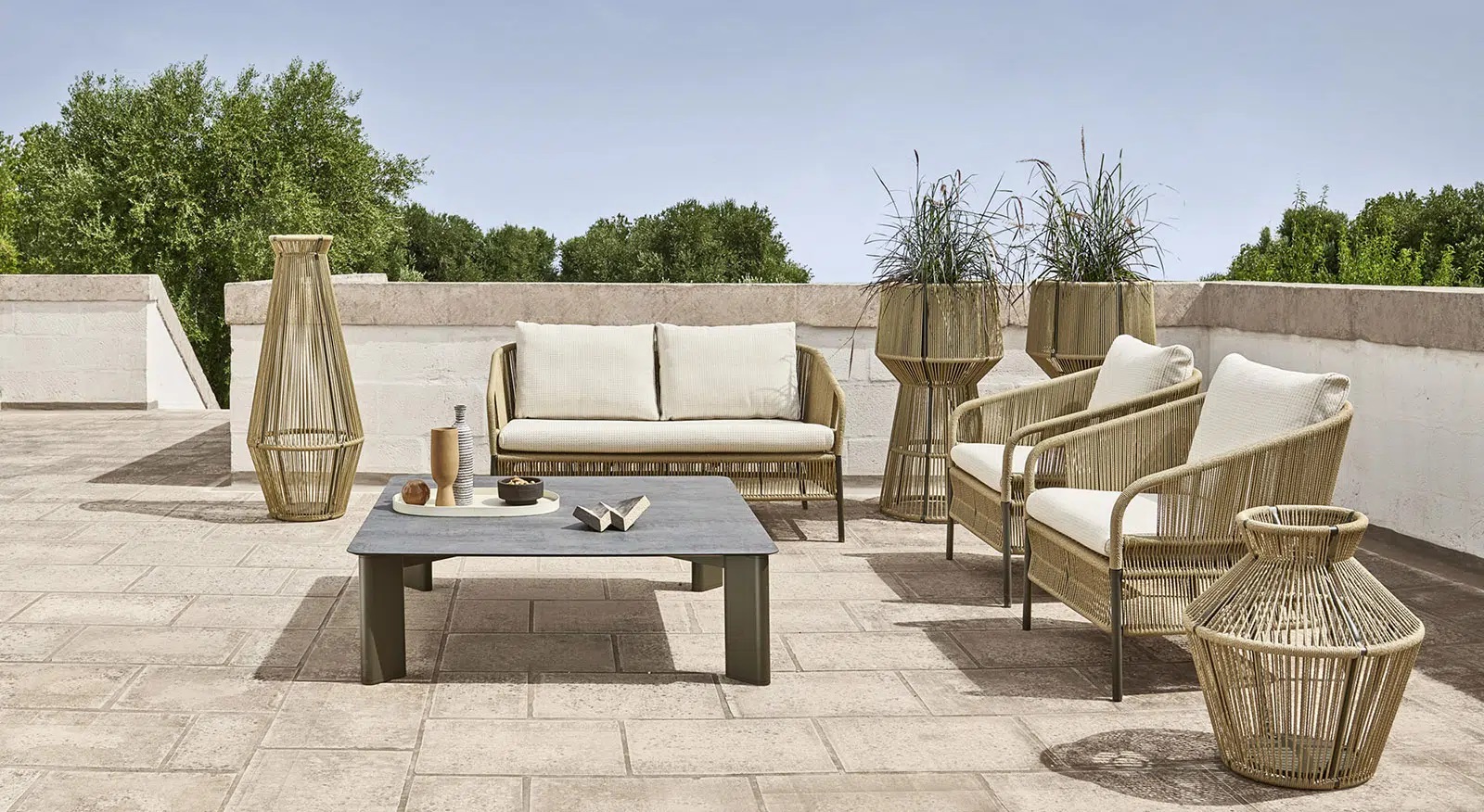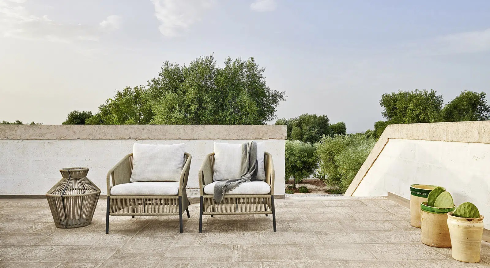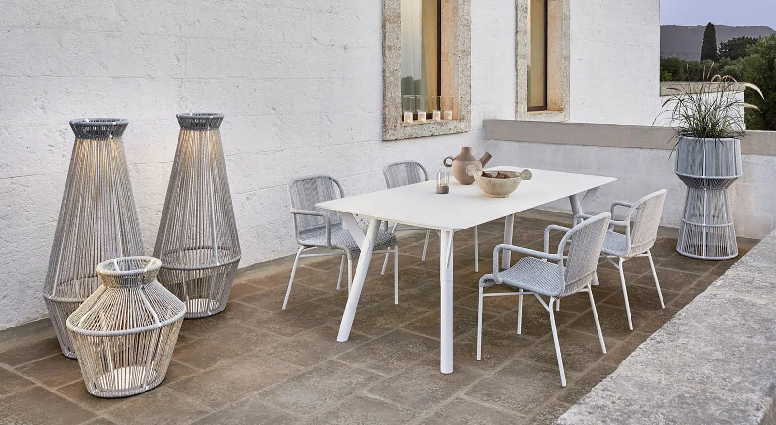 Shapes that evoke the tradition and at the same time reinterpret it in a contemporary key, these are the hallmark of a lampshade in which the handmade weaving, in synthetic fibres, becomes a diaphragm through which a soft light is diffused, a friend of outdoor relaxation. Functionality is guaranteed by the "OUTDOOR LIGHTING” wireless autonomous LED lamp, included as the ballast to make it stable. The powder-coated aluminium structure, both solid and light, ensures maximum reliability.