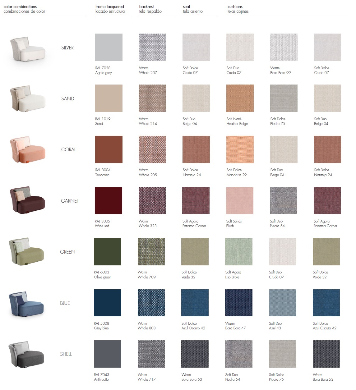 Coral, Sand, Shell, Blue, Green, Silver and Garnet.