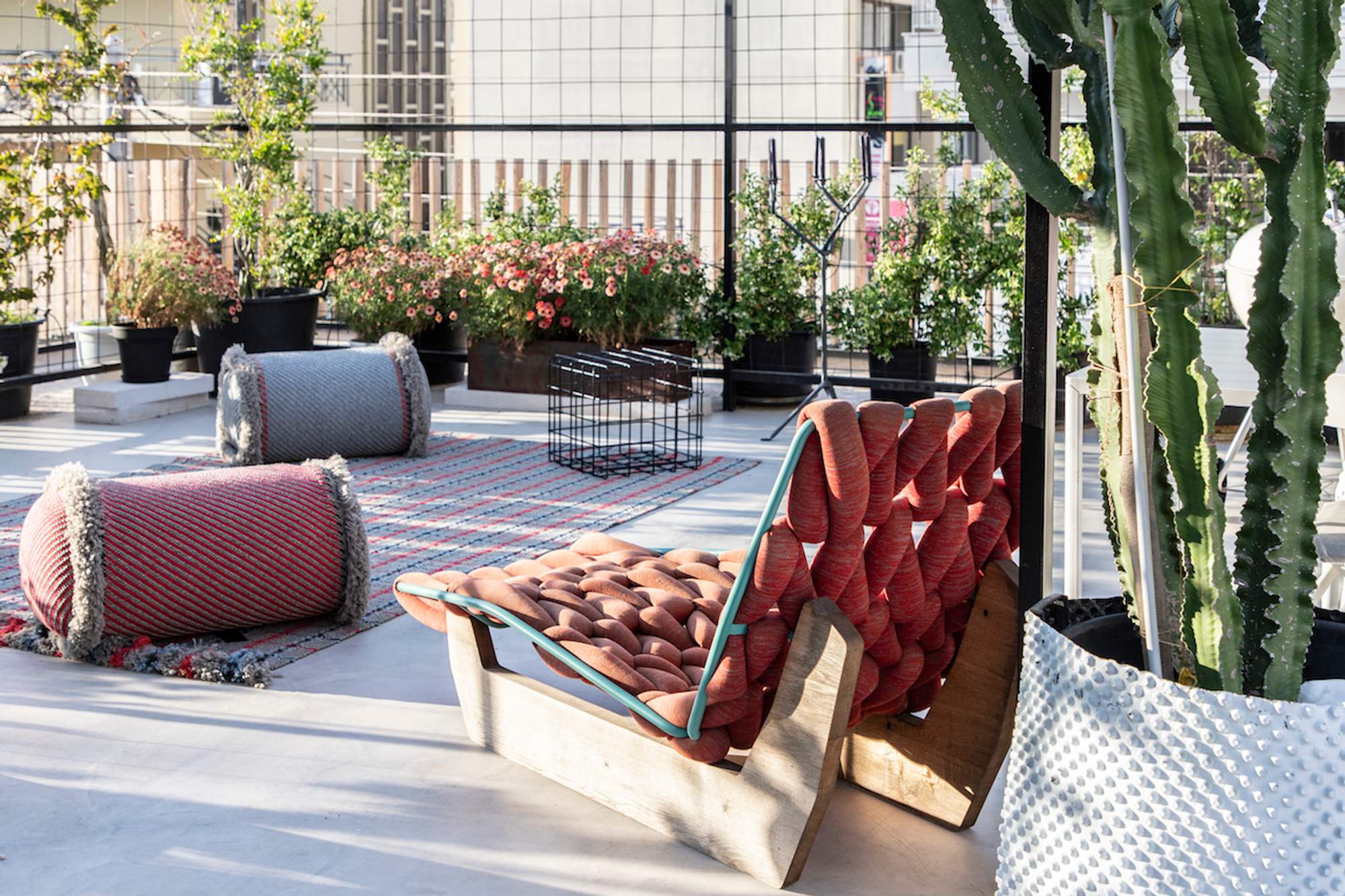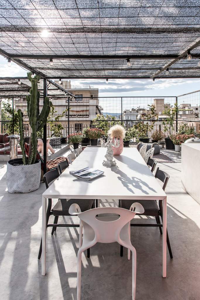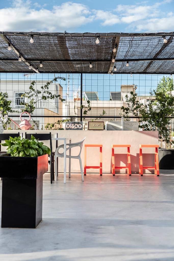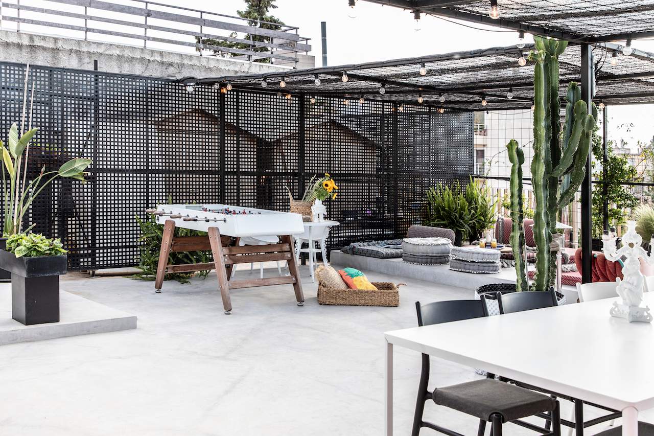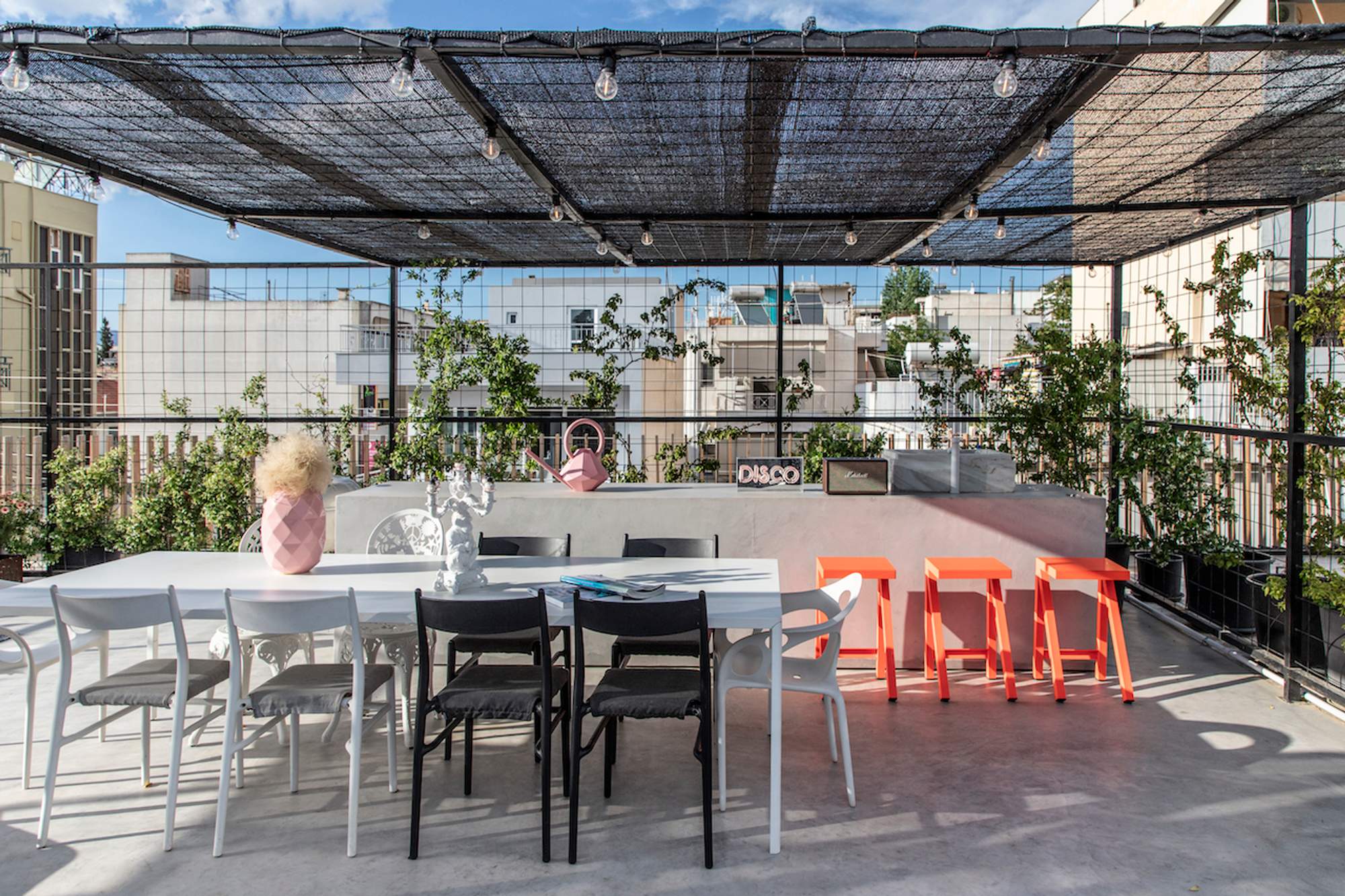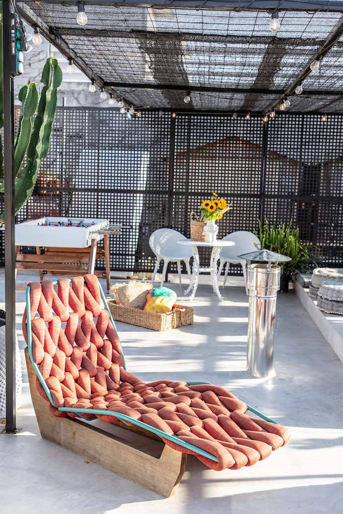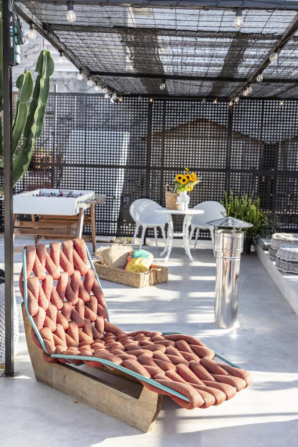 Surrounded by a metal wired fence on a concrete base, much alike a New York basketball court, it transforms with high end furnishings, Seletti lights and Nomad inspired pouf for the living room area.