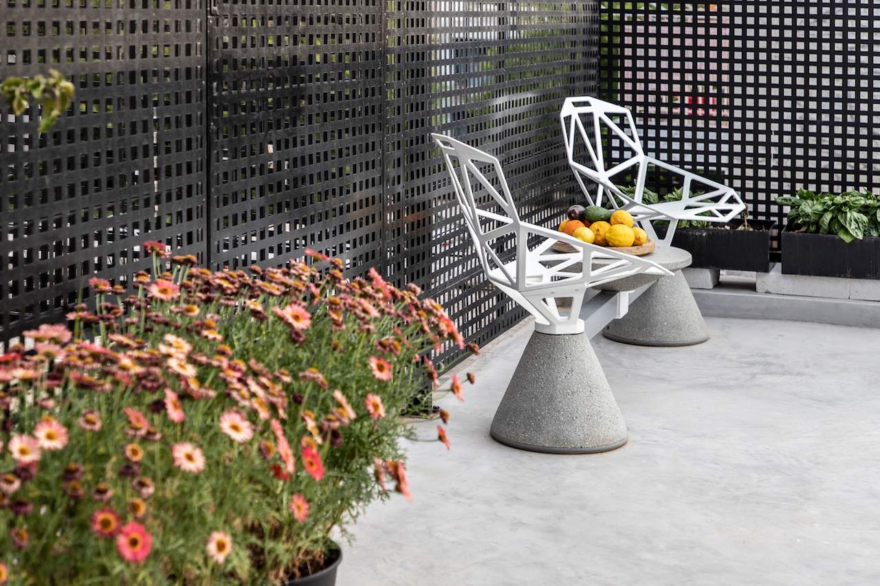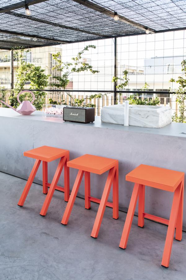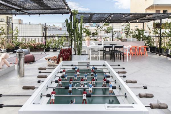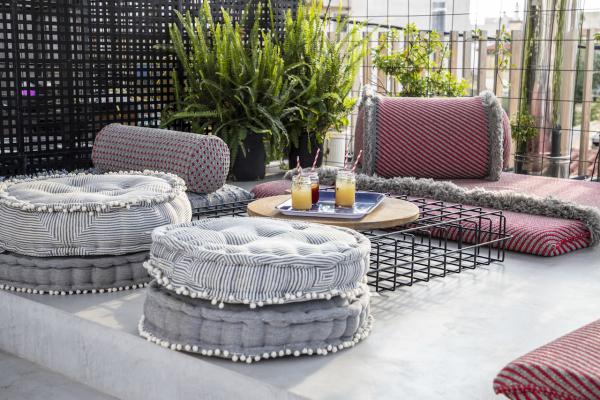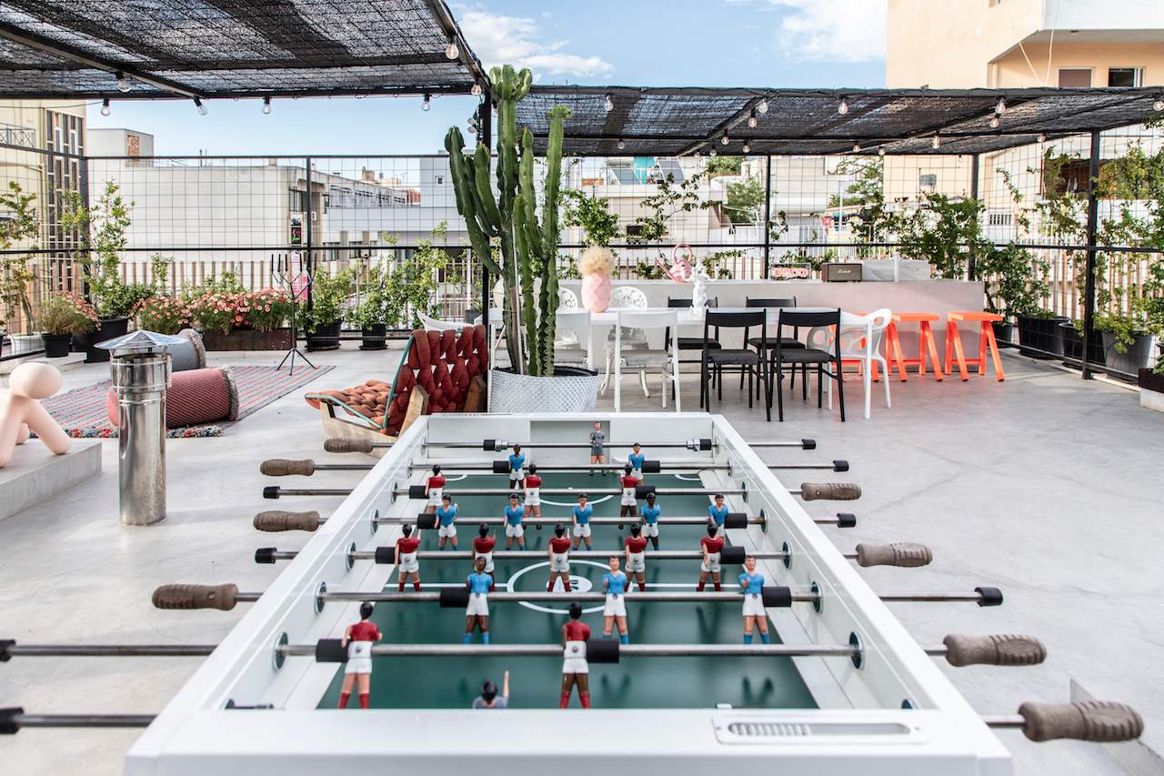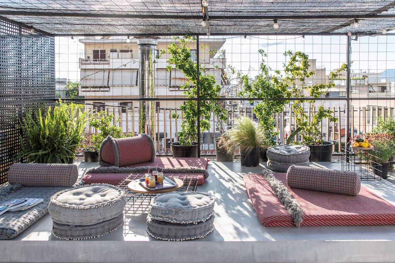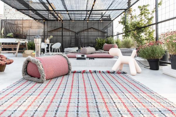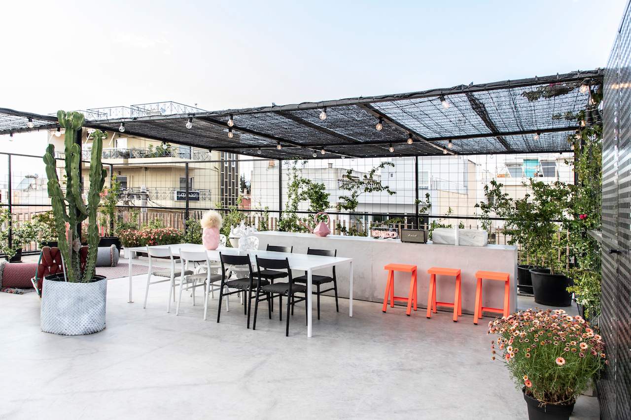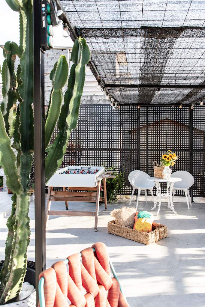 Surrounded by a metal wired fence on a concrete base, much alike a New York basketball court, it transforms with high end furnishings, Seletti lights and Nomad inspired pouf for the living room area.