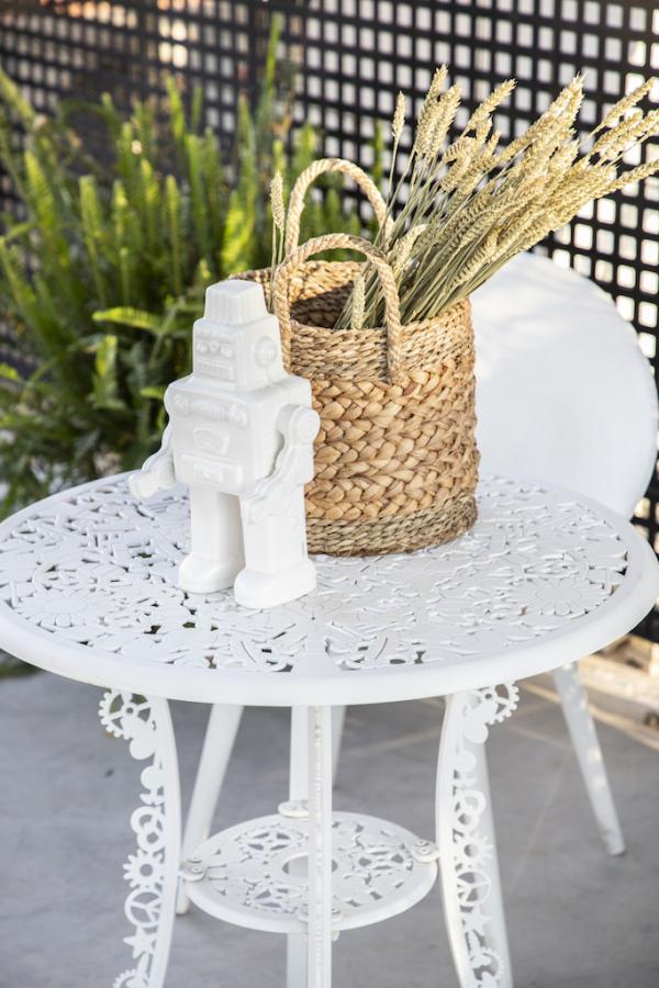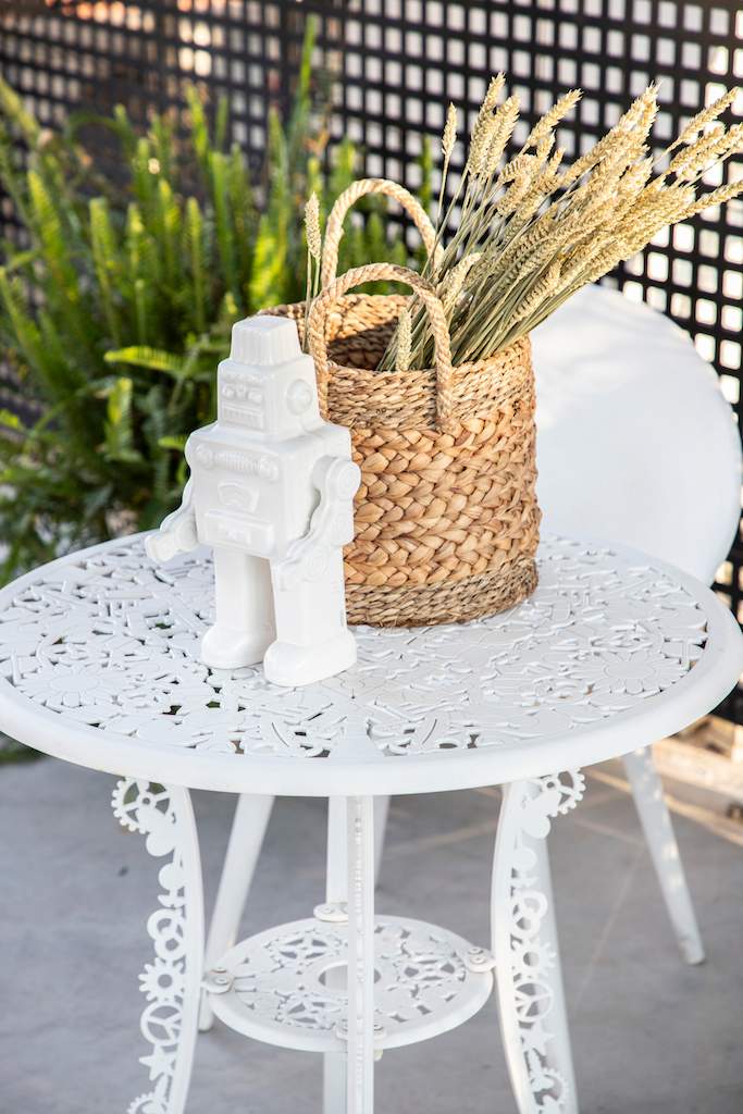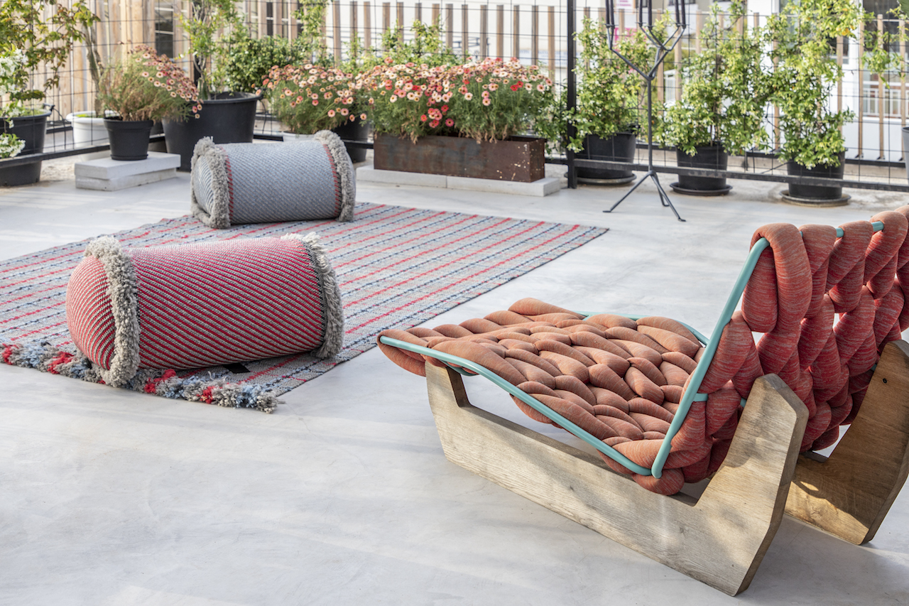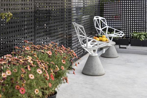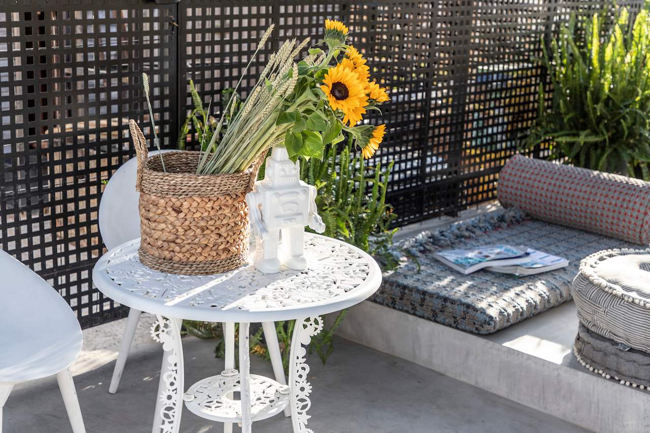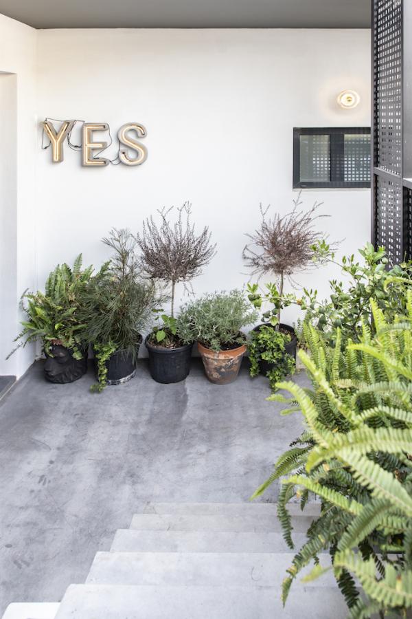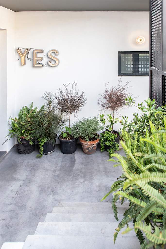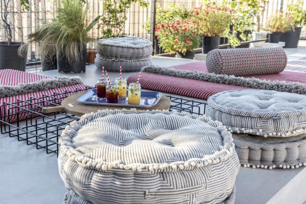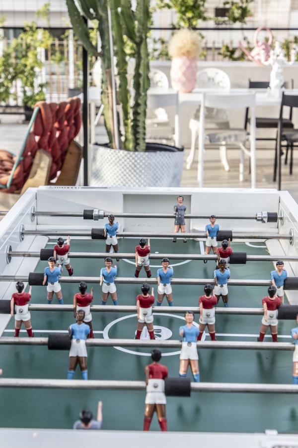 Surrounded by a metal wired fence on a concrete base, much alike a New York basketball court, it transforms with high end furnishings, Seletti lights and Nomad inspired pouf for the living room area.
