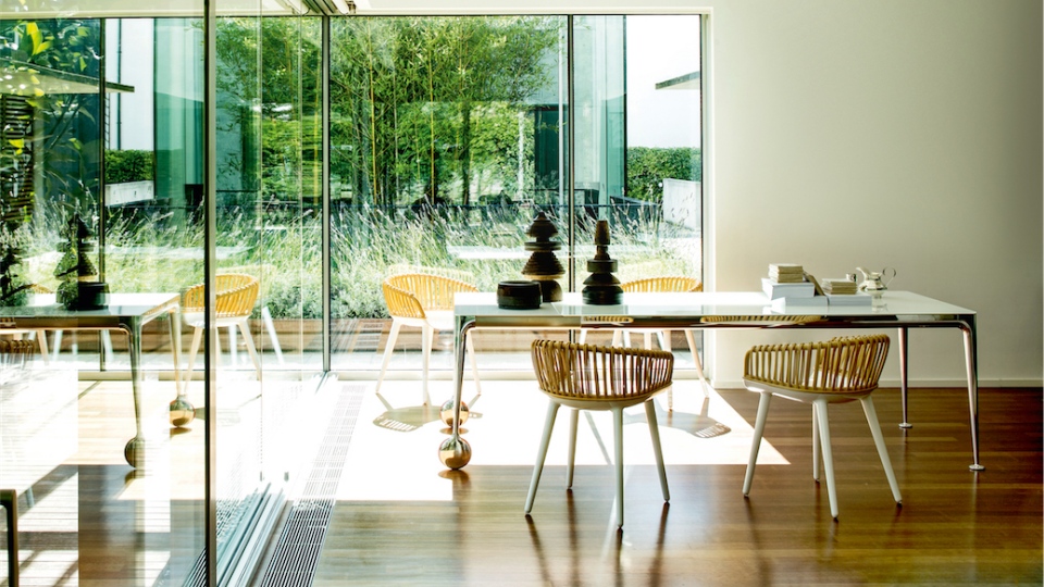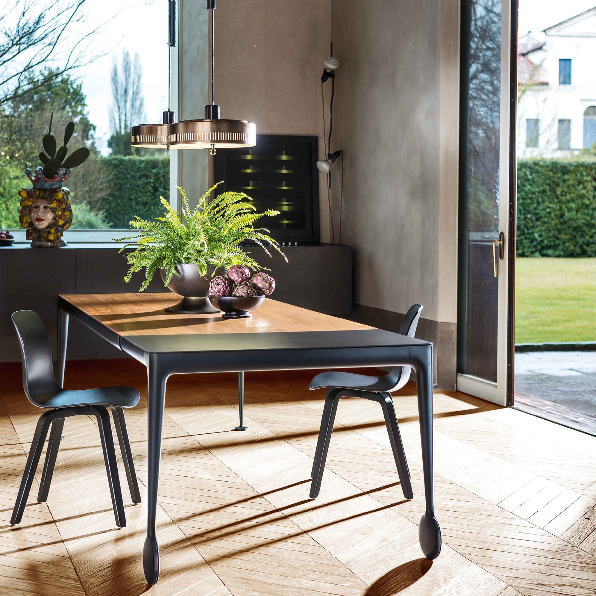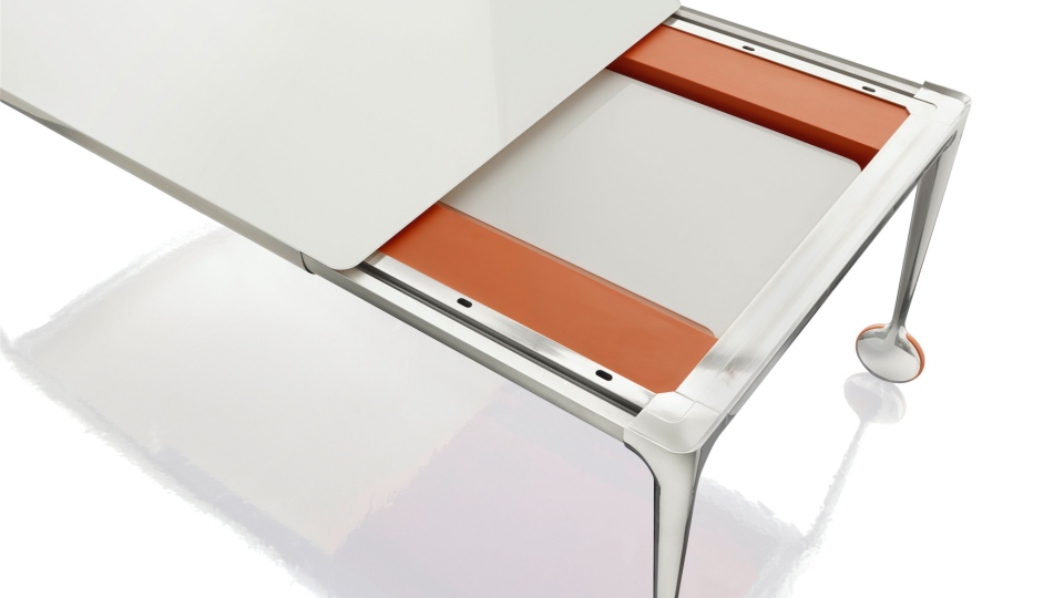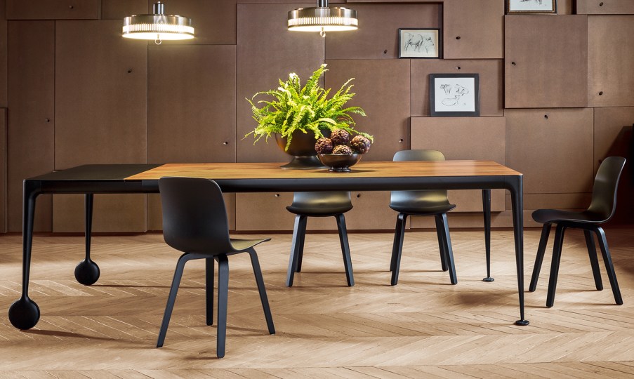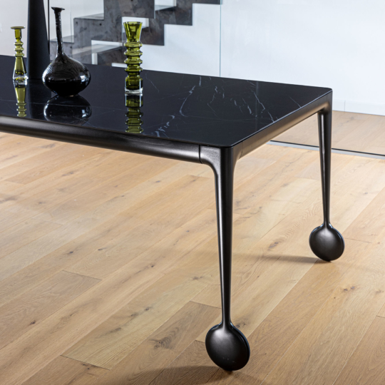 Μια τραπεζαρία που συνδυάζει τον χαρακτηριστικό σχεδιασμό του Philippe Starck με απλότητα χρήσης και απίθανο φινίρισμα. Εξοπλισμένη με δύο σταθερά πόδια και δύο πόδια που καταλήγουν σε τροχούς για εύκολη μετακίνηση. Είναι πραγματικά ενδιαφέρουσα η αντίθεση με τις λιτές γραμμές, τα κλασικά υλικά και τον μοντερνισμό του έξυπνου συστήματος των τροχών.