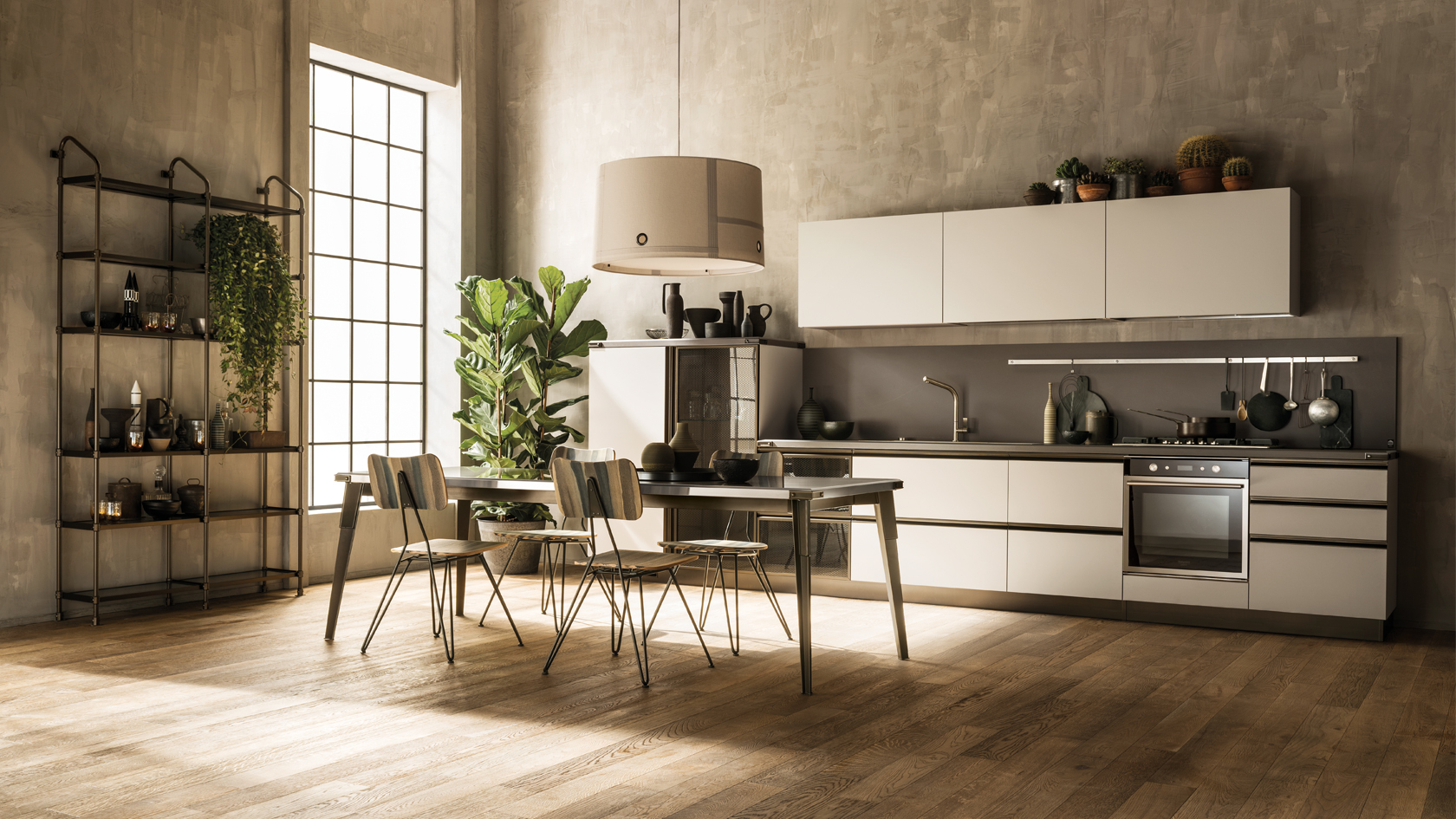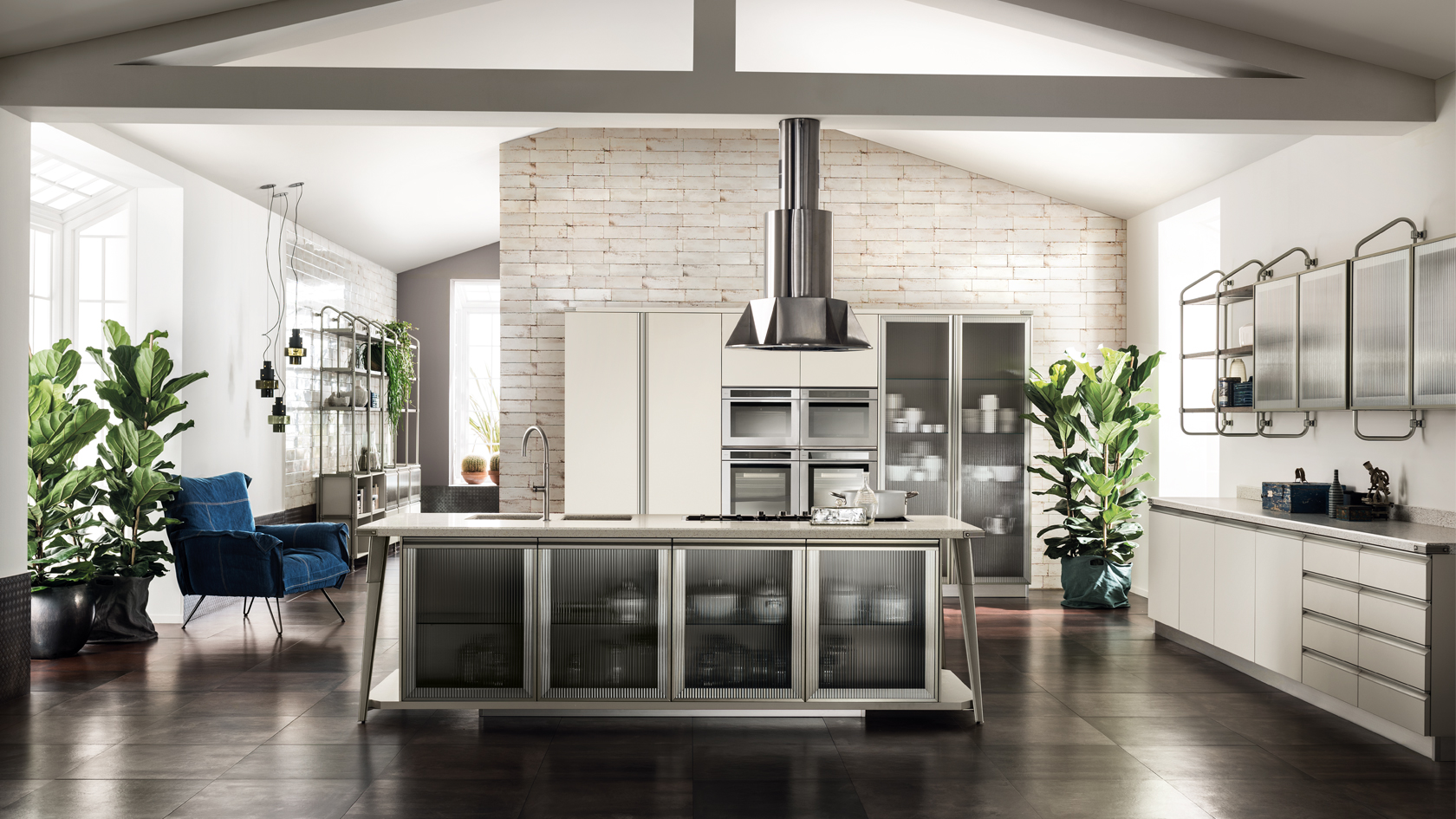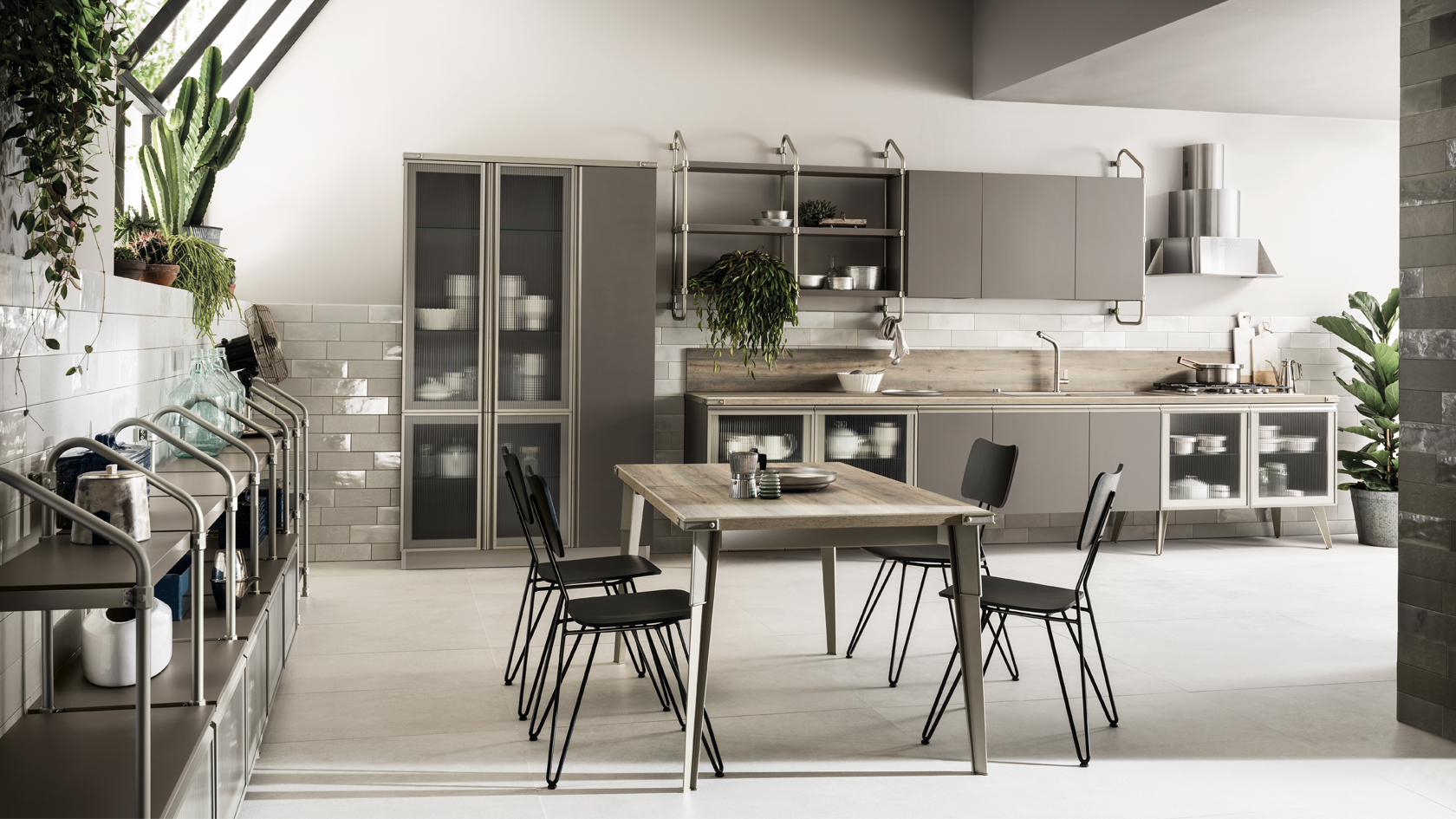 Η αρθρωτή δομή των σωλήνων από χάλυβα χαρακτηρίζει με μοναδικό τρόπο αυτή την κουζίνα, μια στιλιστική προσέγγιση ικανή να συνδυάζει και να ενισχύει τα σχήματα, τη λειτουργικότητα, το vintage spirit με τη σύγχρονη αισθητική. Η άψογη φροντίδα των λεπτομερειών, που αποτελούν την αληθινή προσωπικότητα αυτής της κουζίνας, τα προφίλ των λαβών που ενσωματώνονται στην πόρτα, το πλαίσιο των ίδιων των θυρών και των ραφιών, τα πόδια και τα γωνιακά στοιχεία, έχουν σχεδιαστεί για να προσδώσουν στο σύστημα μια μοναδική εμφάνιση.