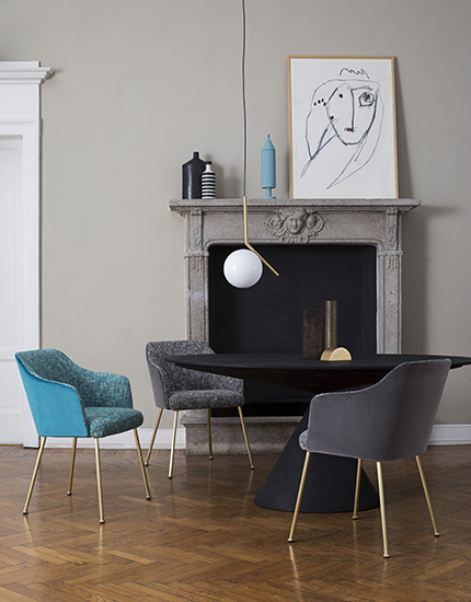 Μια απόλυτα θηλυκή καρέκλα, διακριτική και εκλεπτυσμένη, ήρεμη και απλή. Το στρογγυλεμένο σχήμα της τονίζεται από την επιλογή διχρωμίας του υφάσματος όπως βελούδο στο εξωτερικό και ζακάρ στο εσωτερικό.