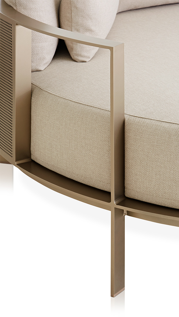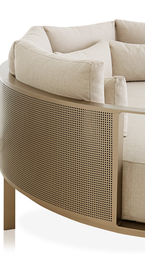 Το chill bed της συλλογής διατίθεται κατόπιν παραγγελίας με σκελετό αλουμινίου σε 14 διαφορετικά φινιρίσματα και μαξιλάρια καθίσματος/πλάτης σε ποικιλία outdoor υδατοαπωθητικών υφασμάτων.