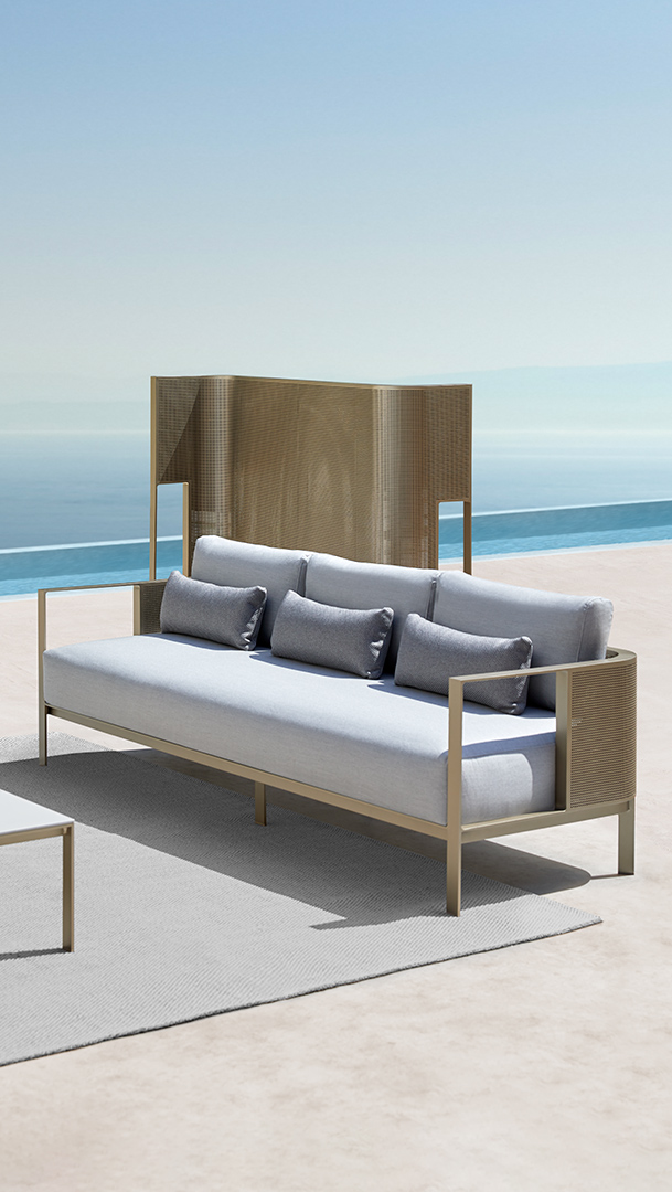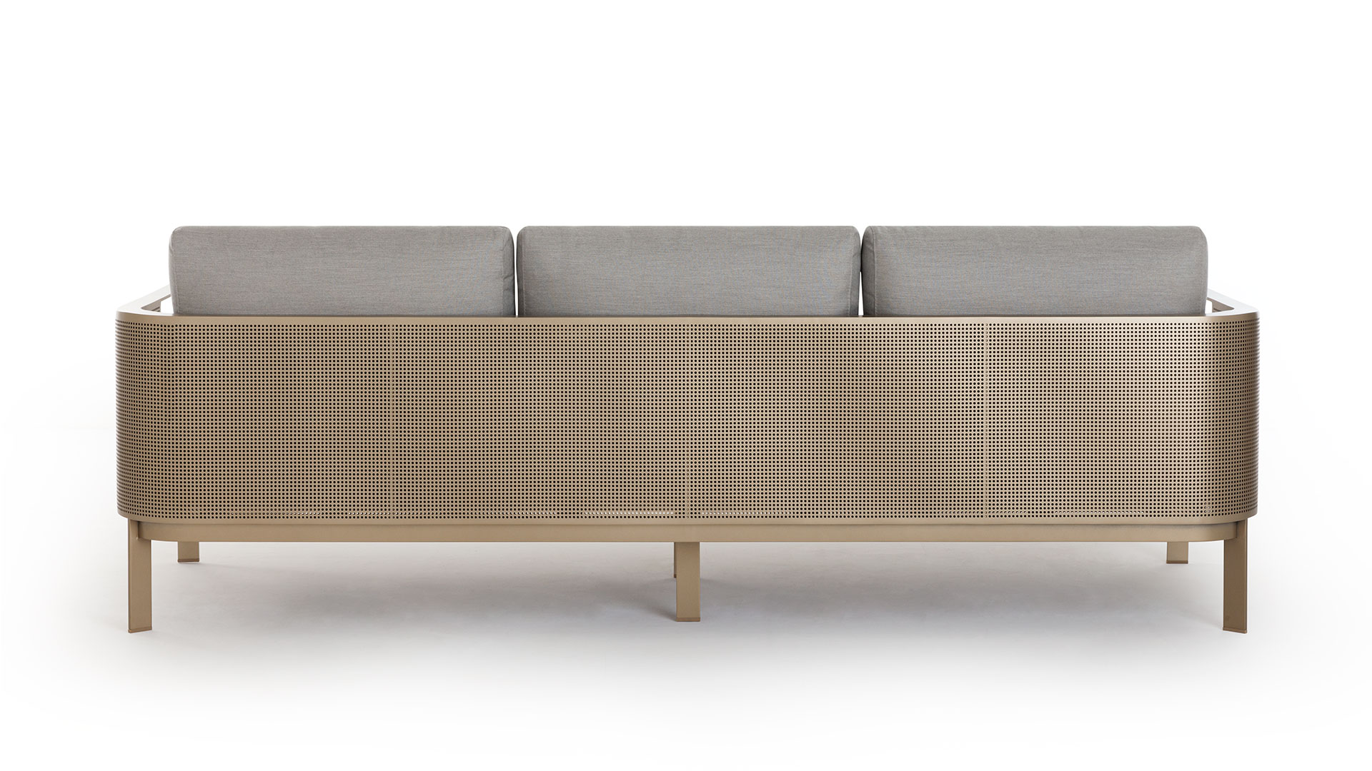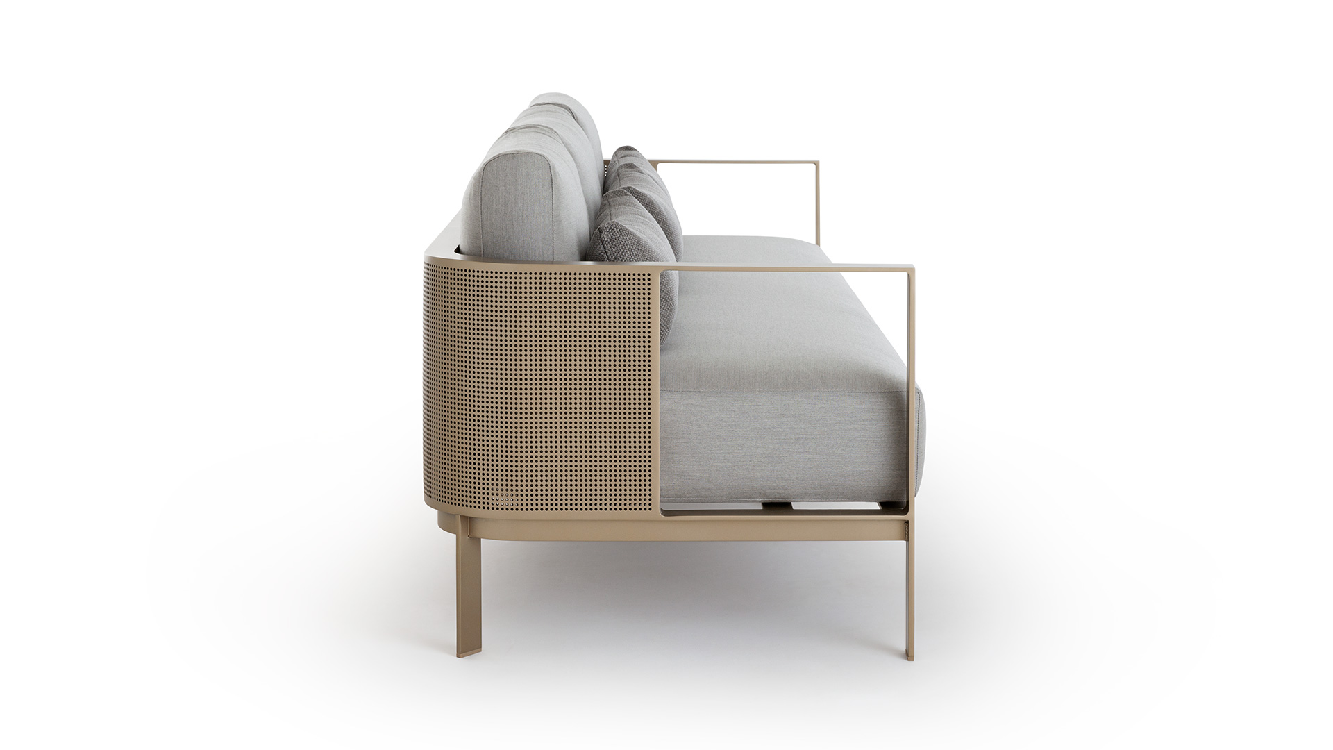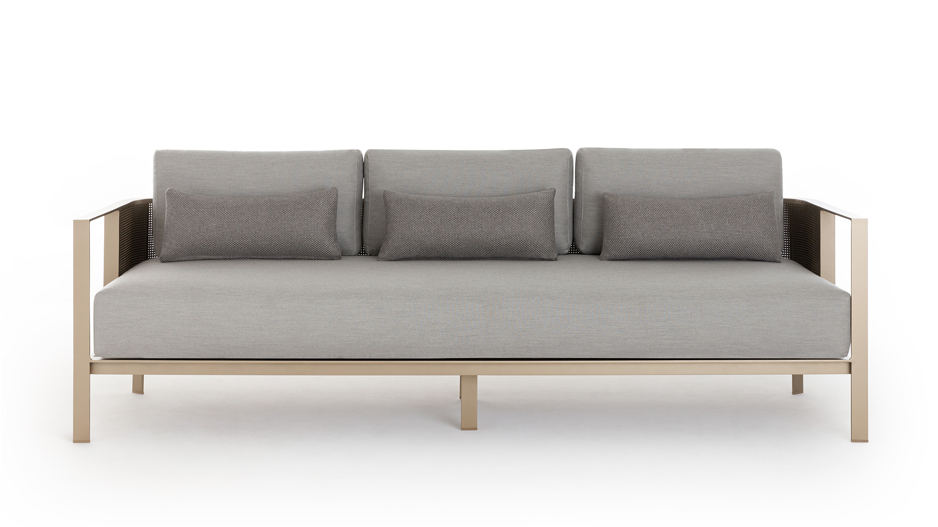 Ο καναπές της συλλογής διατίθεται κατόπιν παραγγελίας σε διθέσιο και τριθέσιο, με σκελετό αλουμινίου σε 14 διαφορετικά φινιρίσματα και μαξιλάρια καθίσματος/πλάτης σε ποικιλία outdoor υδατοαπωθητικών υφασμάτων.