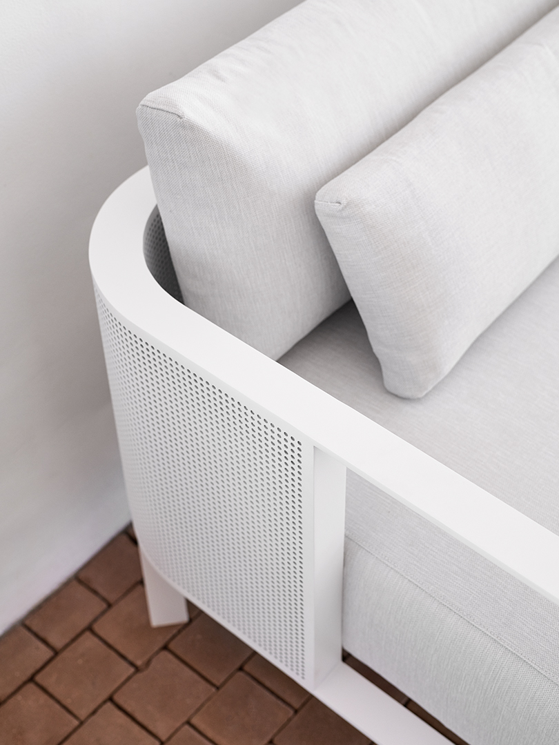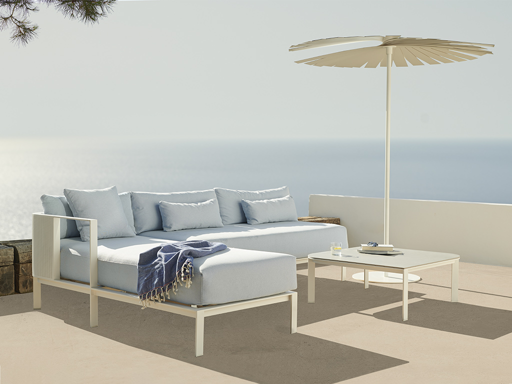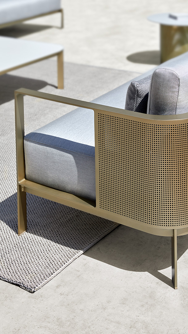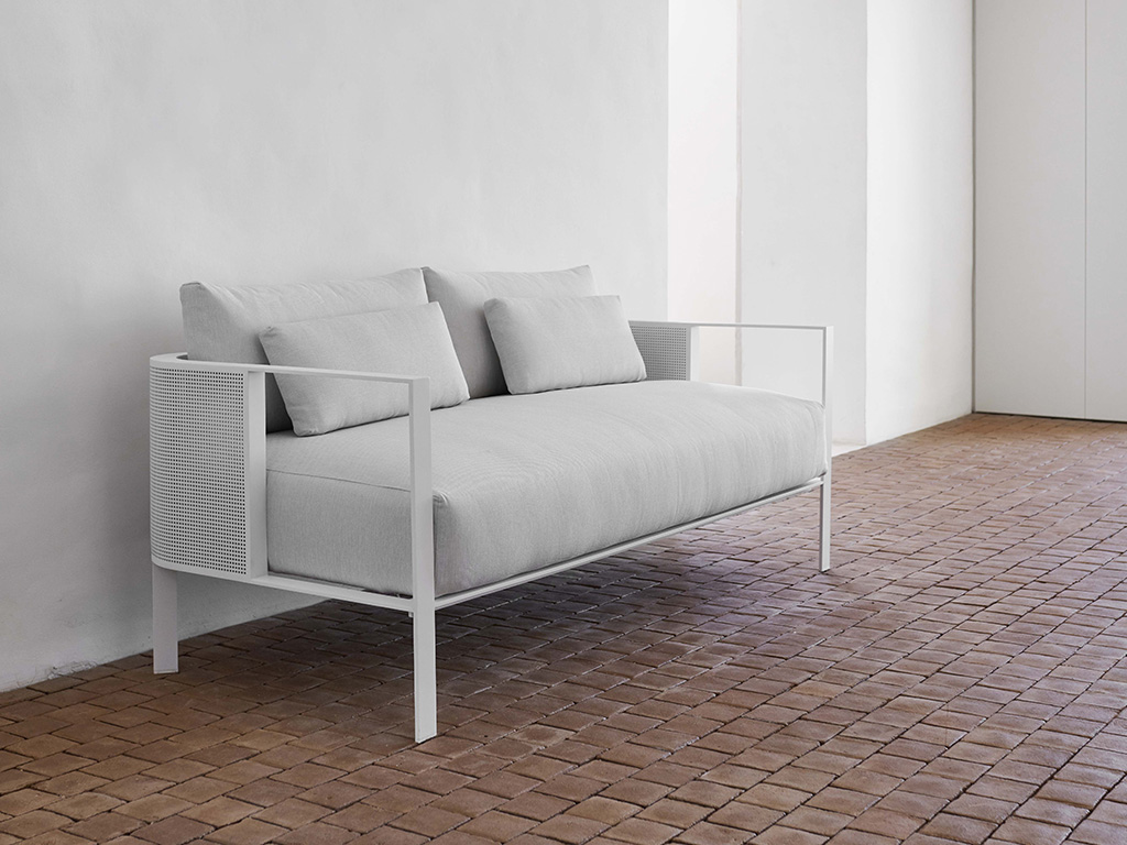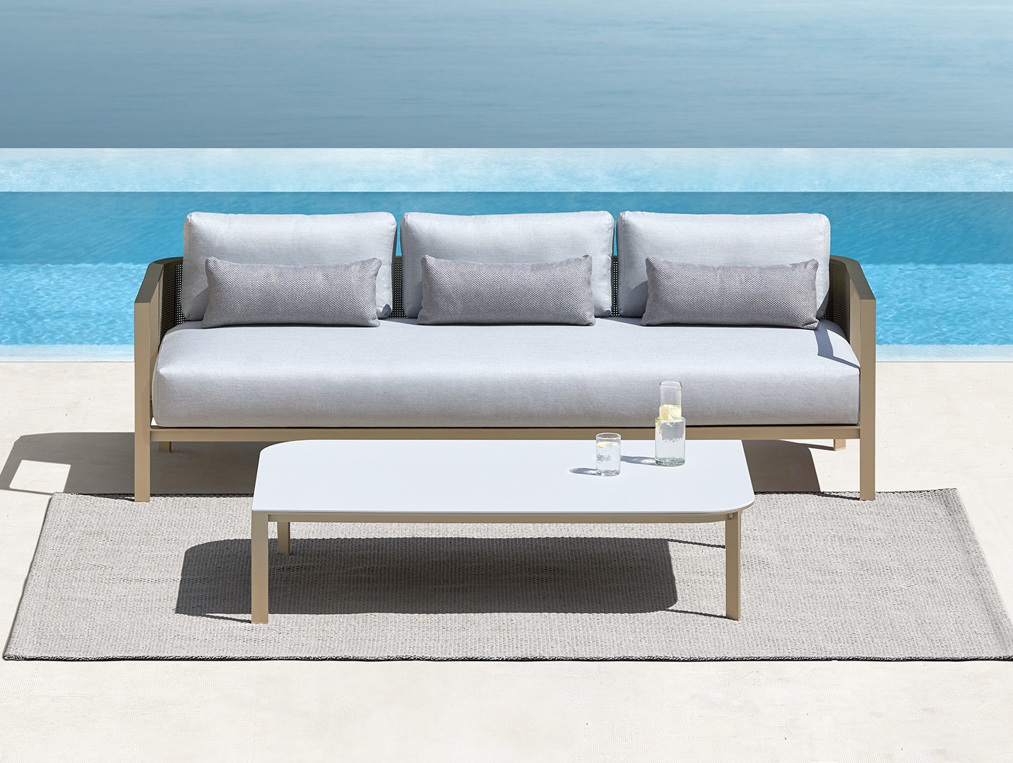Ο καναπές της συλλογής διατίθεται κατόπιν παραγγελίας σε διθέσιο και τριθέσιο, με σκελετό αλουμινίου σε 14 διαφορετικά φινιρίσματα και μαξιλάρια καθίσματος/πλάτης σε ποικιλία outdoor υδατοαπωθητικών υφασμάτων.