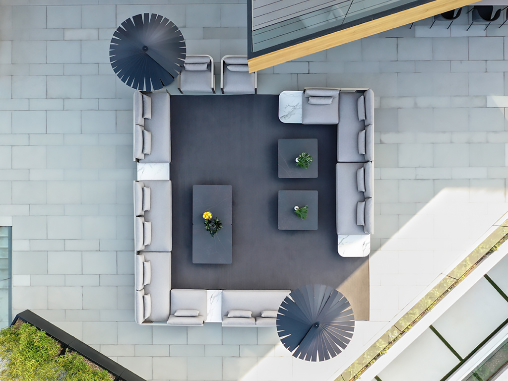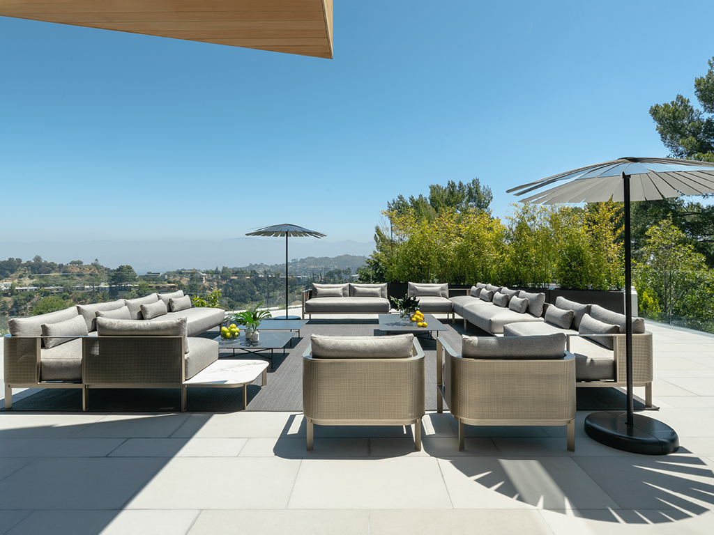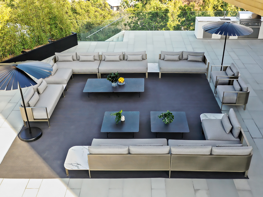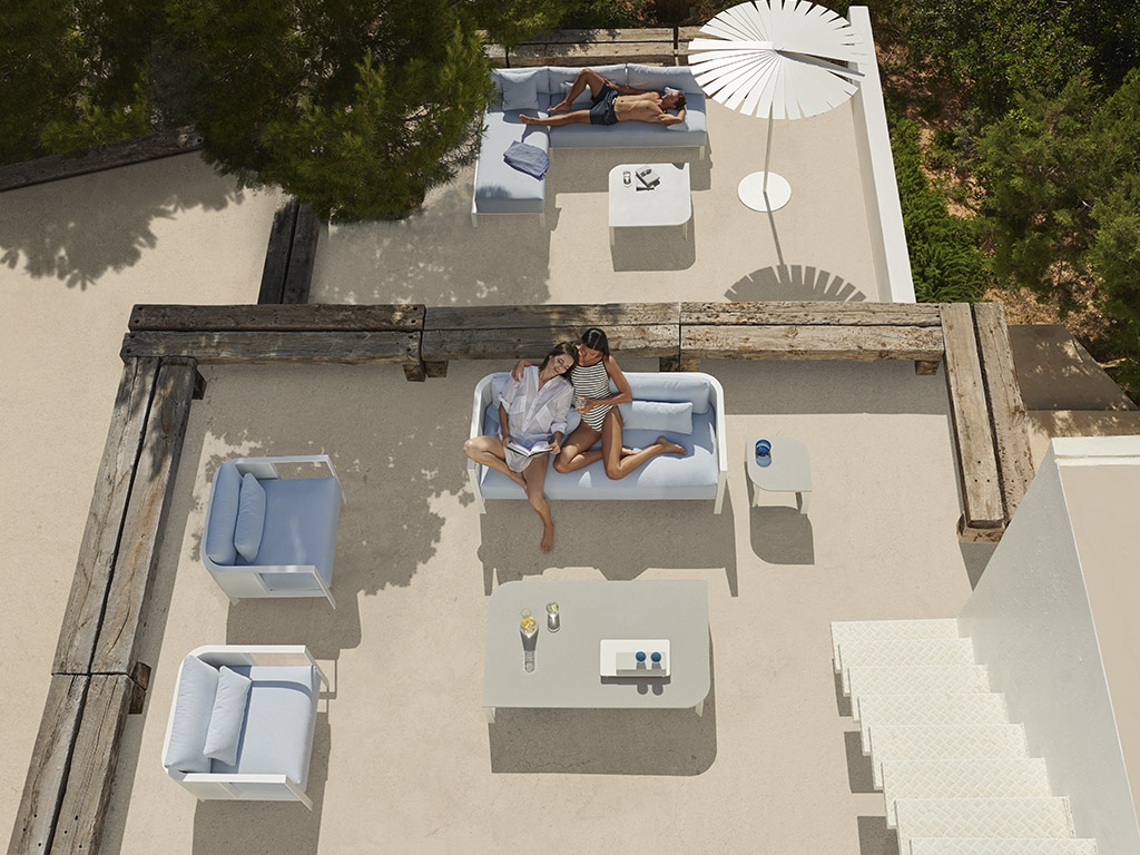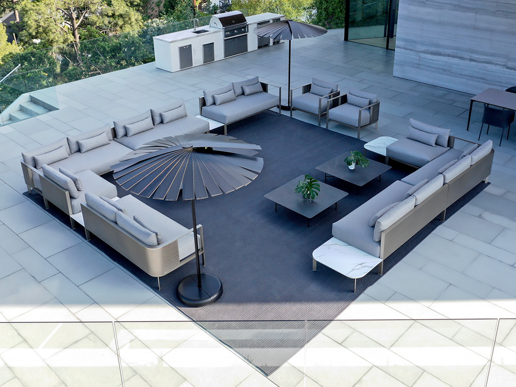 Ο καναπές της συλλογής διατίθεται κατόπιν παραγγελίας σε διθέσιο και τριθέσιο, με σκελετό αλουμινίου σε 14 διαφορετικά φινιρίσματα και μαξιλάρια καθίσματος/πλάτης σε ποικιλία outdoor υδατοαπωθητικών υφασμάτων.