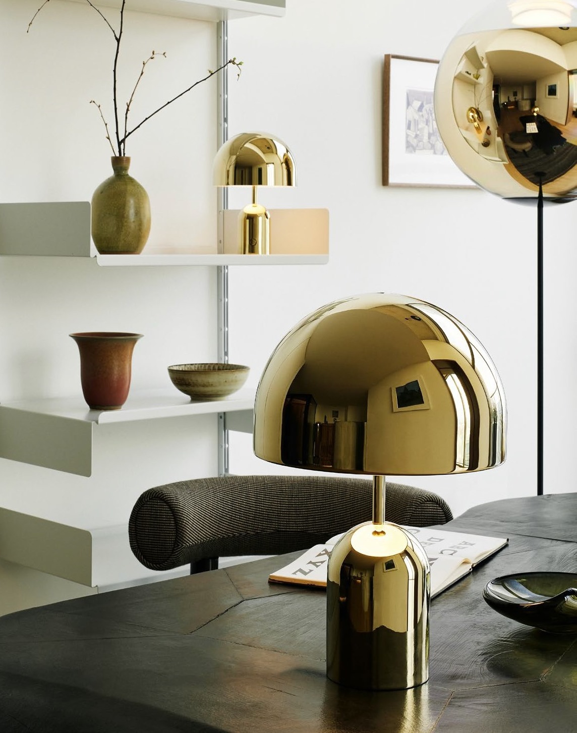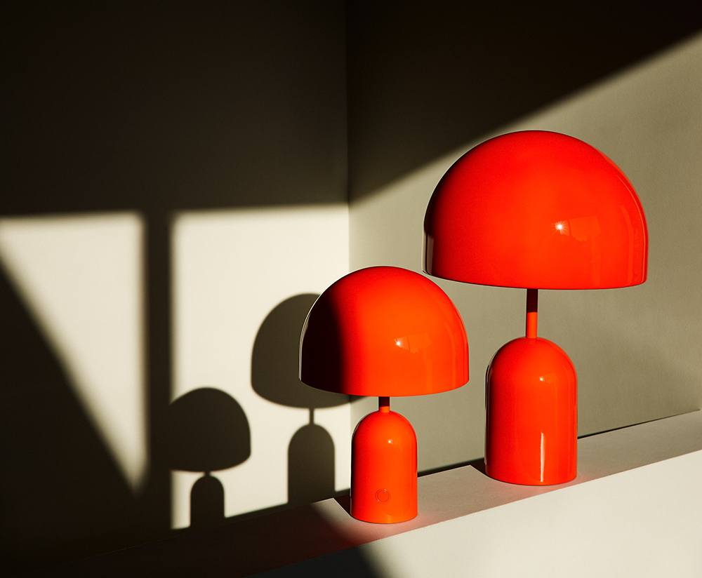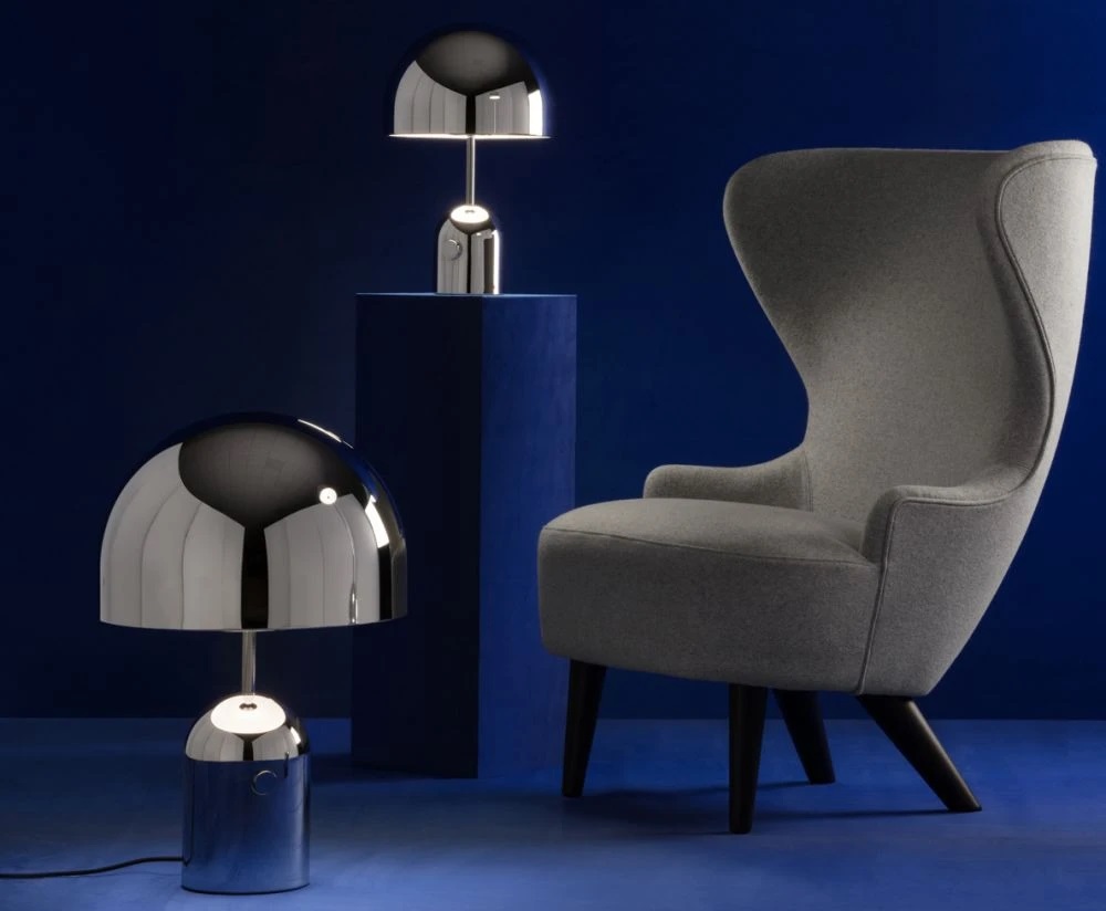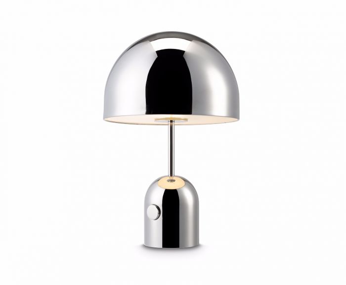 Η γυαλιστερή επιφάνεια του επιτραπέζιου φωτιστικού Bell Medium, αντικατοπτρίζει τα χαρακτηριστικά και τα χρώματα του περιβάλλοντός του. Είναι εξοπλισμένο με ενσωματωμένο, ομαλό dimmer και έχει σταθμισμένη βάση για πρόσθετη σταθερότητα.