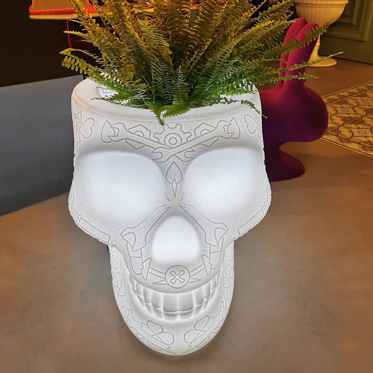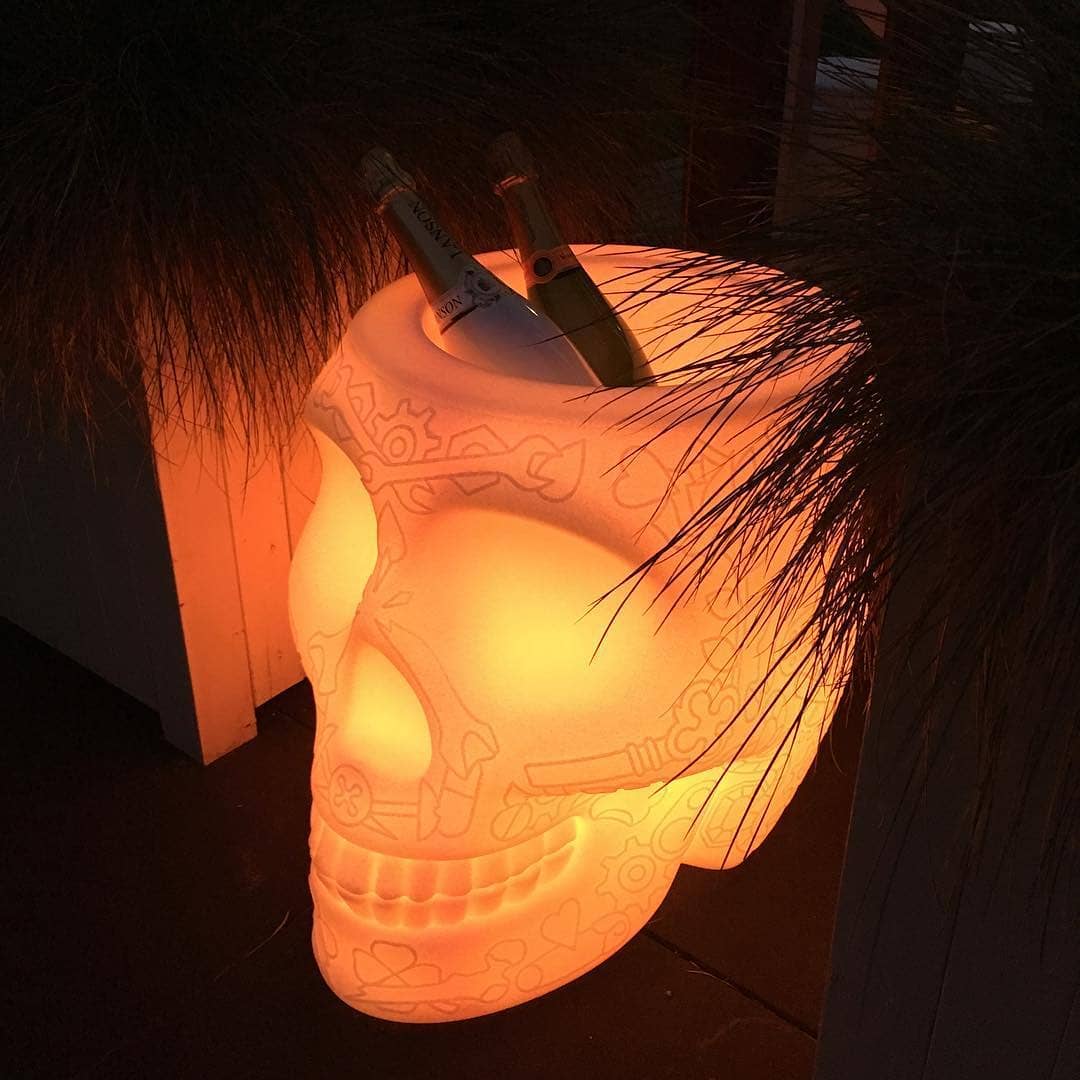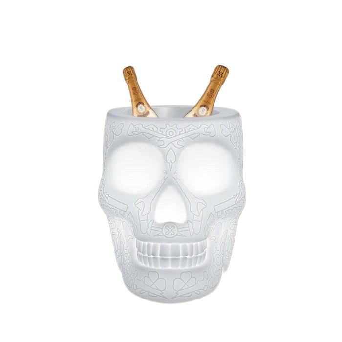 Διακοσμημένο με το γραφικό μοτίβο του κρανίου του Μεξικού, ένα σύμβολο που δημιουργήθηκε για να εξορκίσει το θάνατο και να γιορτάσει τη ζωή, γίνεται ένα ειρωνικό κασπό για φυτά και λουλούδια ή σαμπανιέρα.