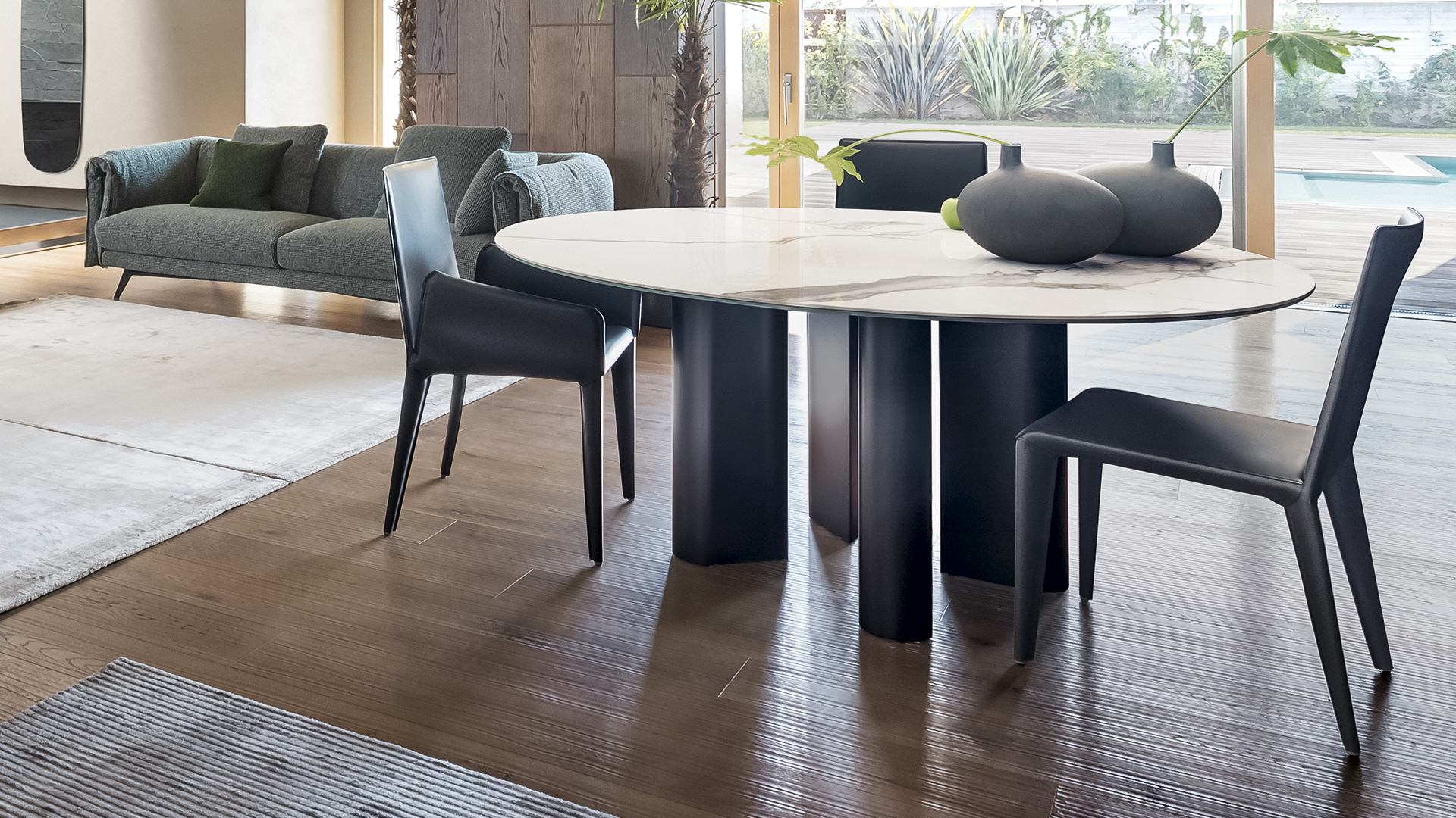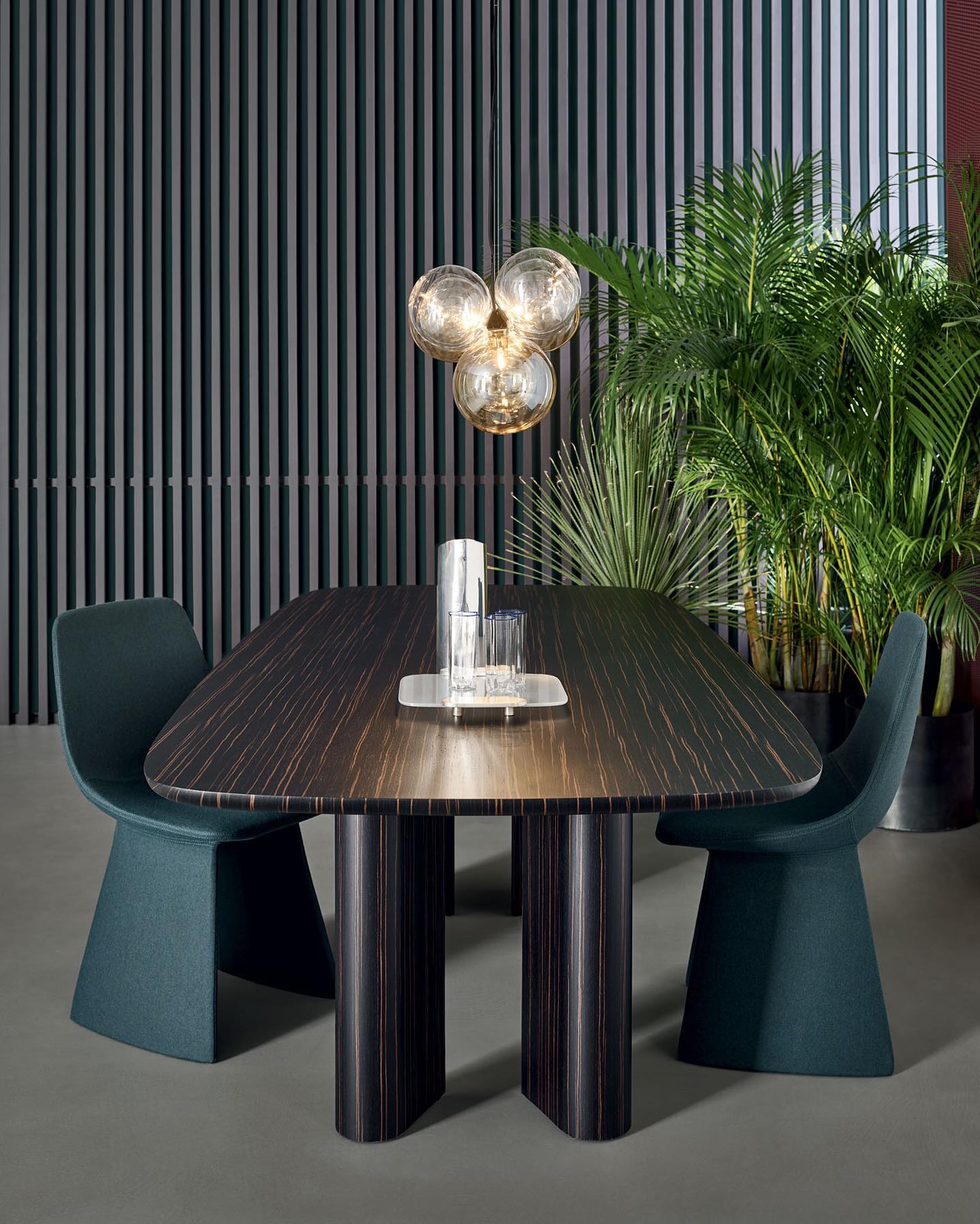 Το τραπέζι Geometric αλλάζει σχήμα και δημιουργεί ένα παιχνίδι με την προοπτική: τα πόδια σε σχήμα σταγόνας, εμφανίζονται είτε παχιά είτε αιχμηρά και λεπτά, για να προσφέρουν μια διαφορετική αντίληψη του οπτικού βάρους τους καθώς κινείστε μέσα στο χώρο, ένα υπνωτικό αποτέλεσμα για ένα σαλόνι με εκπληκτική προσωπικότητα.