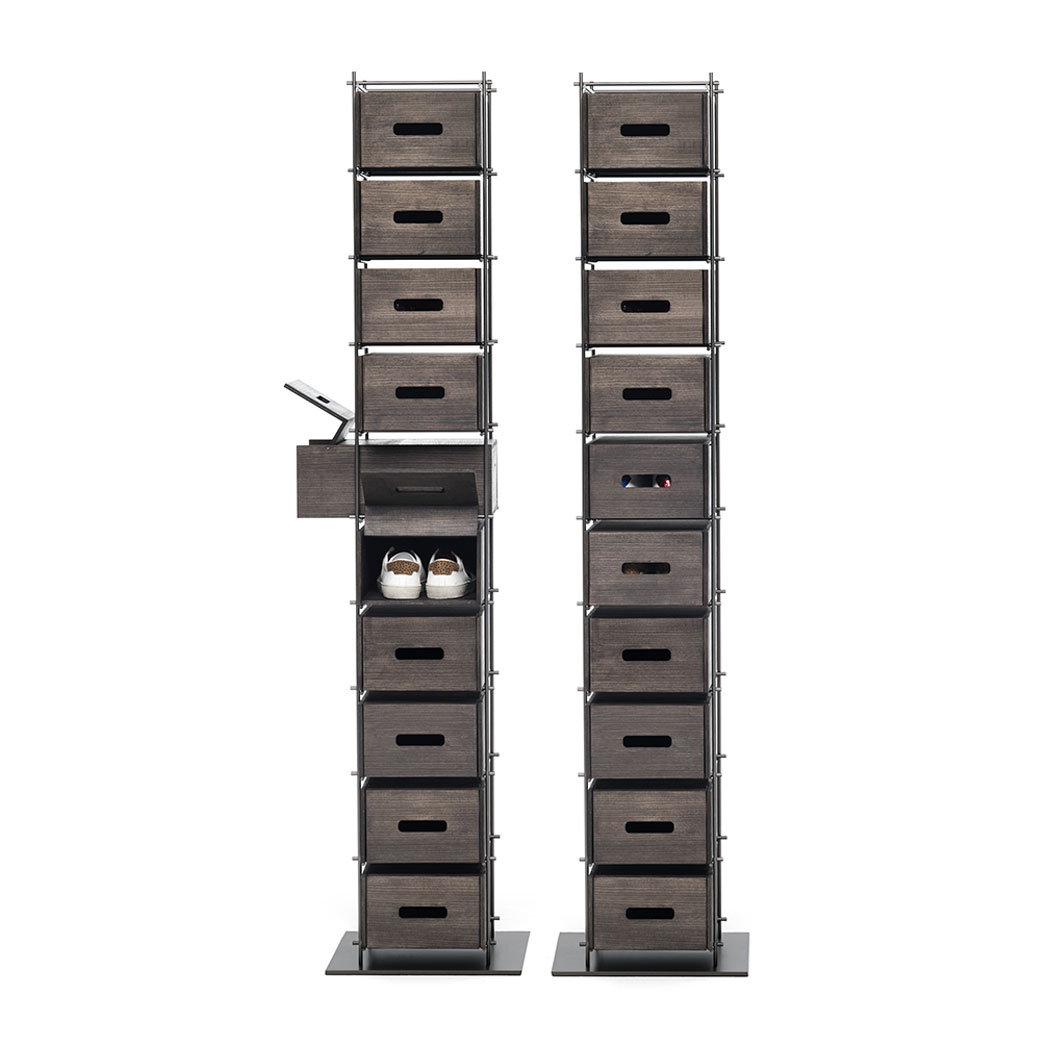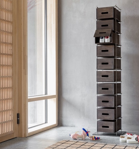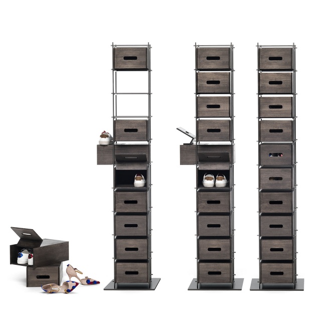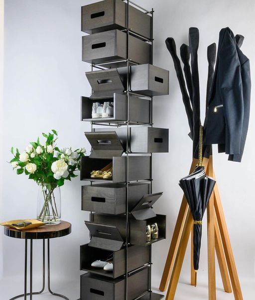 Ο σχεδιαστής Idelfonso Colombo δημιούργησε την παπουτσοθήκη Manolo, θέλοντας να αναβαθμίσει ένα προϊόν που πάντα θεωρείται δευτερεύον και φτωχό. Μια νέα ιδέα, κομψή και λειτουργική, μια μοναδική παπουτσοθήκη που δεν πρέπει να κρύβεται αλλά να εκτίθεται στο σπίτι. Διαθέτει μεταλλικό σκελετό και μονάδες αποθήκευσης από μασίφ ξύλο φλαμουριάς βαμμένο μόκα.