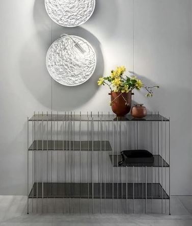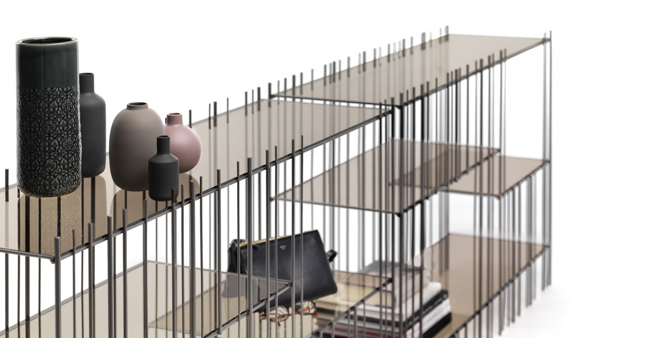 Η Metrica είναι μια μεταλλική κονσόλα που διατίθεται σε 3 διαφορετικά φινιρίσματα, τιτάνιο, burnished ή χρυσό, με διαφανή γυάλινα ράφια σε χάλκινη ή πράσινη απόχρωση. Ο σκελετός είναι απλός και χαρακτηρίζεται από τις σιδερένιες ράβδους στερεωμένες σε διαφορετικά διαστήματα σε μια ανοιχτή, αυστηρή δομή μέσα στην οποία τα αντικείμενα που εισάγονται συμπληρώνουν το σχήμα.