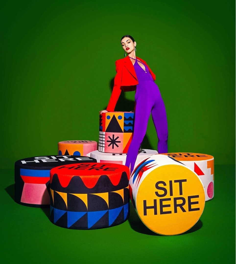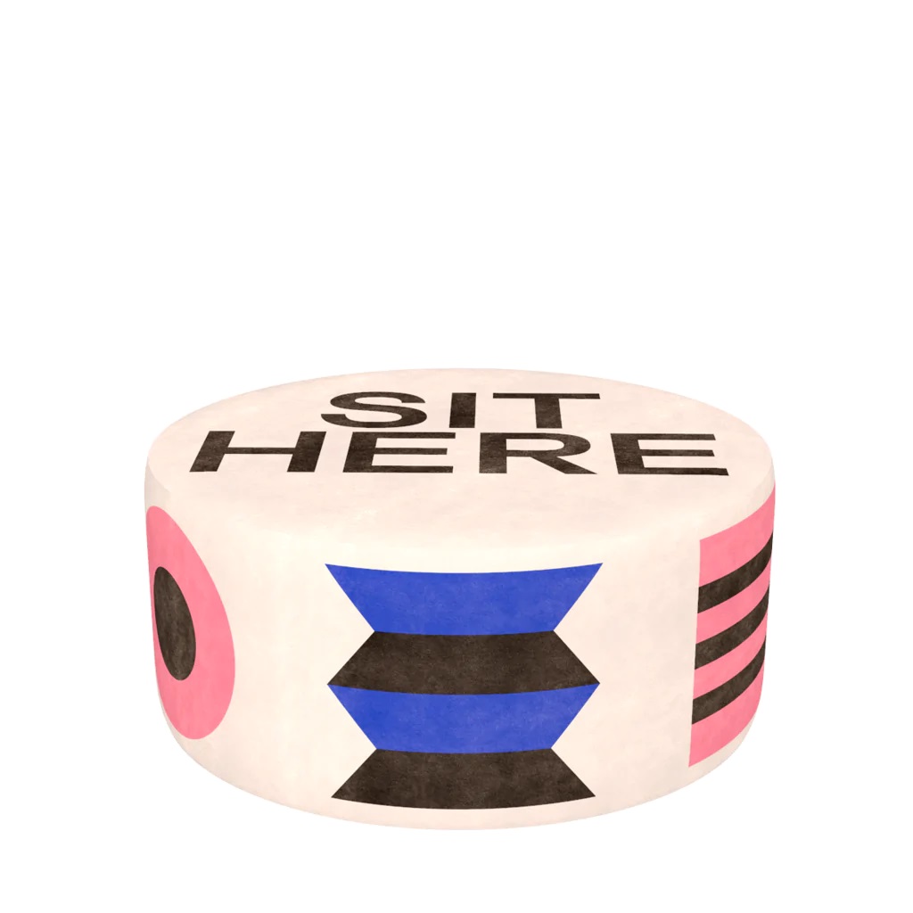 Συλλογή πουφ, σχεδιασμένα από τον Marco Oggian, που χαρακτηρίζονται από παιχνιδιάρικα μοτίβα και έντονα χρώματα. Επάνω στο κάθισμα θα βρείτε την επιγραφή «ΚΑΘΙΣΤΕ ΕΔΩ» που σας ενθαρρύνει να τα δοκιμάσετε και να απολαύσετε την άνεσή τους.