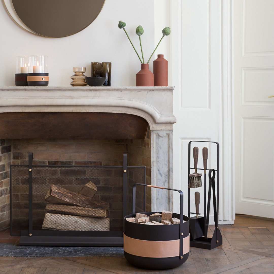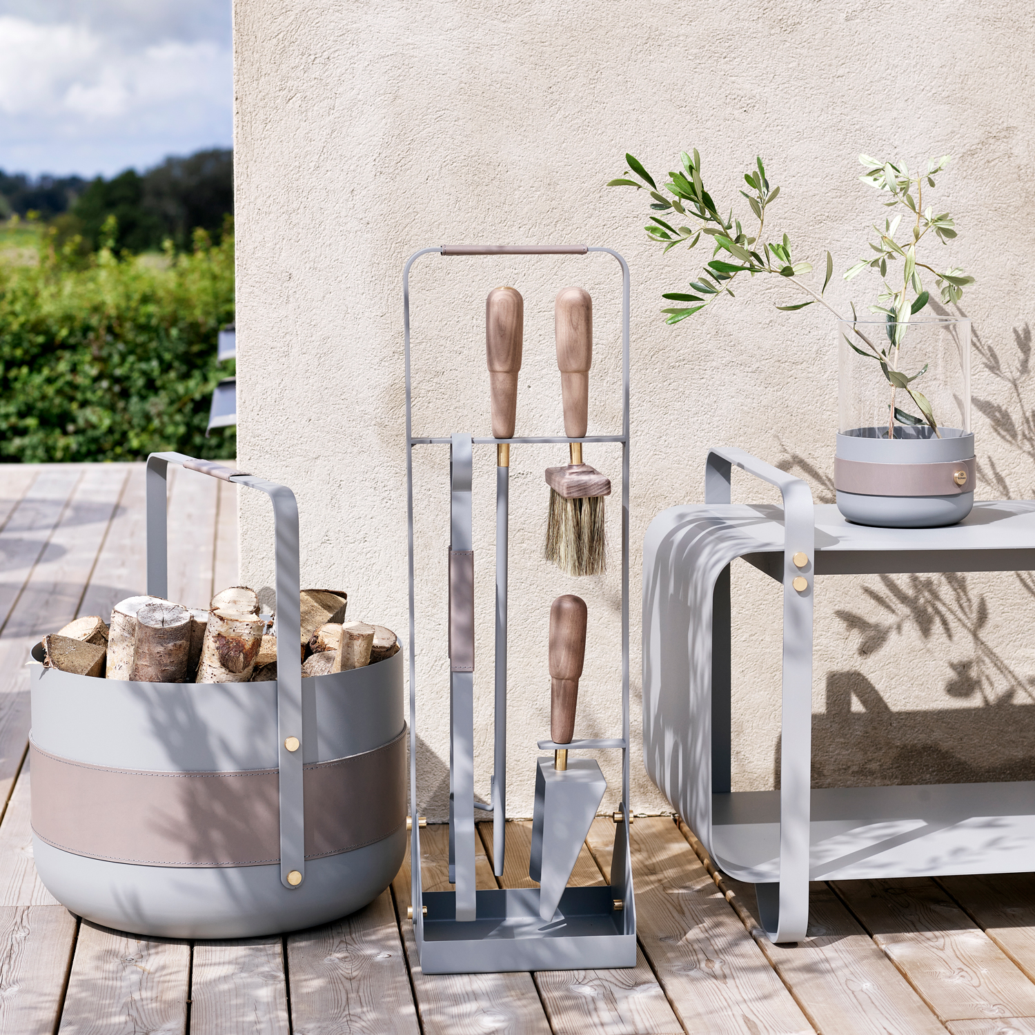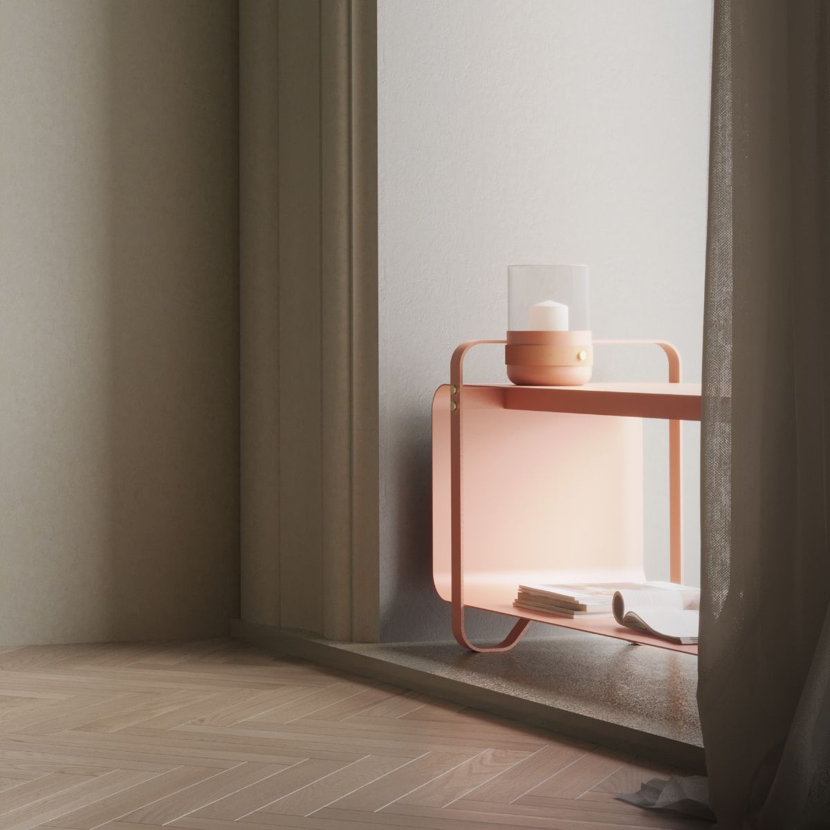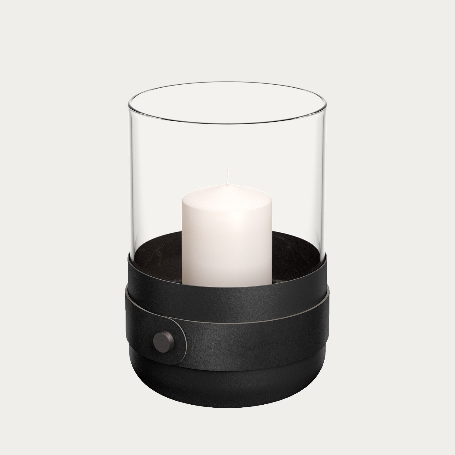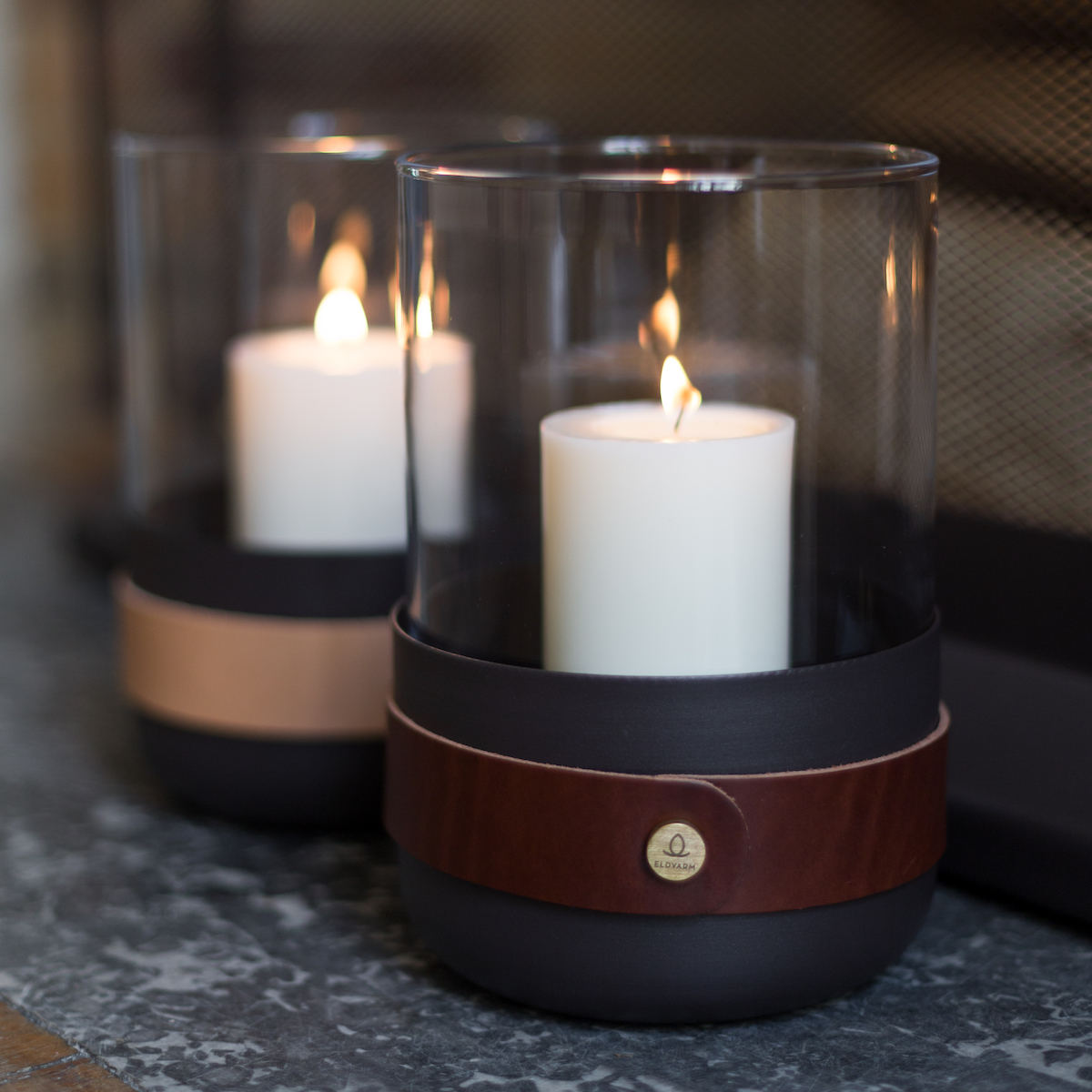 Βάση από ατσάλι με επίστρωση πούδρας, δέρμα, φυσητό γυαλί και λεπτομέρειες από μασίφ ορείχαλκο.