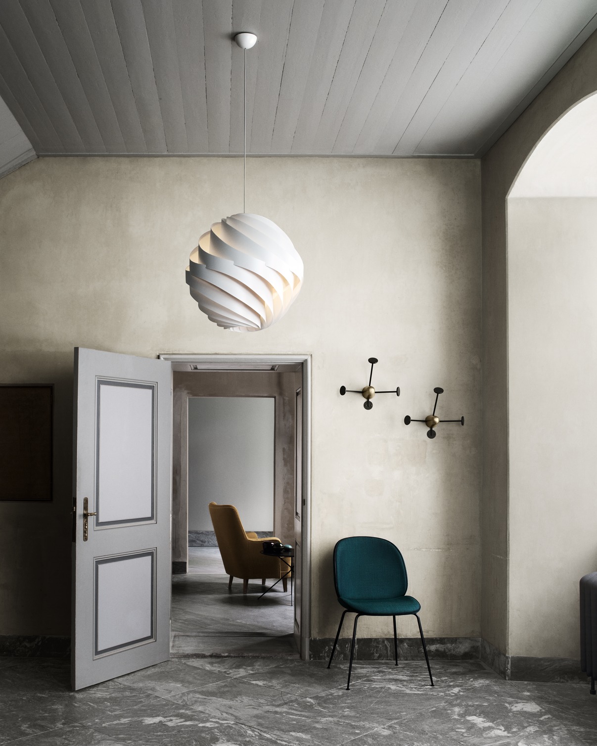 Το κρεμαστό φωτιστικό Turbo του Louis Weisdorf σχεδιάστηκε το 1965, αλλά τέθηκε για πρώτη φορά σε παραγωγή το 1967 σημειώνοντας μεγάλη επιτυχία όλα αυτά τα χρόνια. Το design στα καλύτερά του: είναι απλό στο σχήμα μορφή, αλλά πολύπλοκο στη δομή και συνδυάζει μια αίσθηση ευάερης δύναμης σε ένα όμορφο γλυπτικό σύνολο. Ο σχεδιαστής εμπνεύστηκε από την ελαφρότητα του ιαπωνικού ριζόχαρτου που μεταμορφώθηκε σε μια πιο ανθεκτική και στιβαρή έκδοση. Η εξωτερική καμπύλη του φωτιστικού αποτελείται από δώδεκα παρόμοια σπειροειδή ελάσματα από αλάβαστρο, που σχηματίζουν μια σφαίρα σαν λουλούδι που προστατεύει το φως. Το Turbo είναι ένα τέλειο παράδειγμα του πάθους του Weisdorf για πολλαπλά επαναλαμβανόμενα στοιχεία που χρησιμοποίησε στα περισσότερα έργα του.