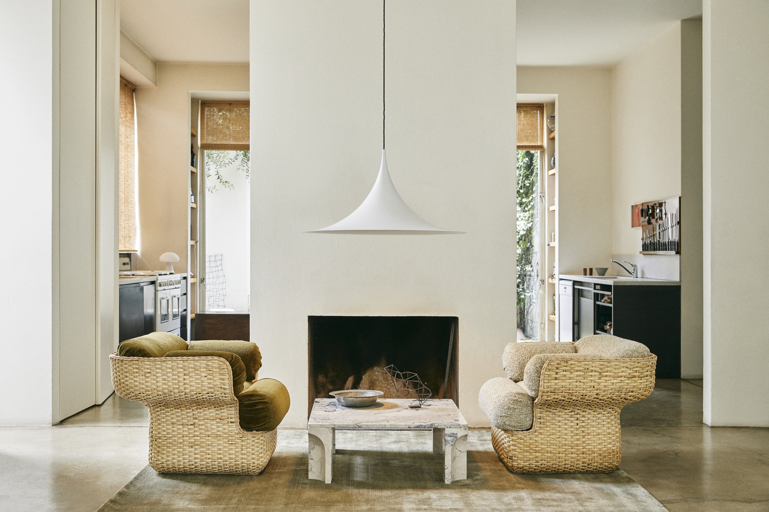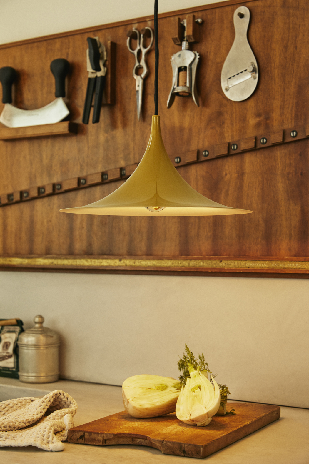 Ένα εμβληματικό φωτιστικό του δανέζικου design, το Semi Pendant κατασκευάστηκε για πρώτη φορά το 1968 από τους Claus Bonderup και Torsten Thorup και ήταν ένα από τα πιο περιζήτητα φωτιστικά κατά τις δεκαετίες του 1970 και του 1980, κερδίζοντας παγκόσμια αναγνώριση και iconic status. Αντιδρώντας στα απαλά οργανικά σχήματα, τη λεγόμενη cozy εποχή, που κυριαρχούσαν στη Δανία εκείνη την εποχή, οι Bonderup και Thorup θέλησαν να δημιουργήσουν ένα φωτιστικό που να ενσωματώνει αιχμηρές, καθαρές γραμμές και γεωμετρικό σχήμα. Το σχέδιό τους υποβλήθηκε σε διαγωνισμό στη Βασιλική Ακαδημία Καλών Τεχνών της Δανίας Σχολή Αρχιτεκτονικής και κέρδισε το πρώτο βραβείο. Με το μοναδικό διαχρονικό σχεδιασμό και τη ποικιλία χρωμάτων και μεγεθών, το Semi Pendant είναι εξαιρετικά ευέλικτο και ταιριάζει τόσο σε οικιακούς όσο και σε επαγγελματικούς χώρους.