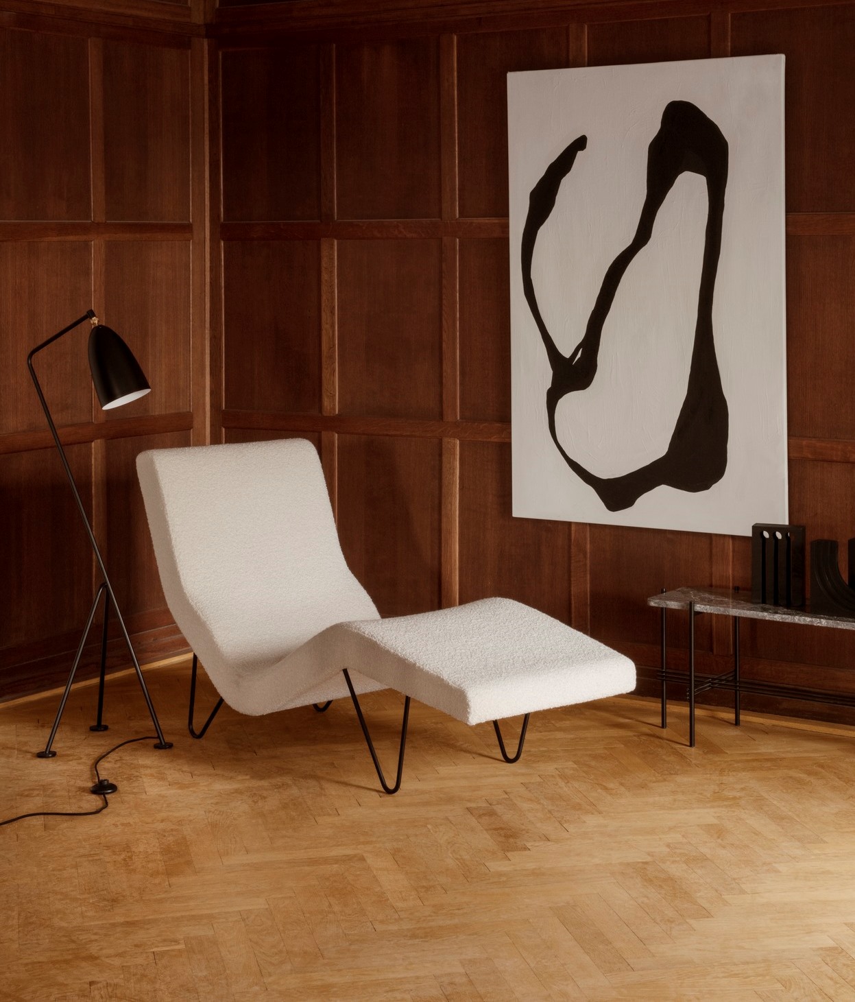 Η GMG Chaise Longue σχεδιάστηκε το 1951 από την Greta M. Grossman με παιχνιδιάρικη κομψότητα. Με σχήμα σχεδιασμένο για χαλάρωση, αντικατοπτρίζει τις φυσικές καμπύλες του σώματος ενώ μοιάζει να επιπλέει πάνω από τα διακριτικά λεπτά πόδια της – μια γνήσια υπογραφή της δουλειάς της Greta M. Grossman. Η GMG Chaise Longue συνδυάζει λειτουργικότητα και άνεση, με μια ντελικάτη και ισχυρή σχεδιαστική γλώσσα που αποκαλύπτει μοναδικές, ελαφριές και εμβληματικές πινελιές, αντιπροσωπεύοντας την ένωση του ευρωπαϊκού design και του καλιφορνέζικου μοντερνισμού.