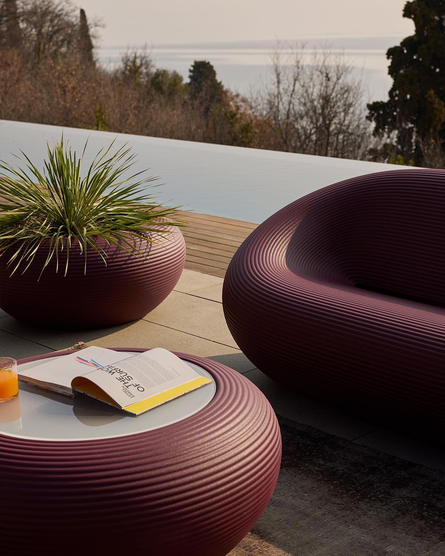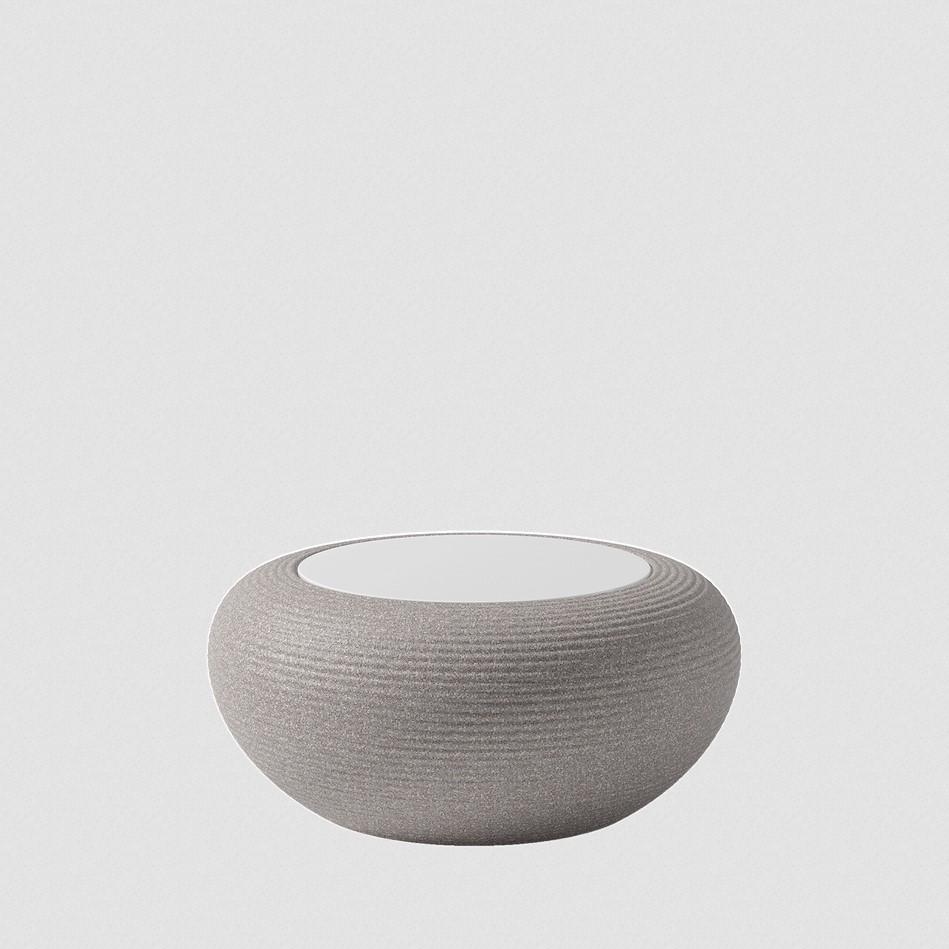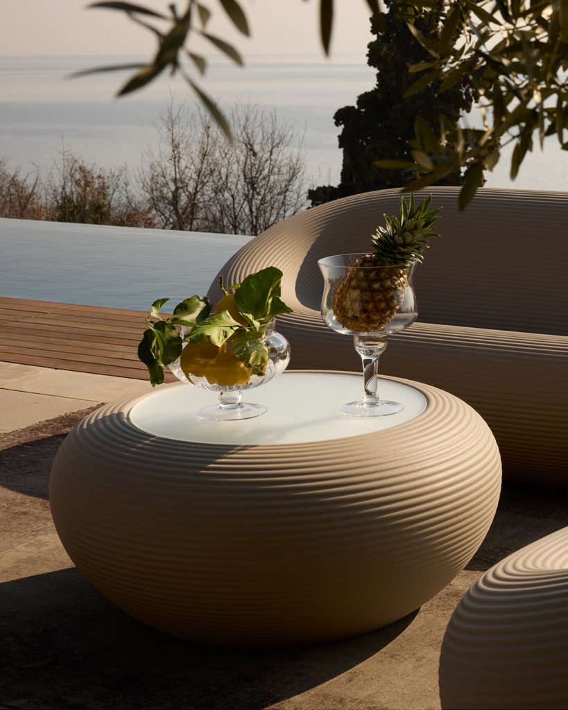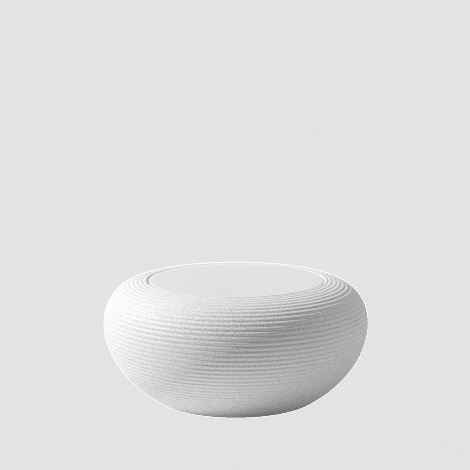 Το coffee table Nami χαρακτηρίζεται από ένα στρογγυλό σώμα από ανακυκλώσιμο πολυαιθυλένιο και βαμμένο λευκό γυαλί στην επιφάνεια.