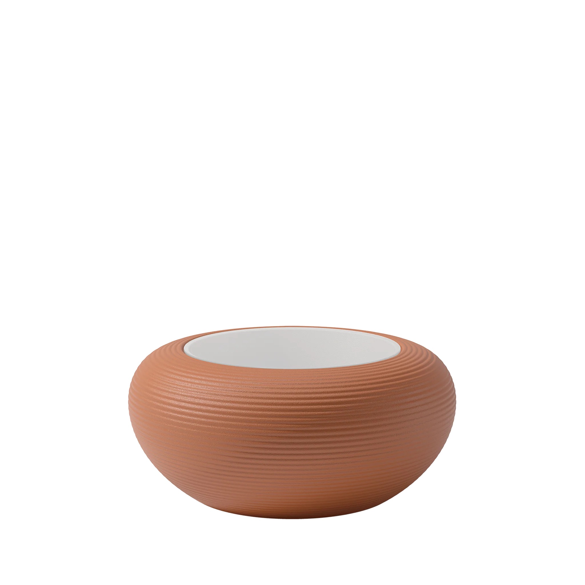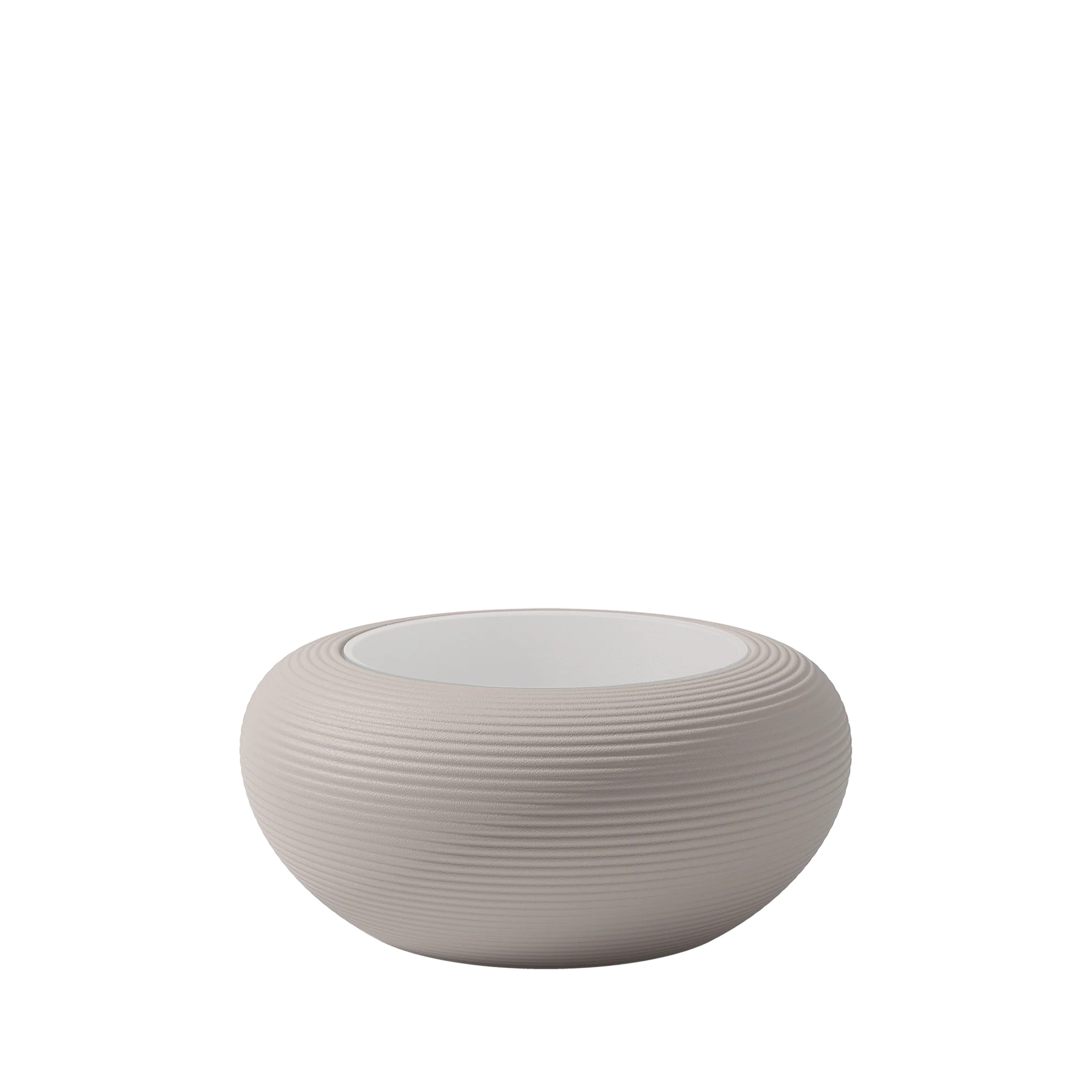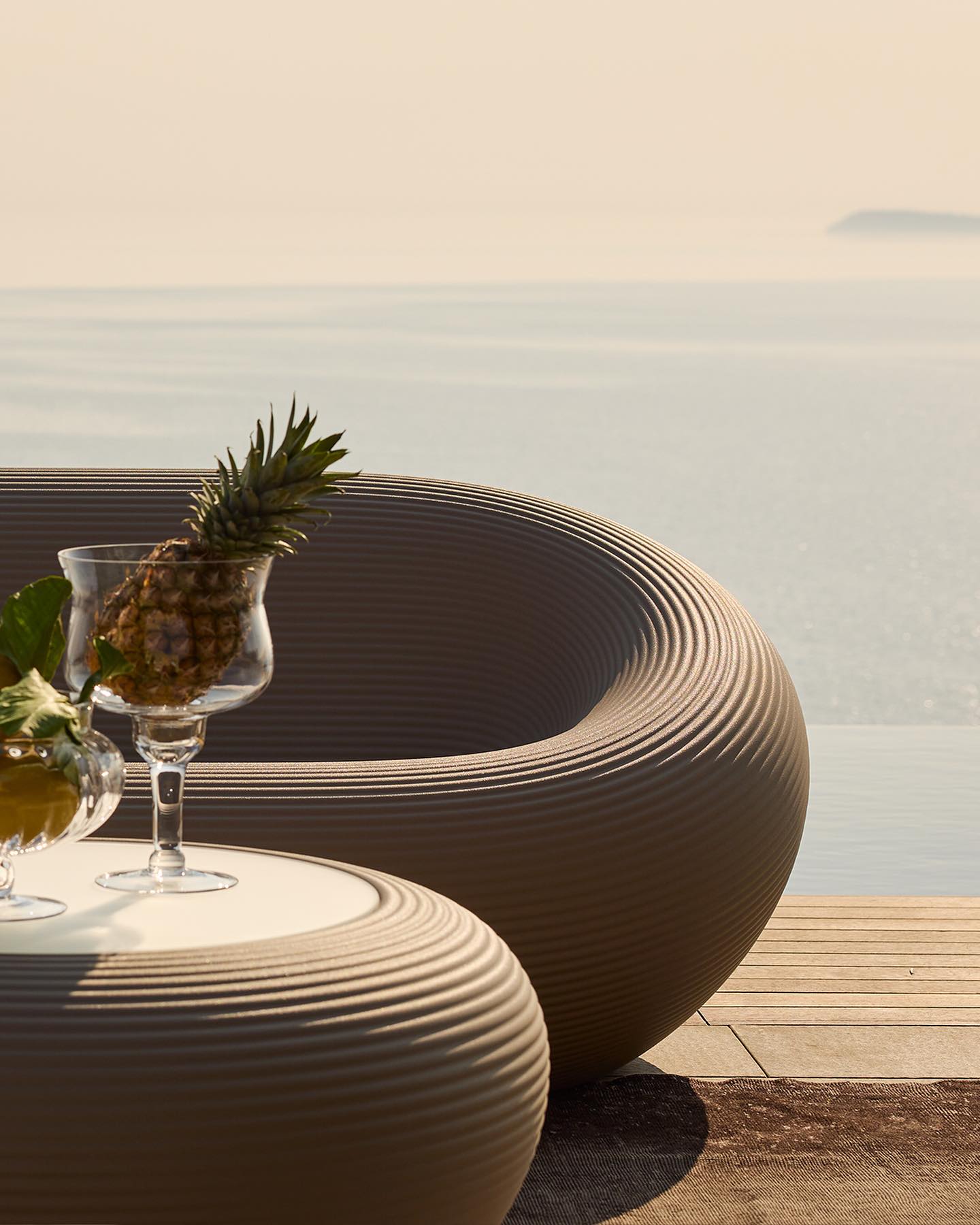 Το coffee table Nami χαρακτηρίζεται από ένα στρογγυλό σώμα από ανακυκλώσιμο πολυαιθυλένιο και βαμμένο λευκό γυαλί στην επιφάνεια.