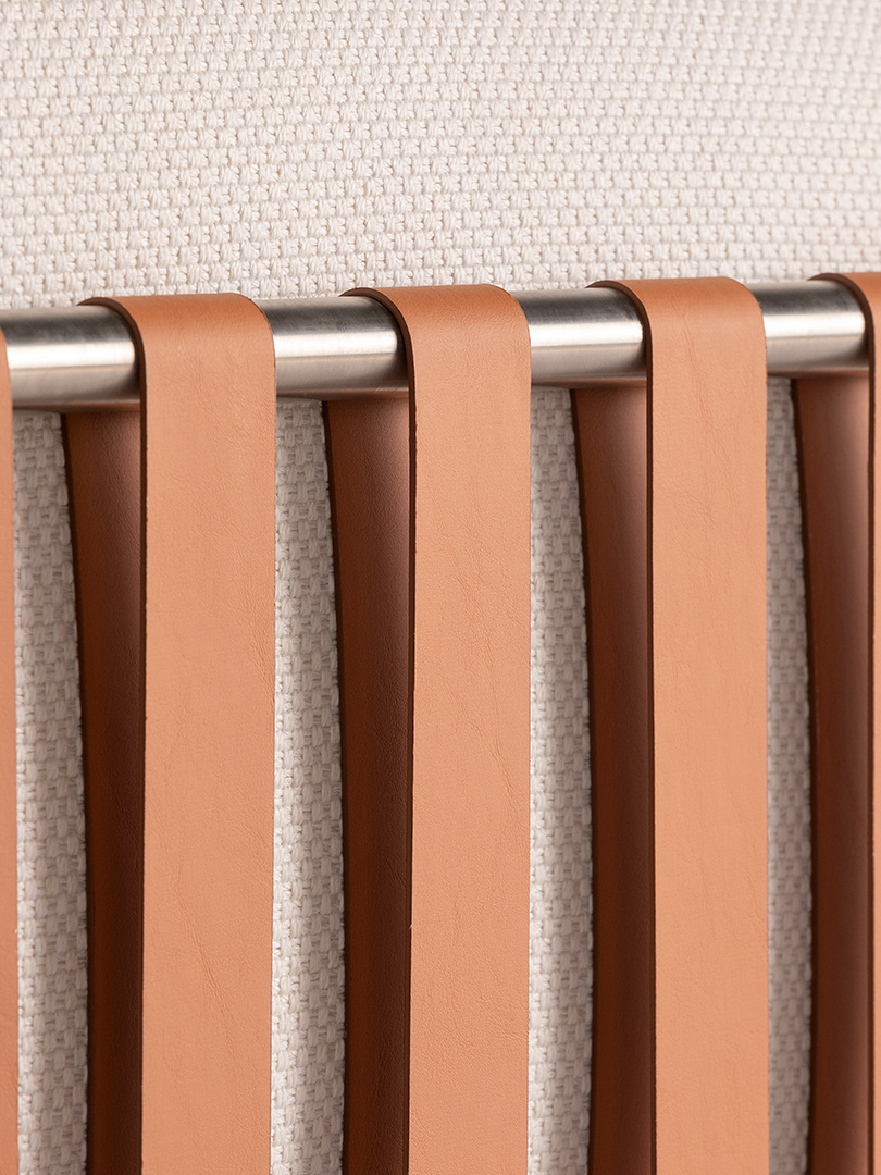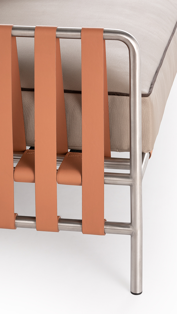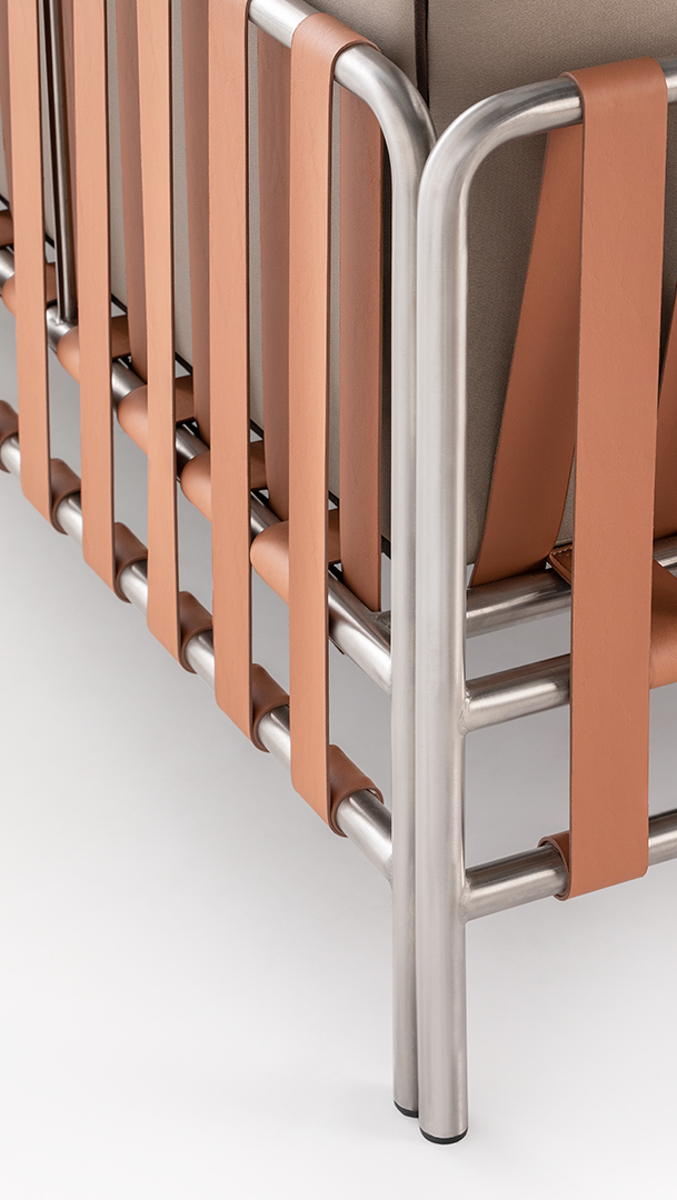 Σχεδιασμένη από τον Francesco Meda και τον David Quincoces, η συλλογή Onsen είναι εμπνευσμένη από την ηρεμία και την ακινησία που χαρακτηρίζει την ιαπωνική αρχιτεκτονική. Η φροντίδα στην επιλογή και την επεξεργασία των υλικών, την καθιστούν μια εμβληματική συλλογή με καθαρές και εκλεπτυσμένες γραμμές. Ο σκελετός είναι κατασκευασμένος από φυσικό ανοξείδωτο χάλυβα, χωρίς καμία πρόσθετη επεξεργασία. Οι ιμάντες που συνδέουν τους βραχίονες, την πλάτη και το κάθισμά, είναι κατασκευασμένα από υλικό βινυλίου που μοιάζει με δέρμα, αλλά είναι πιο ανθεκτικό και προσδίδει εξαιρετική λειτουργικότητα.